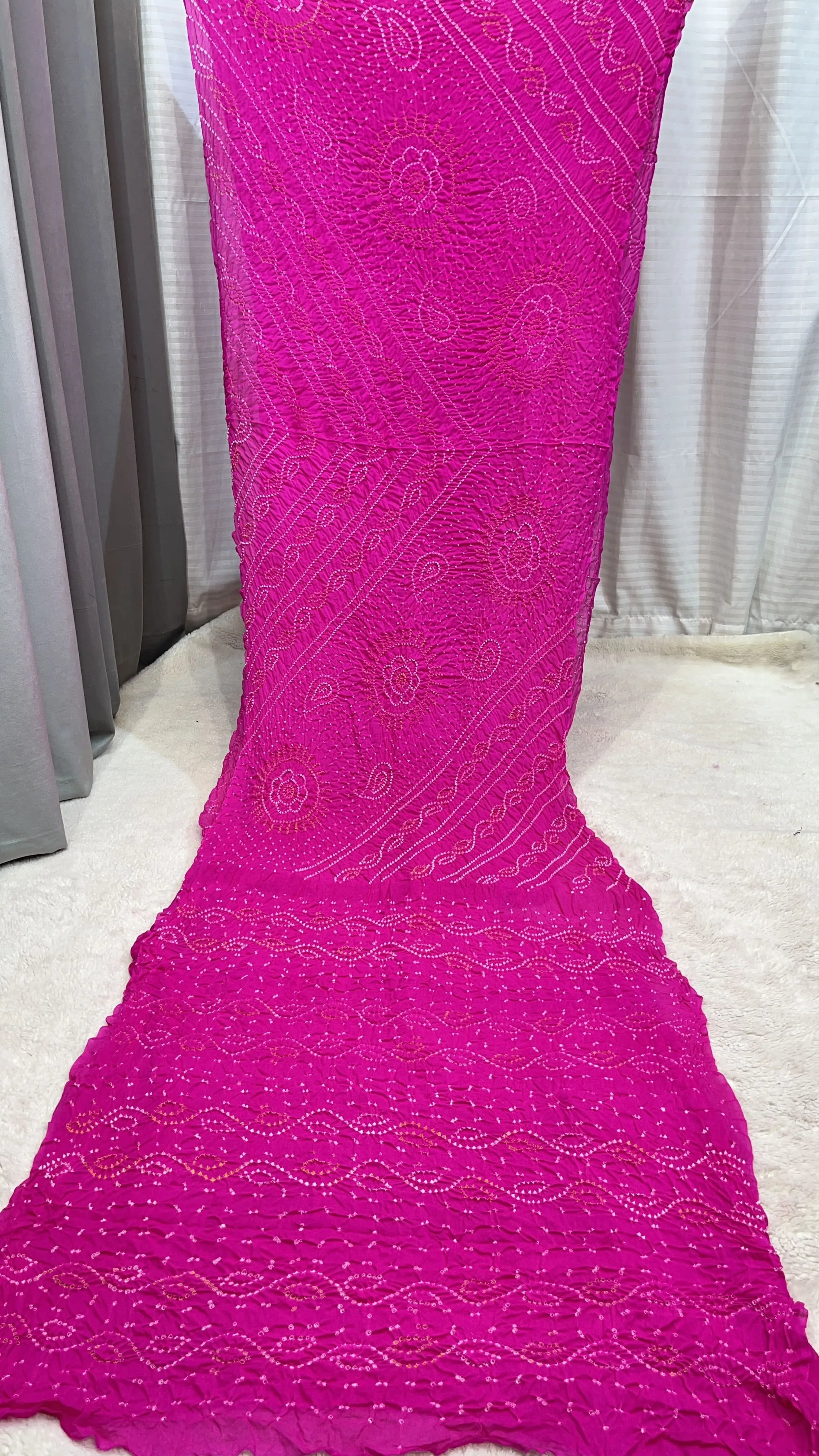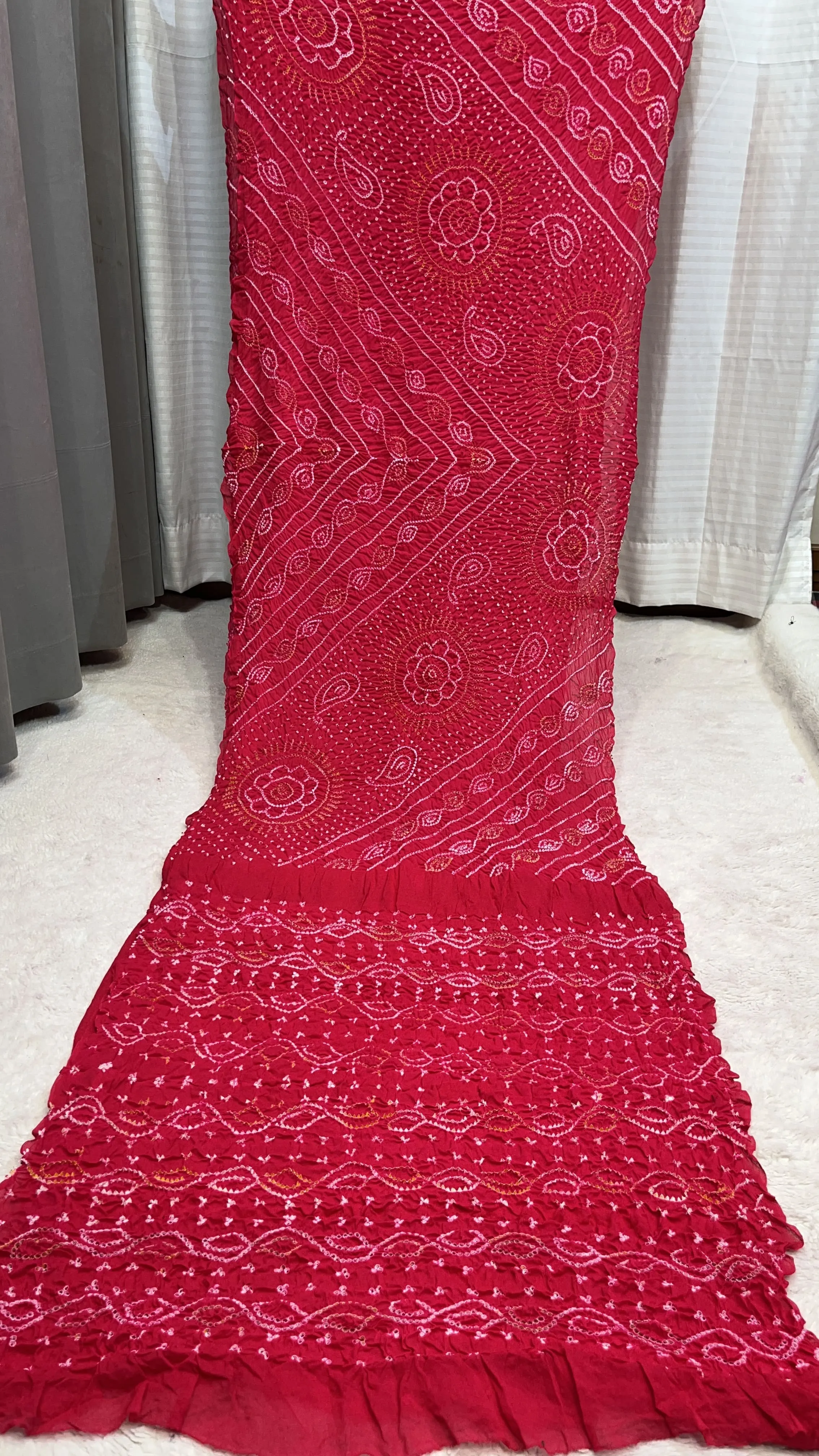 Experience timeless elegance with this classic hand Bandhej Ojariya saree crafted in pure Ojariya crepe fabric. Lightweight and graceful, it’s perfect for festive wear, traditional events, and cultural celebrations.