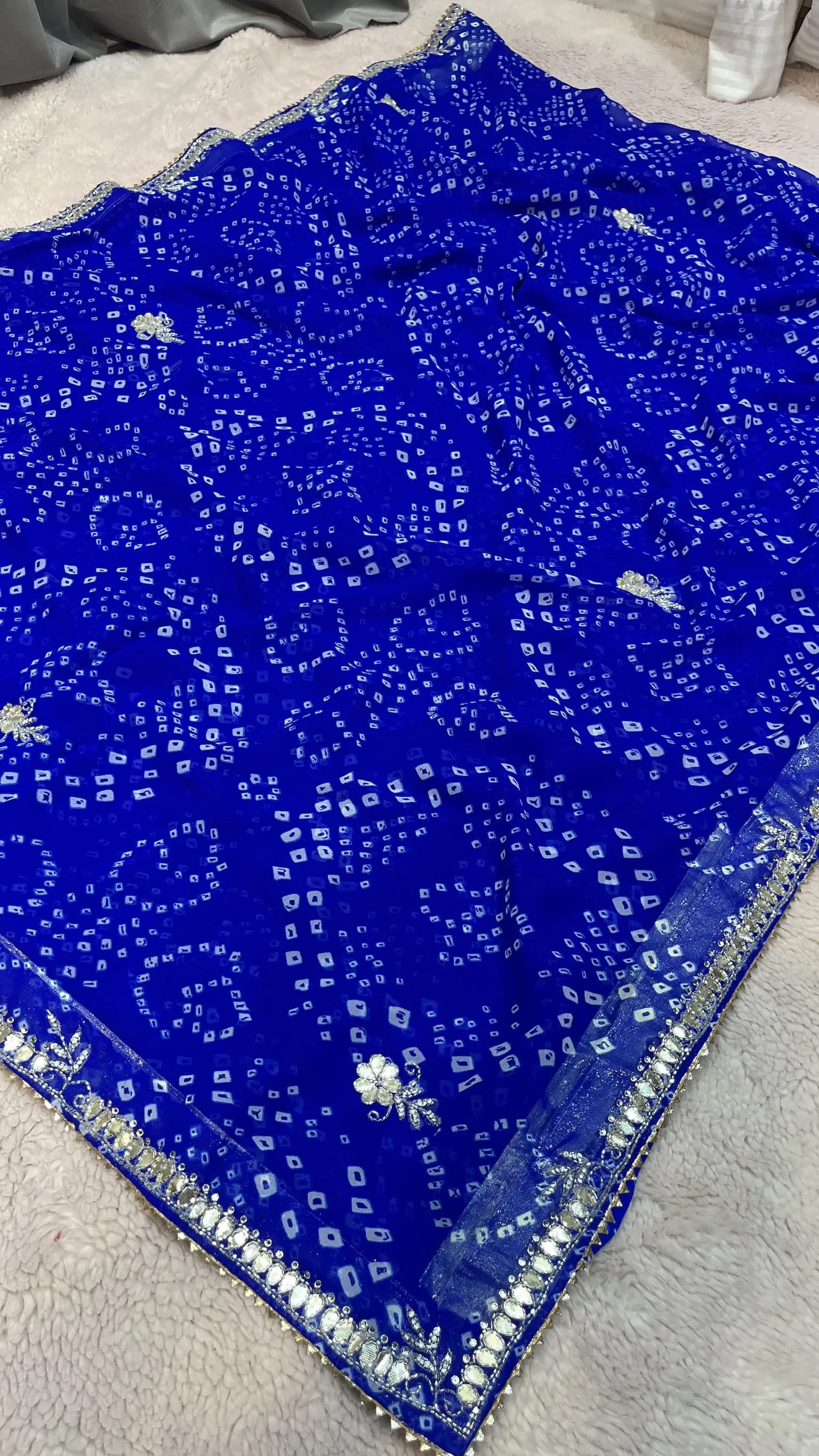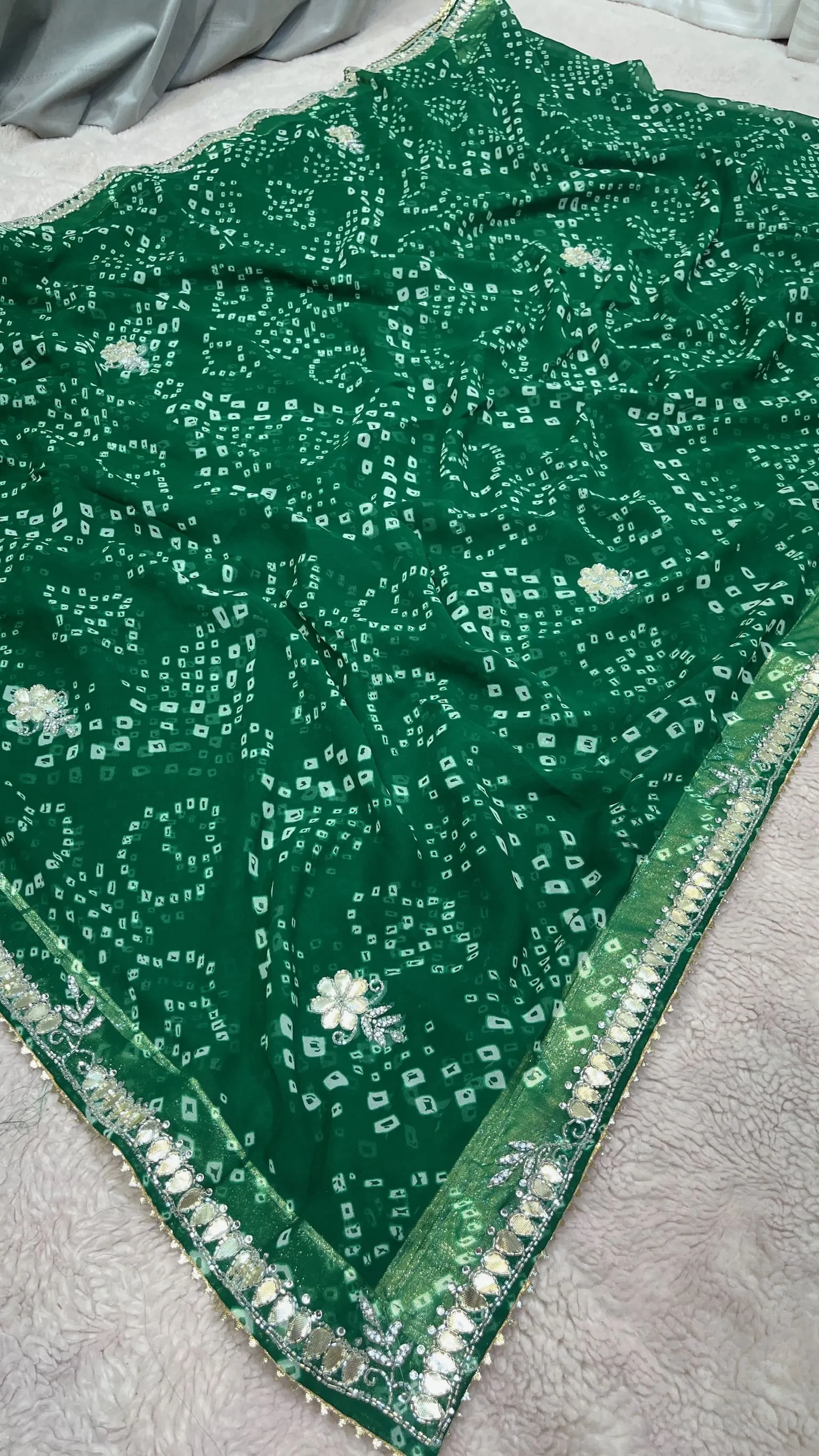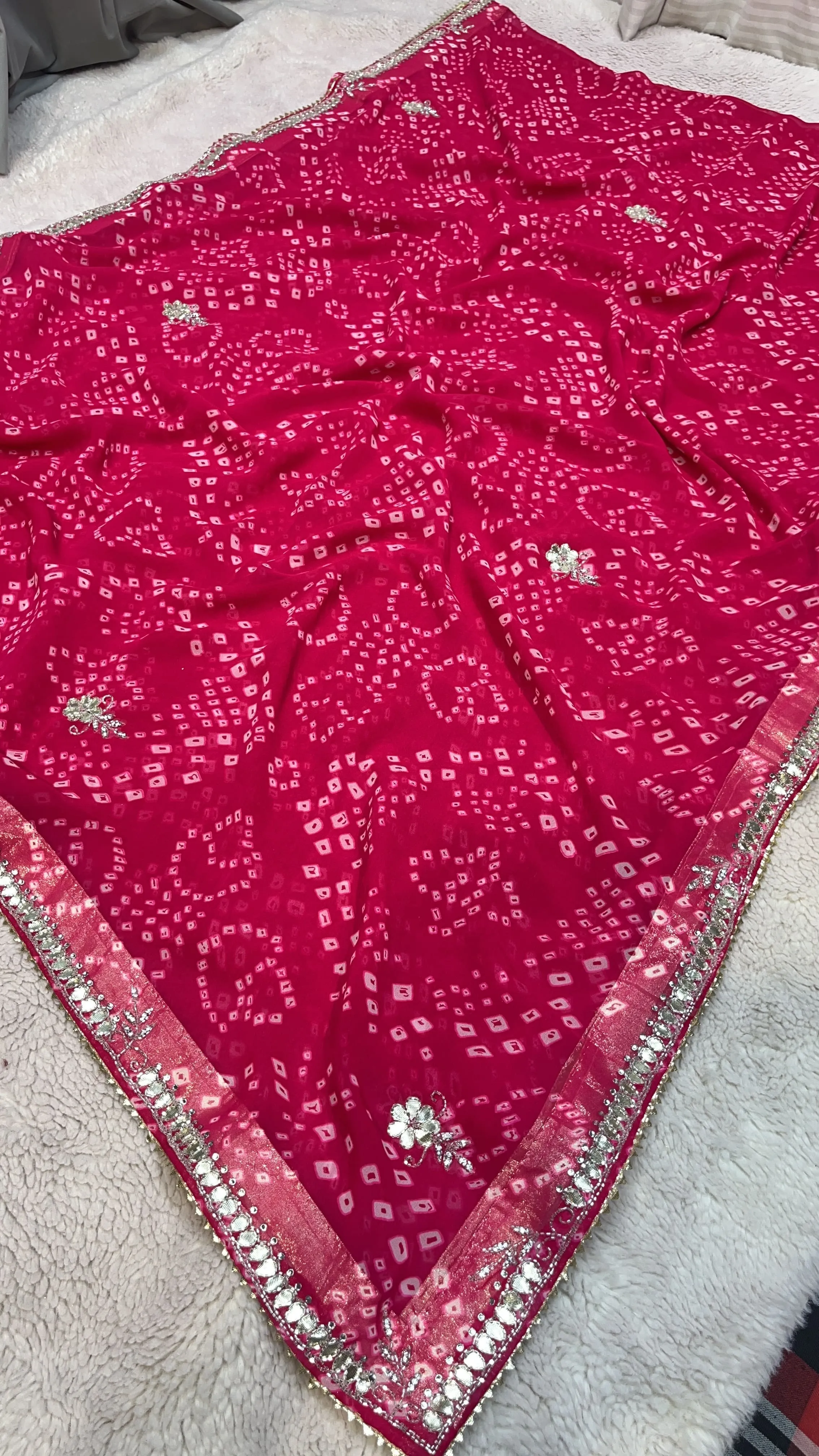 Elevate your festive wardrobe with this elegant Bandhej saree crafted in lightweight georgette fabric. Adorned with all-over Kundan and Moti work, it’s perfect for weddings, receptions, and grand celebrations.