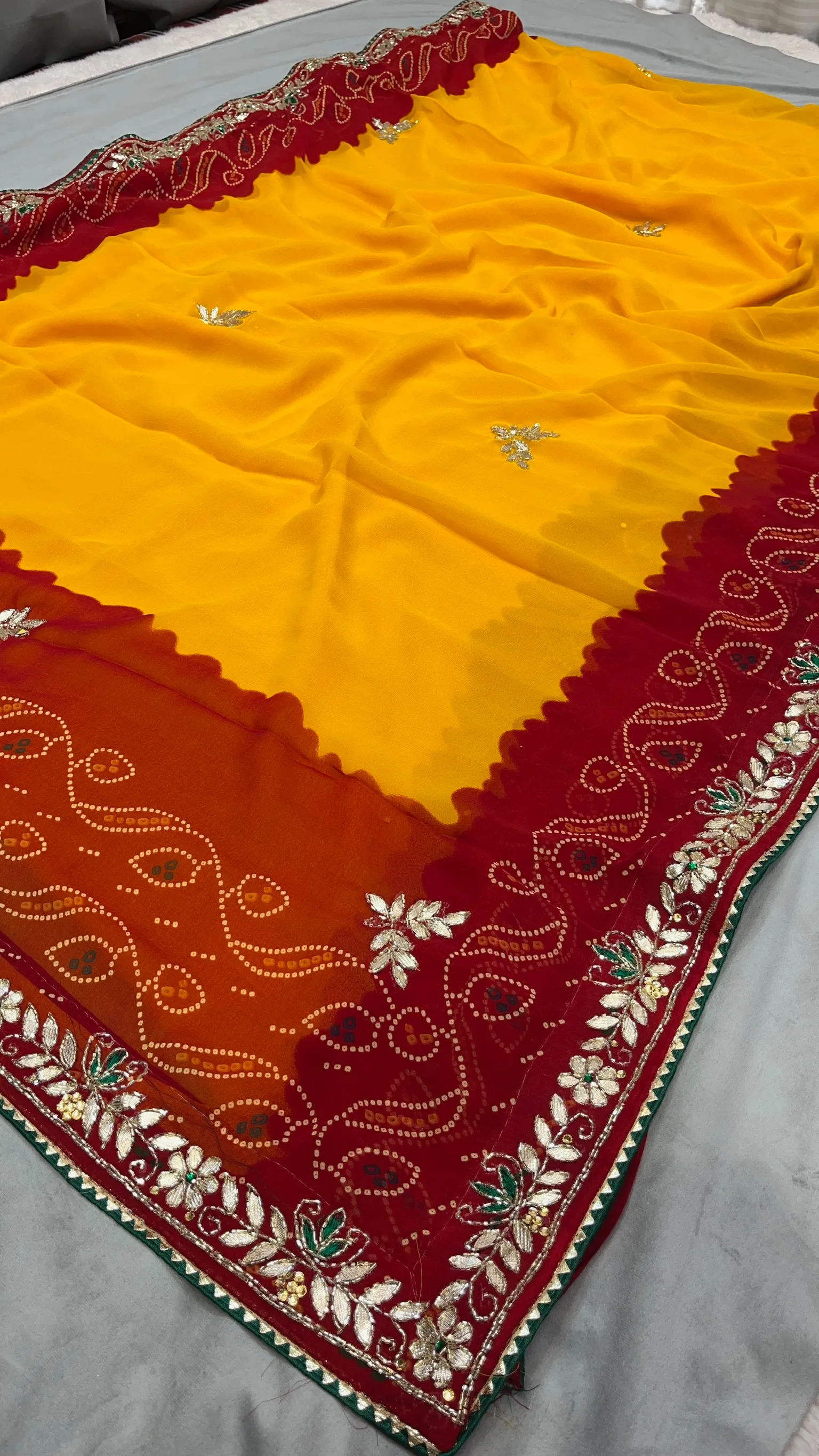 Bring home the beauty of tradition with this elegant Chundri Bandhej saree, crafted in pure viscose georgette fabric for a light, flowy, and graceful silhouette. Accented with handmade gotta patti detailing, this saree highlights authentic Rajasthani craftsmanship with a refined festive touch.