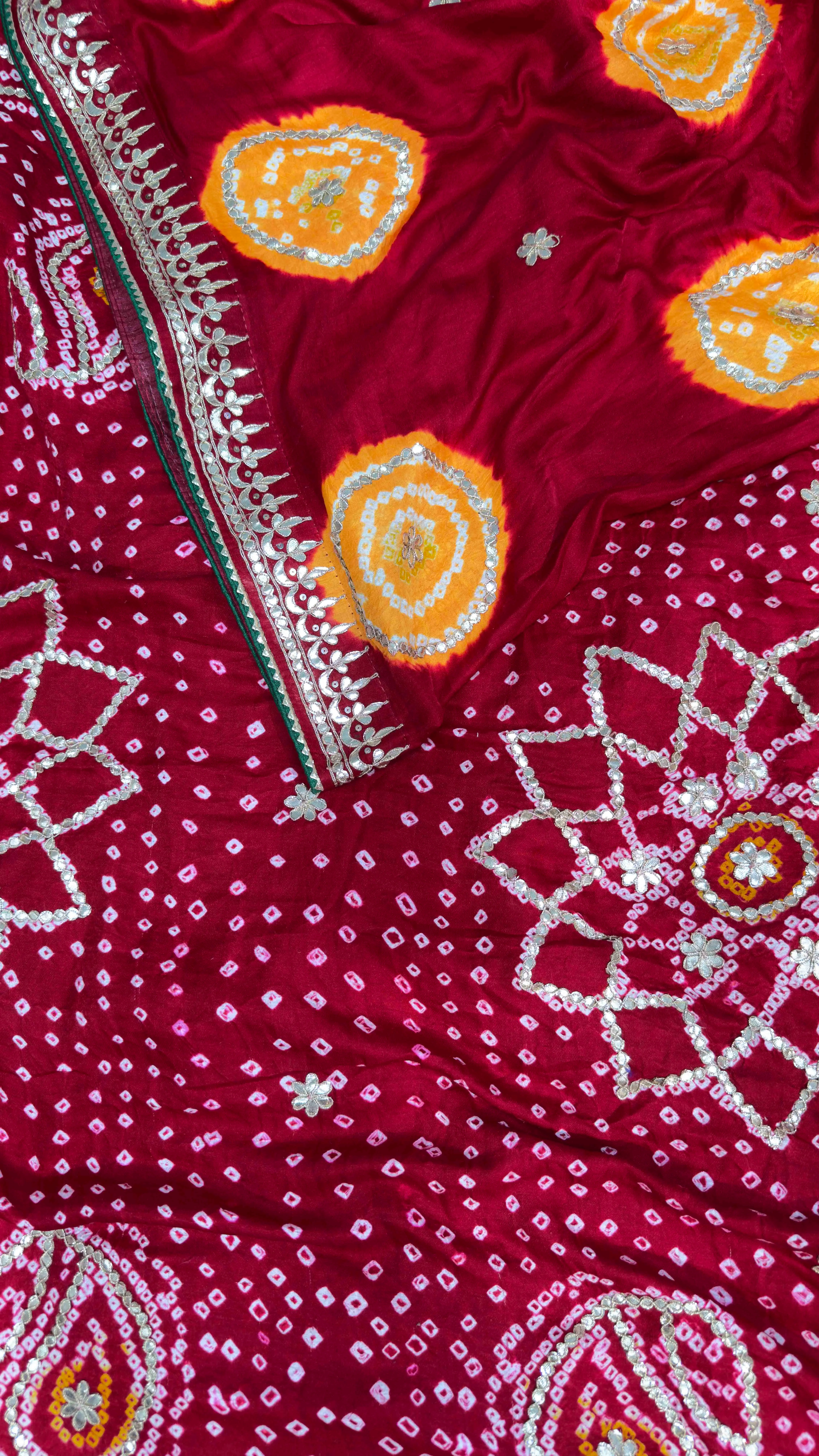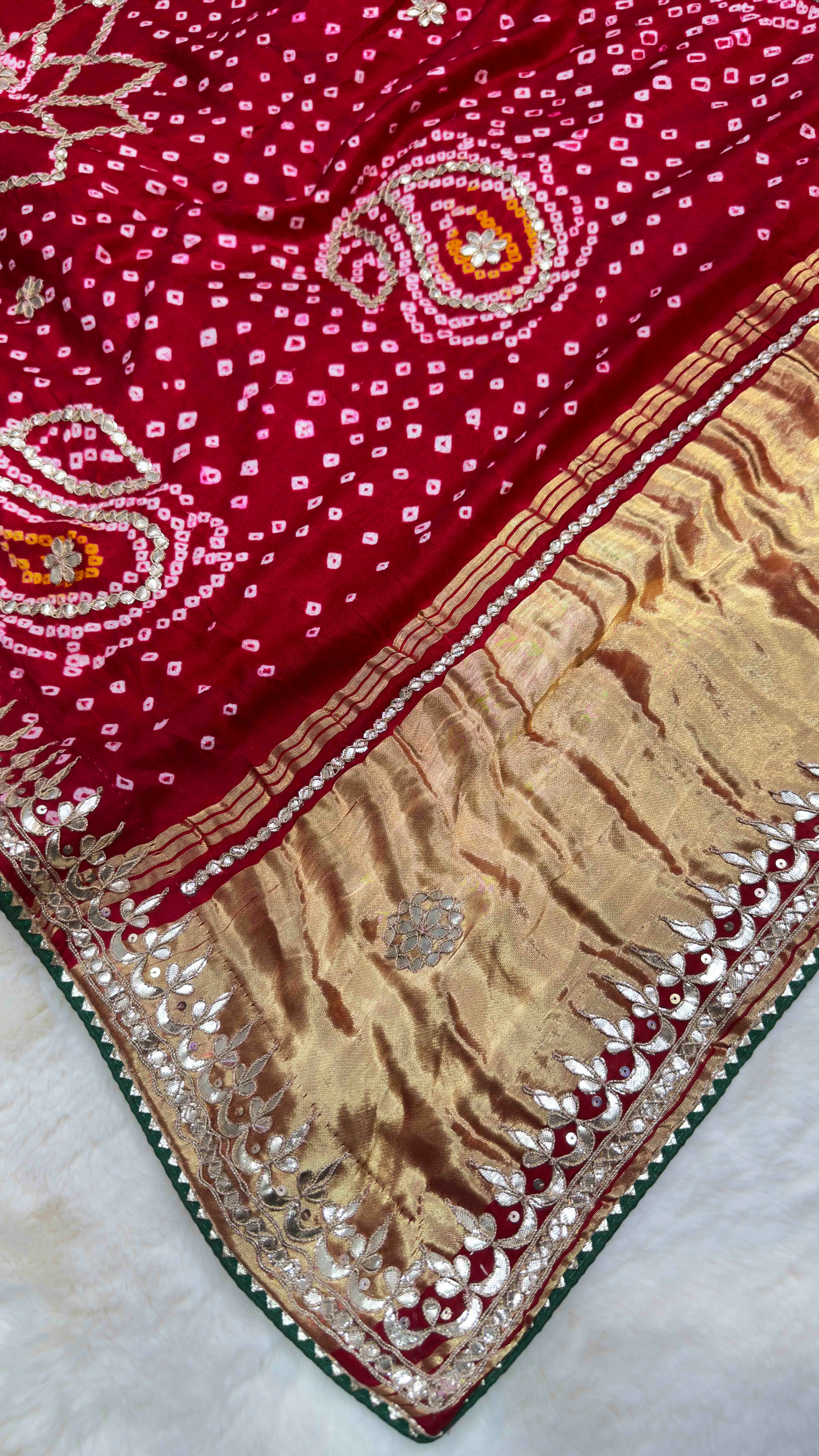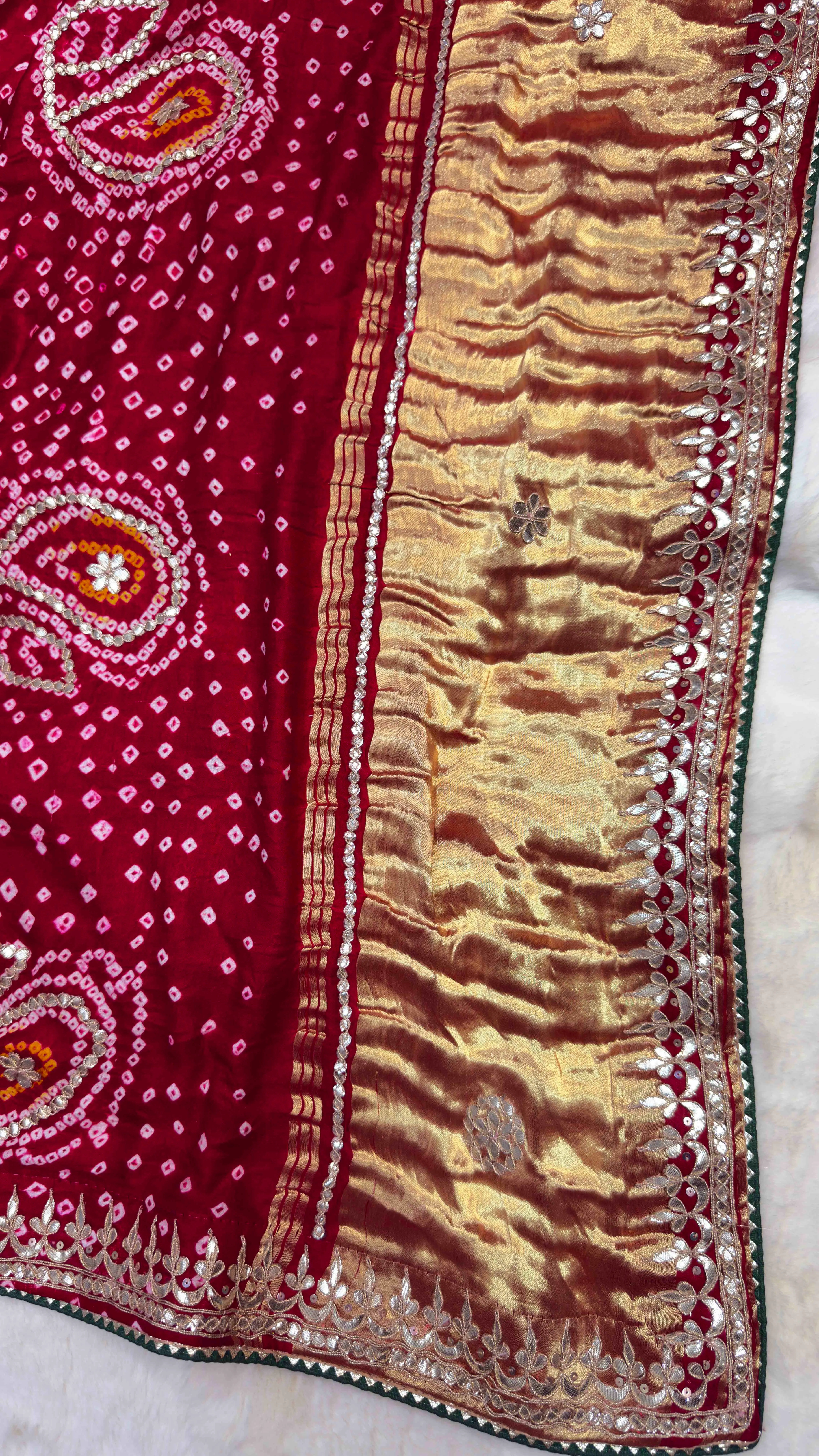 Enhance your ethnic wardrobe with this handcrafted pure Gaji silk Lakdi Patta saree, featuring exquisite zero Gotta patti work for a refined and elegant finish. Designed with premium Gaji silk fabric, it offers a smooth feel, rich luster, and flawless drape. Ideal for weddings, festive occasions, and traditional celebrations, this designer saree blends heritage craftsmanship with modern style, making it a must-have for lovers of luxury ethnic fashion.