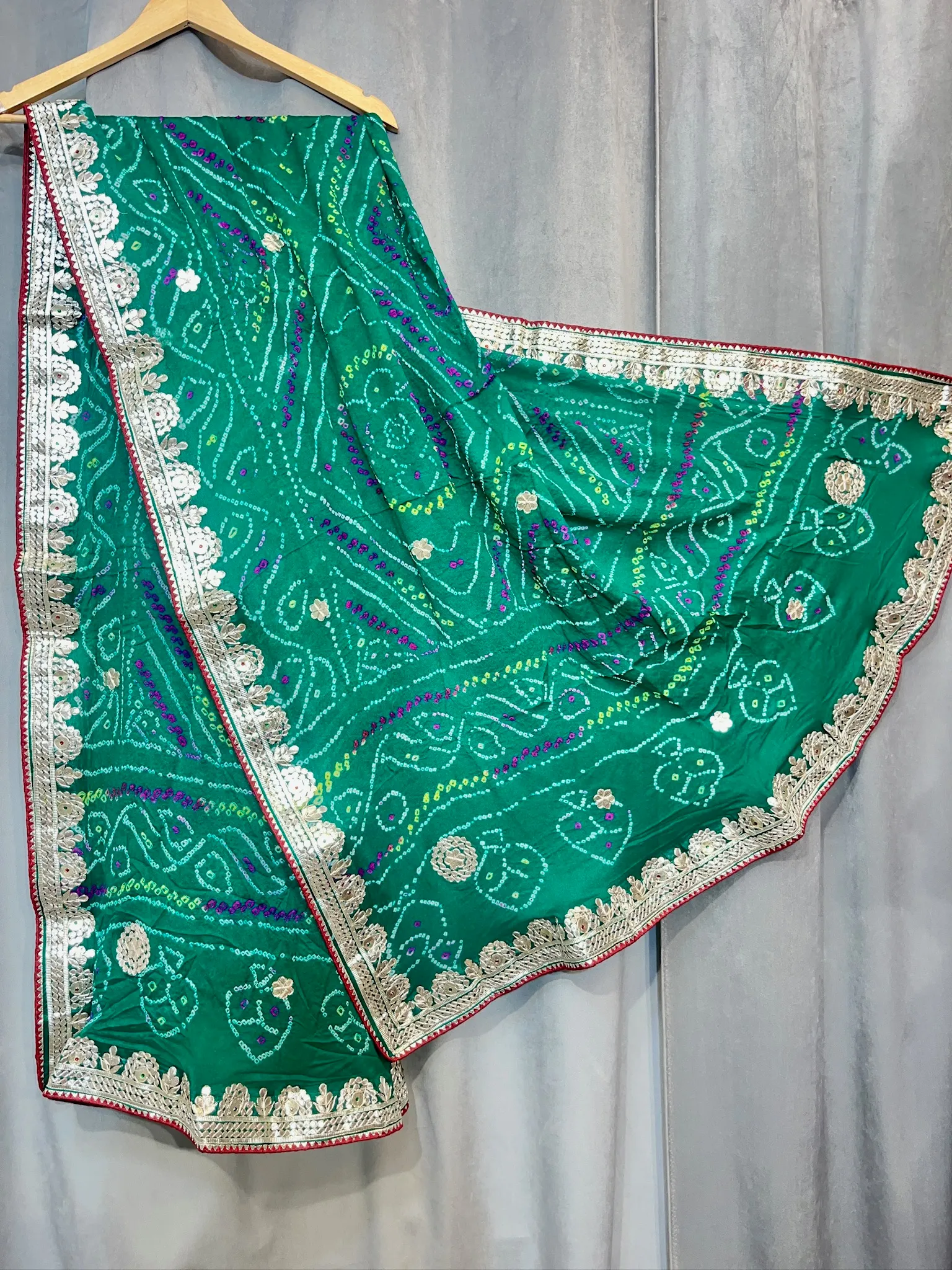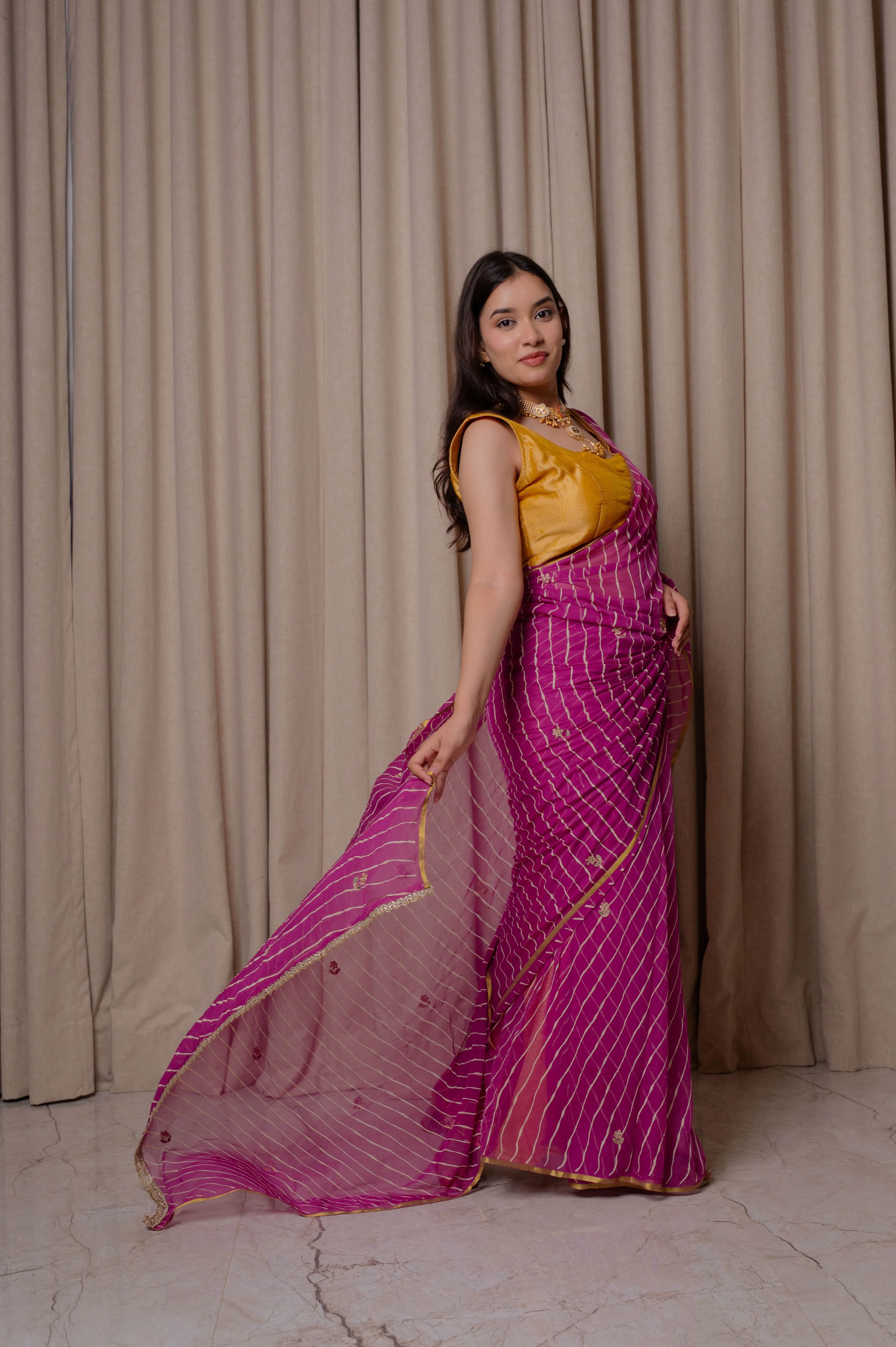 The classic Leheriya pattern is beautifully complemented by delicate Kardana Buti work, adding a subtle shimmer and refined charm to the overall design. Perfect for festive occasions, celebrations, and daytime functions, this saree blends traditional craftsmanship with contemporary appeal.
