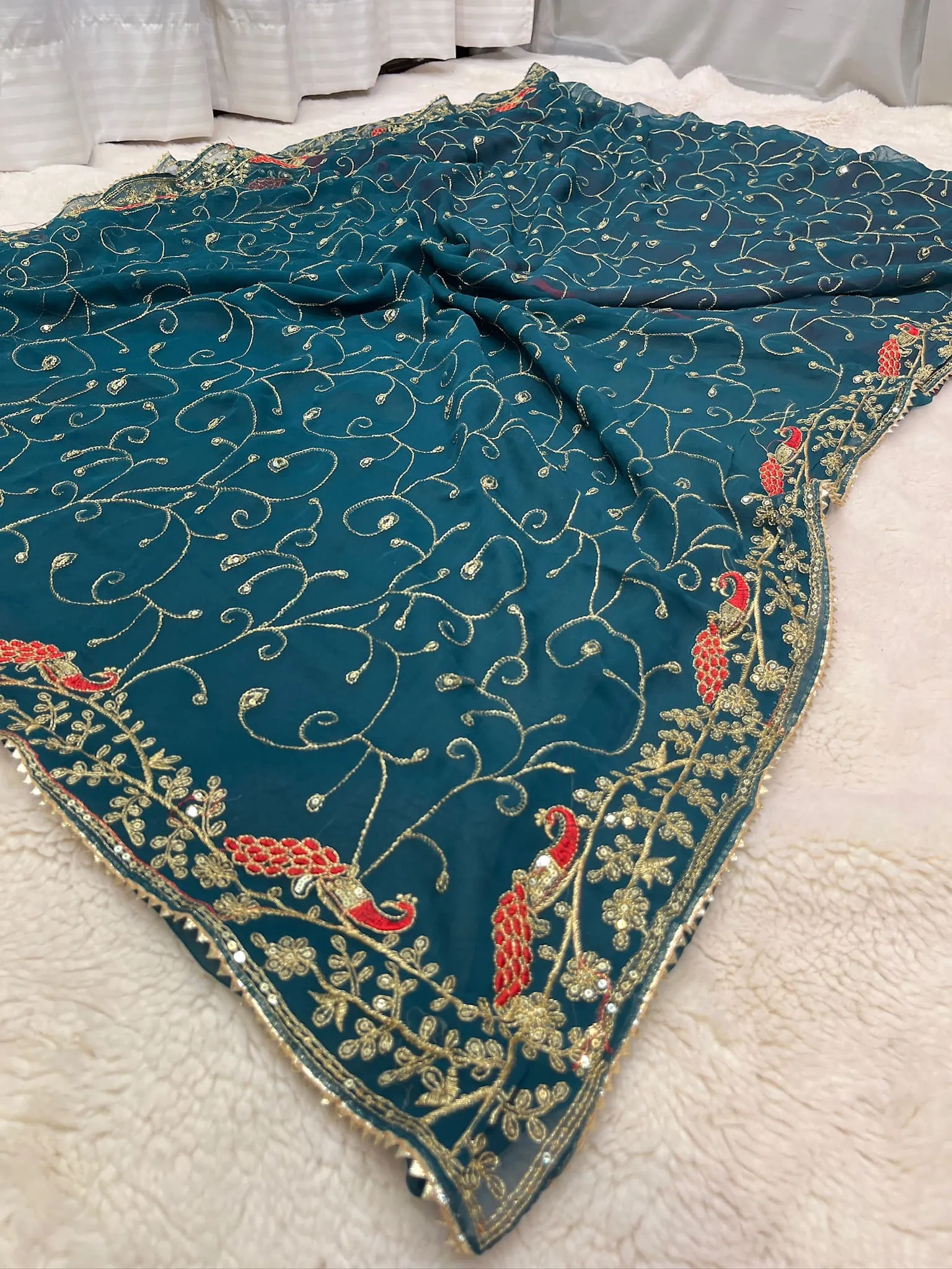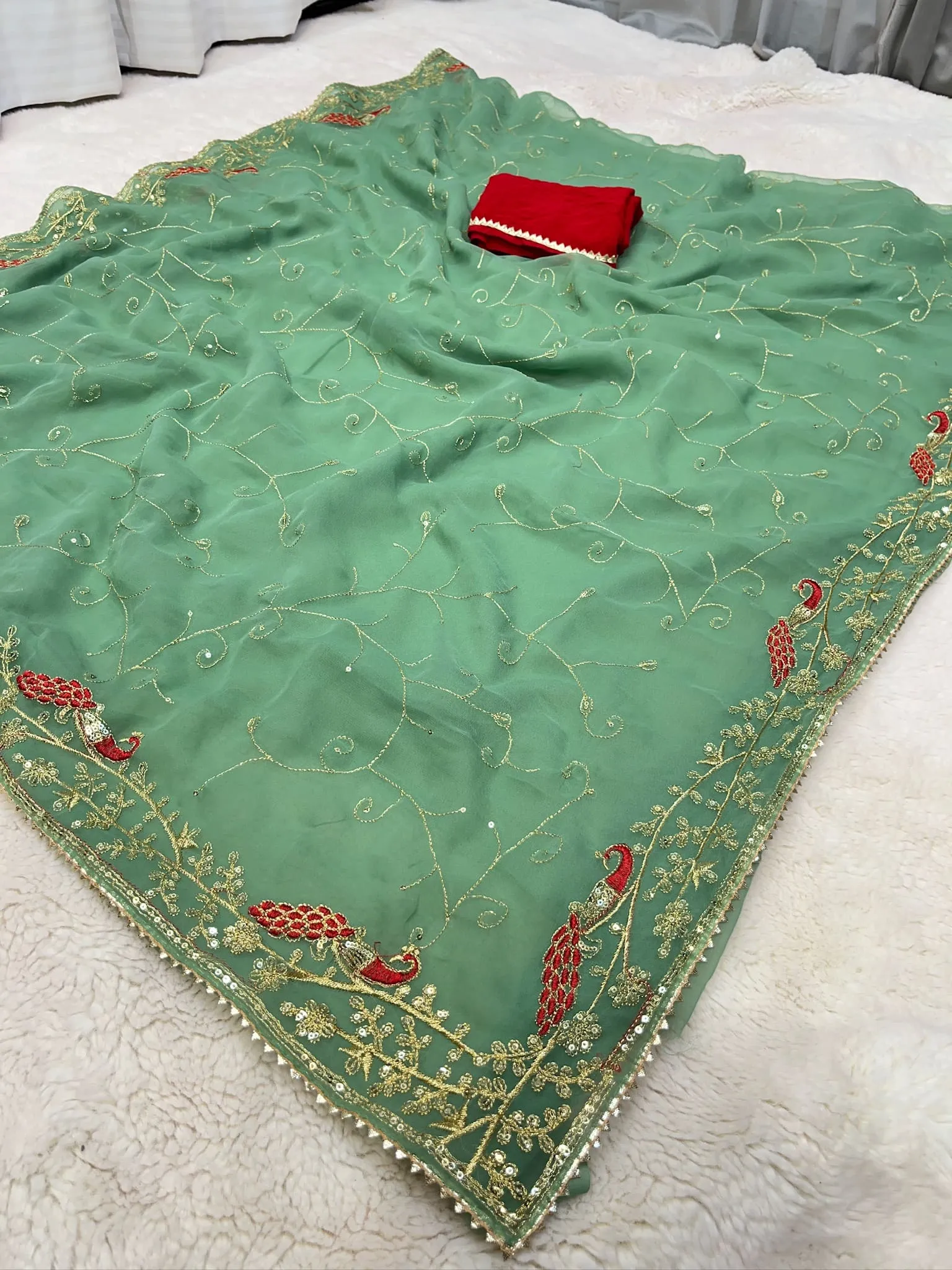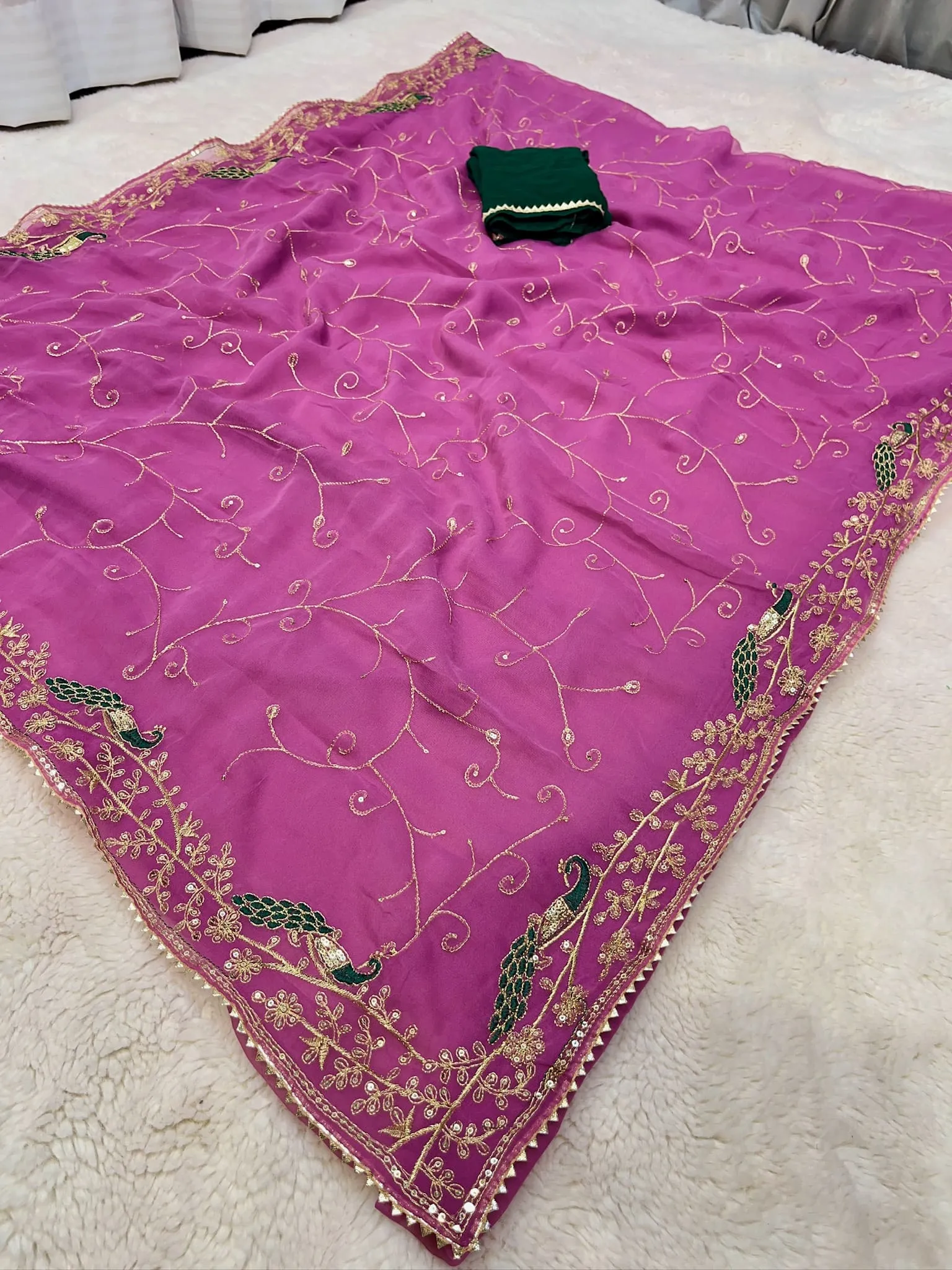 Celebrate royal elegance with this Rajputi design chiffon saree, crafted to reflect the rich heritage of Rajasthan. Made from lightweight chiffon fabric, the saree drapes effortlessly while offering a graceful, flowy silhouette.
