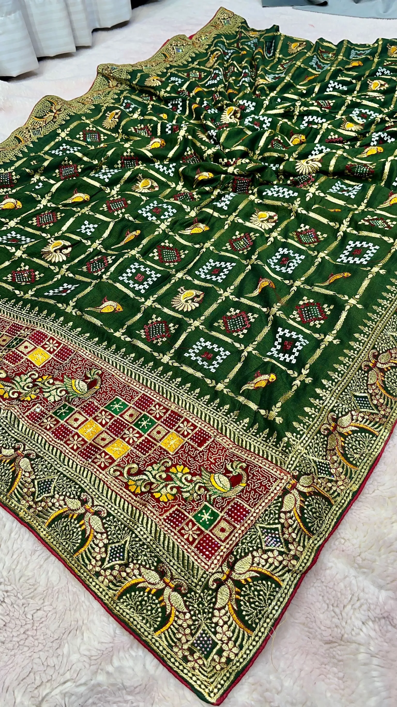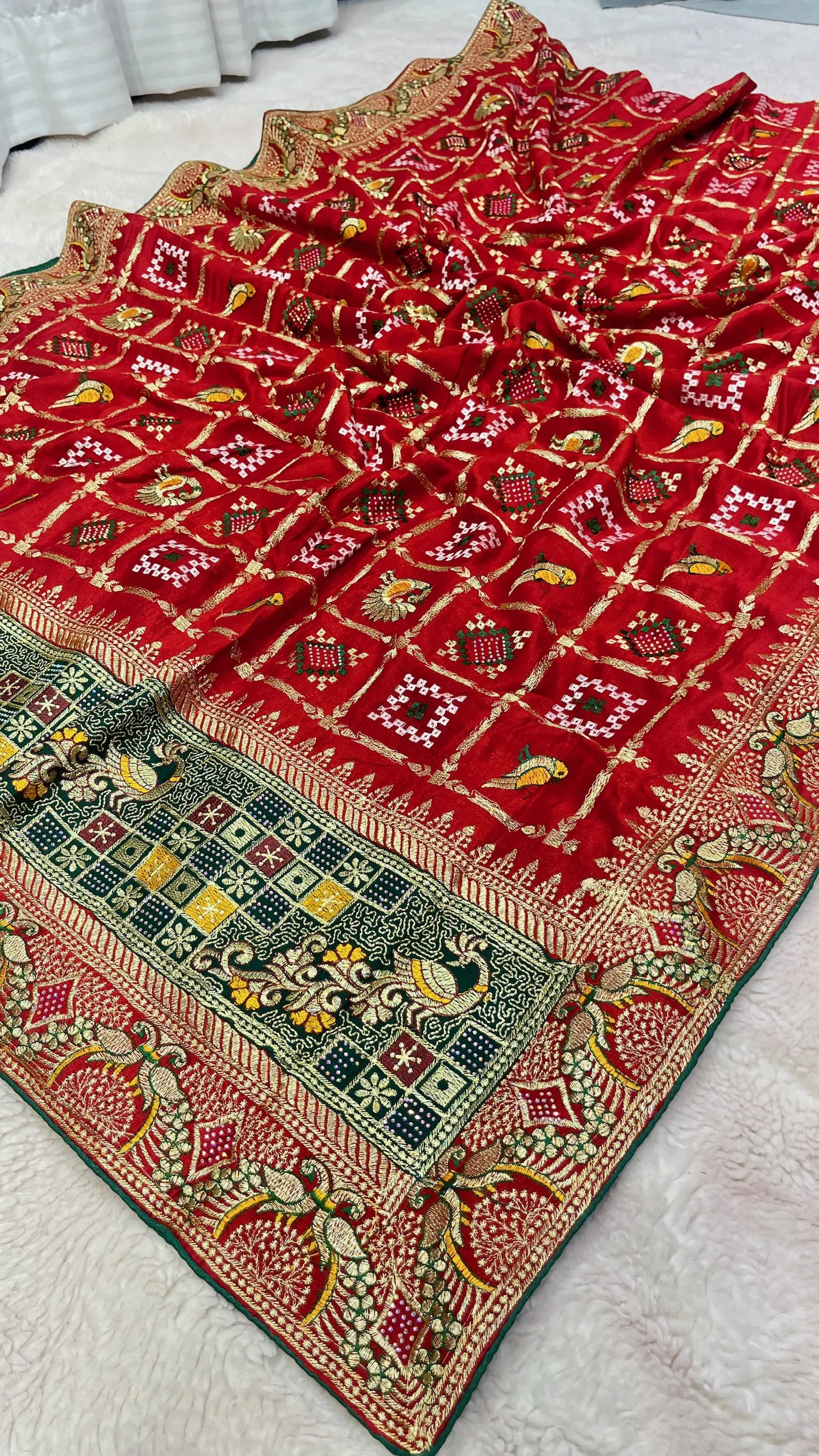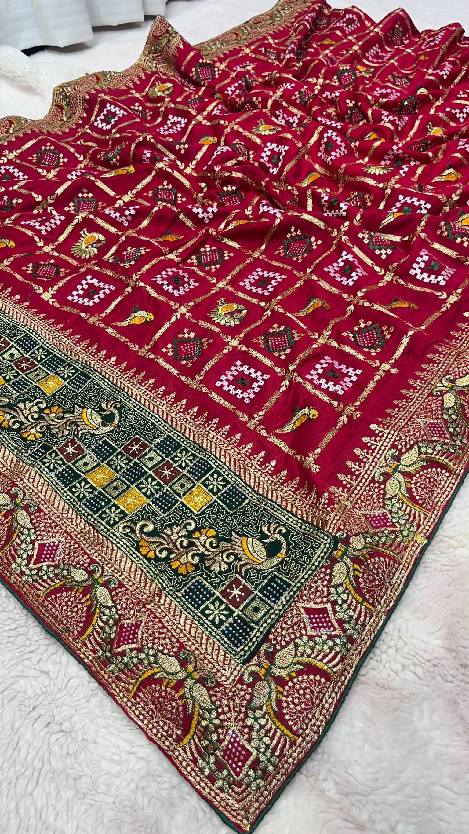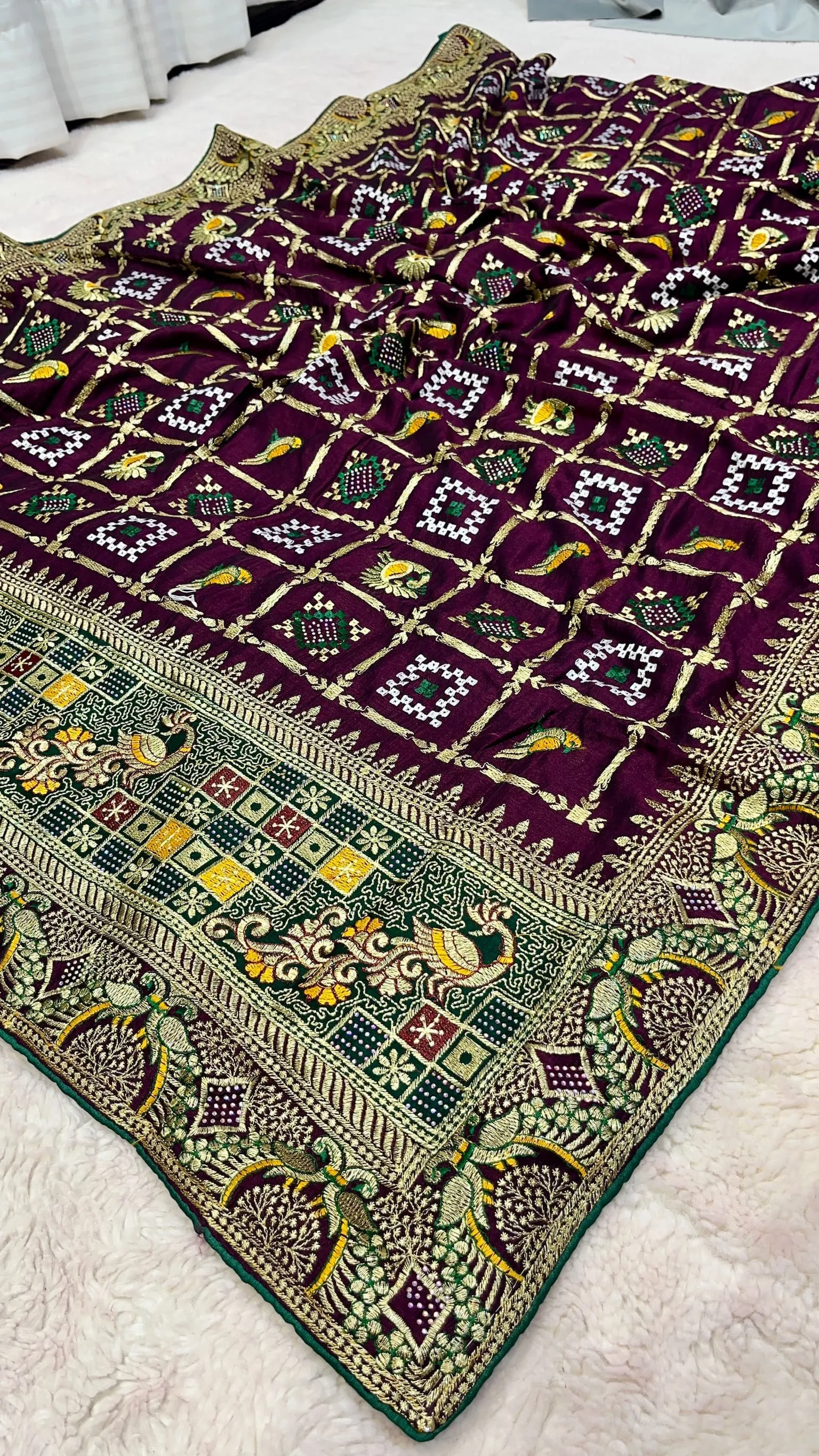 Step into regal elegance with this designer Rajwadi saree crafted in luxurious Russian silk fabric, known for its rich texture and flawless drape. The saree is beautifully adorned with heavy zari thread embroidery spread across the entire saree, creating a majestic and grand visual appeal.