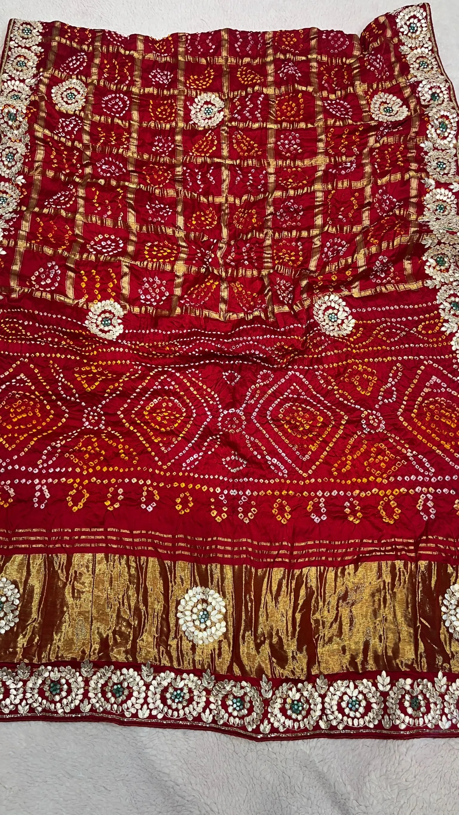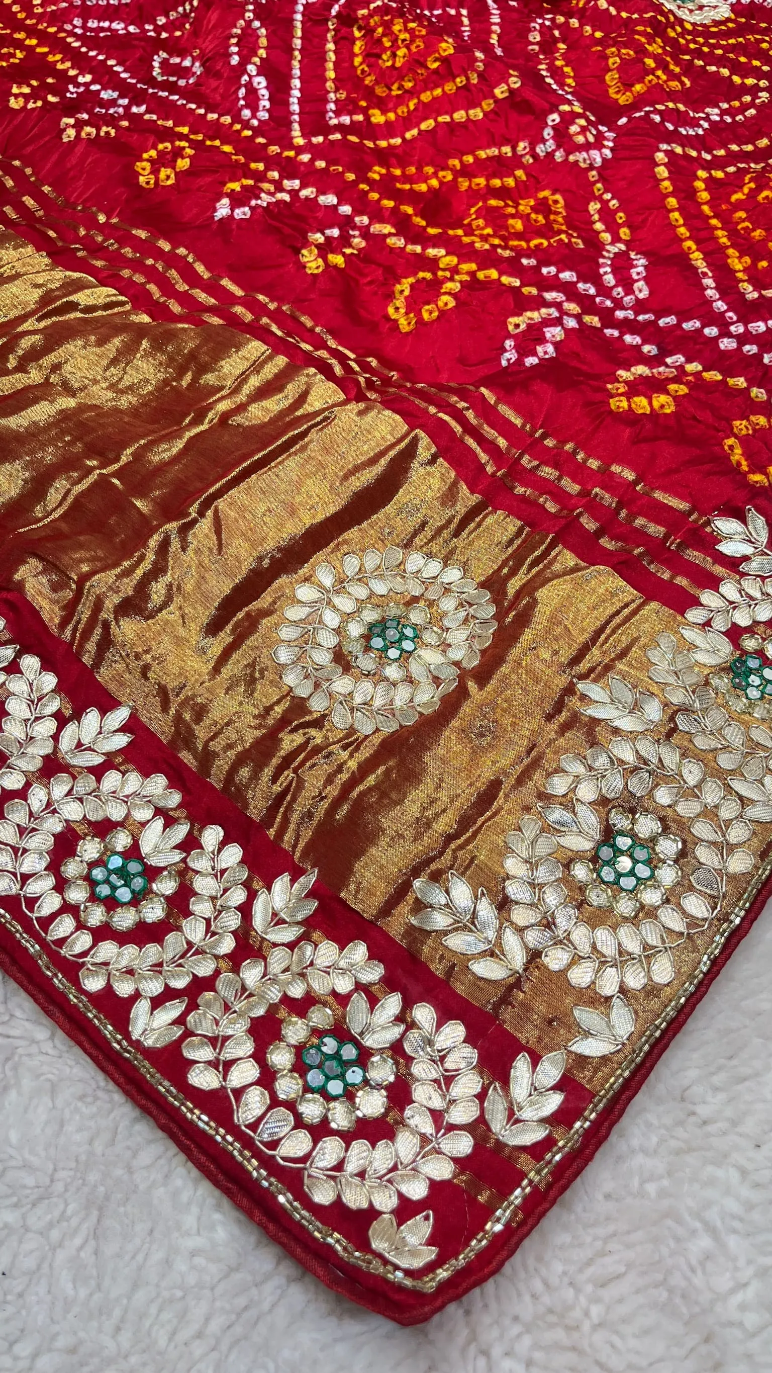 Elevate your festive wardrobe with this Semi Gaji silk Ghatchola saree featuring authentic hand Bandhej. Enhanced with handmade Zardozi, Kundan, and Patti work, it’s perfect for weddings, receptions, and traditional celebrations.