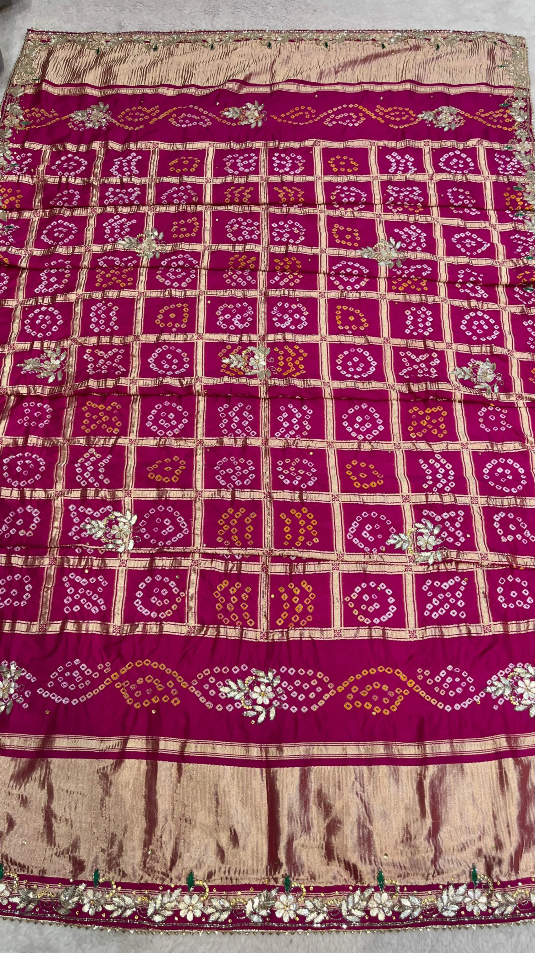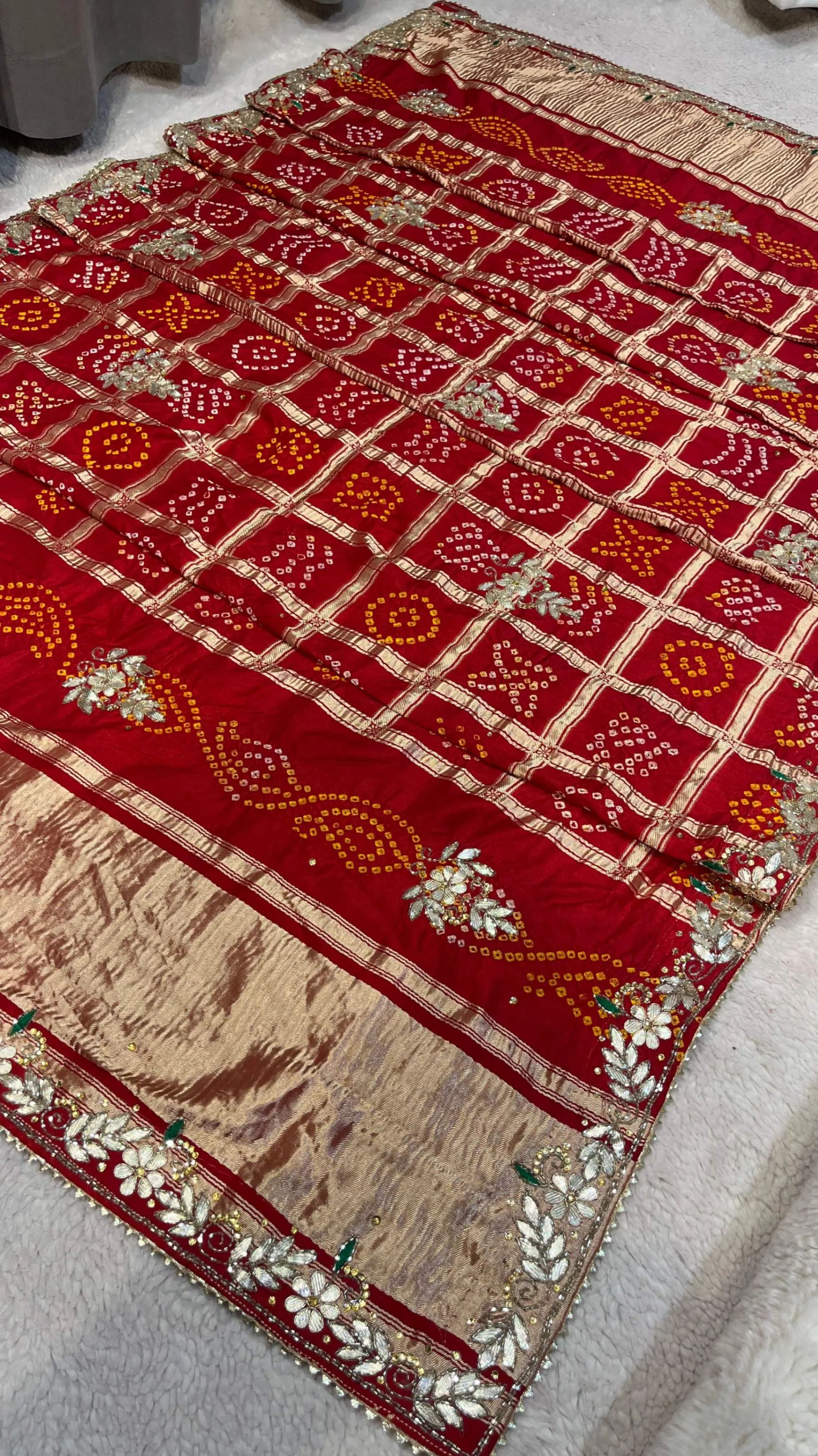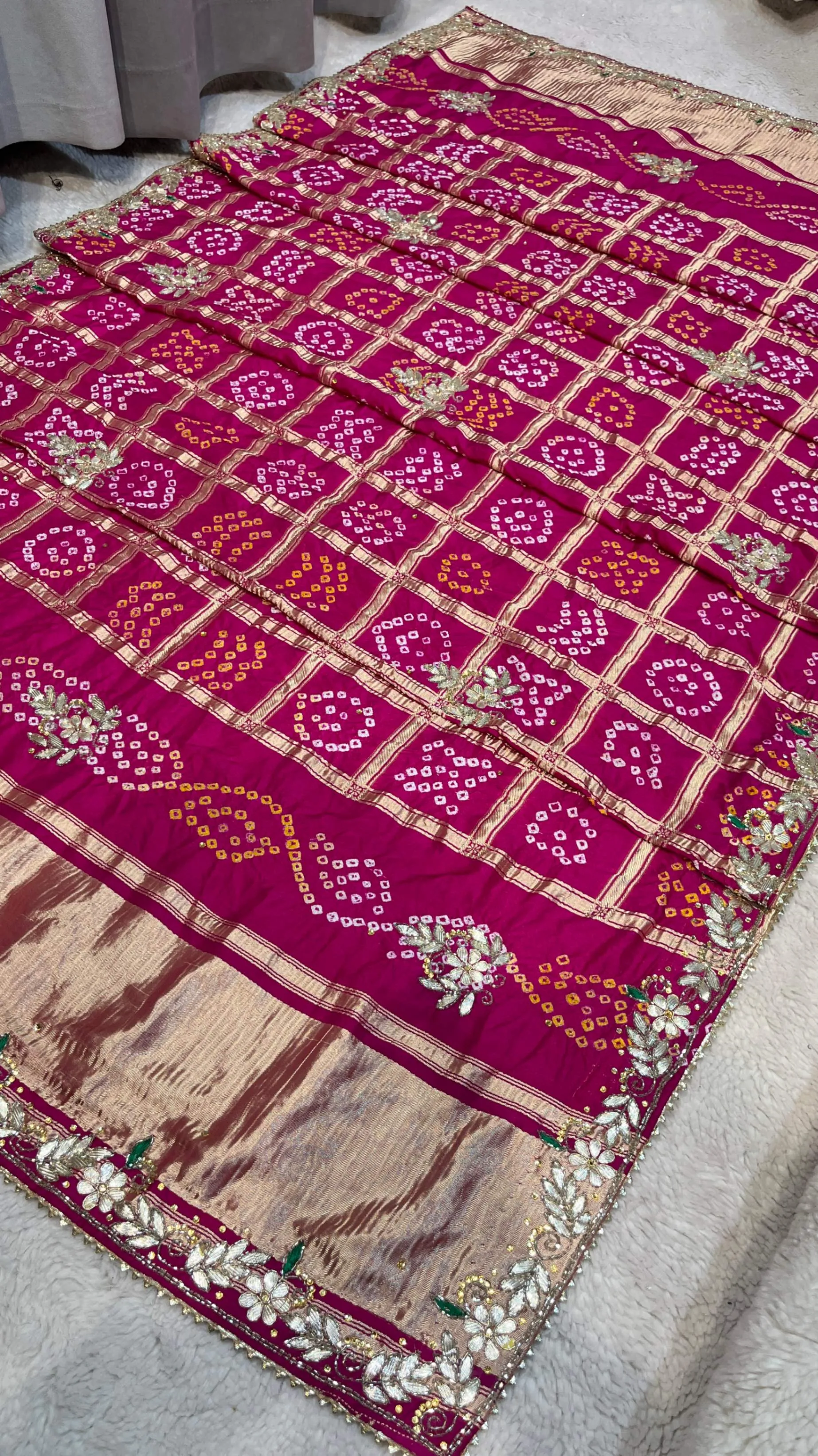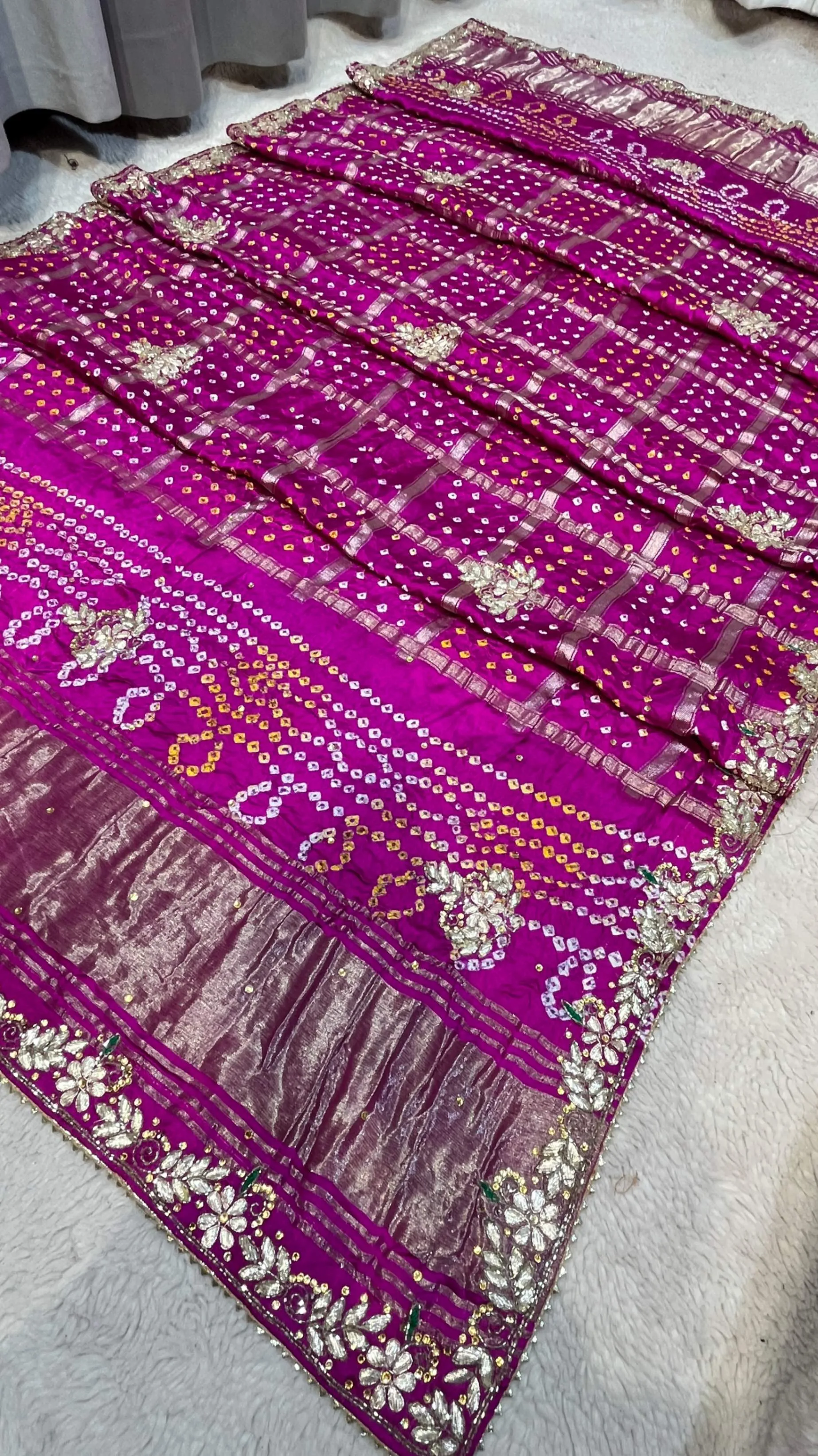 Elevate your ethnic elegance with this semi Gazi Meena zari silk dupatta, crafted using traditional hand Bandhej techniques that reflect rich Rajasthani heritage. The silk fabric, enriched with subtle Meena zari accents, offers a graceful drape and refined shine.