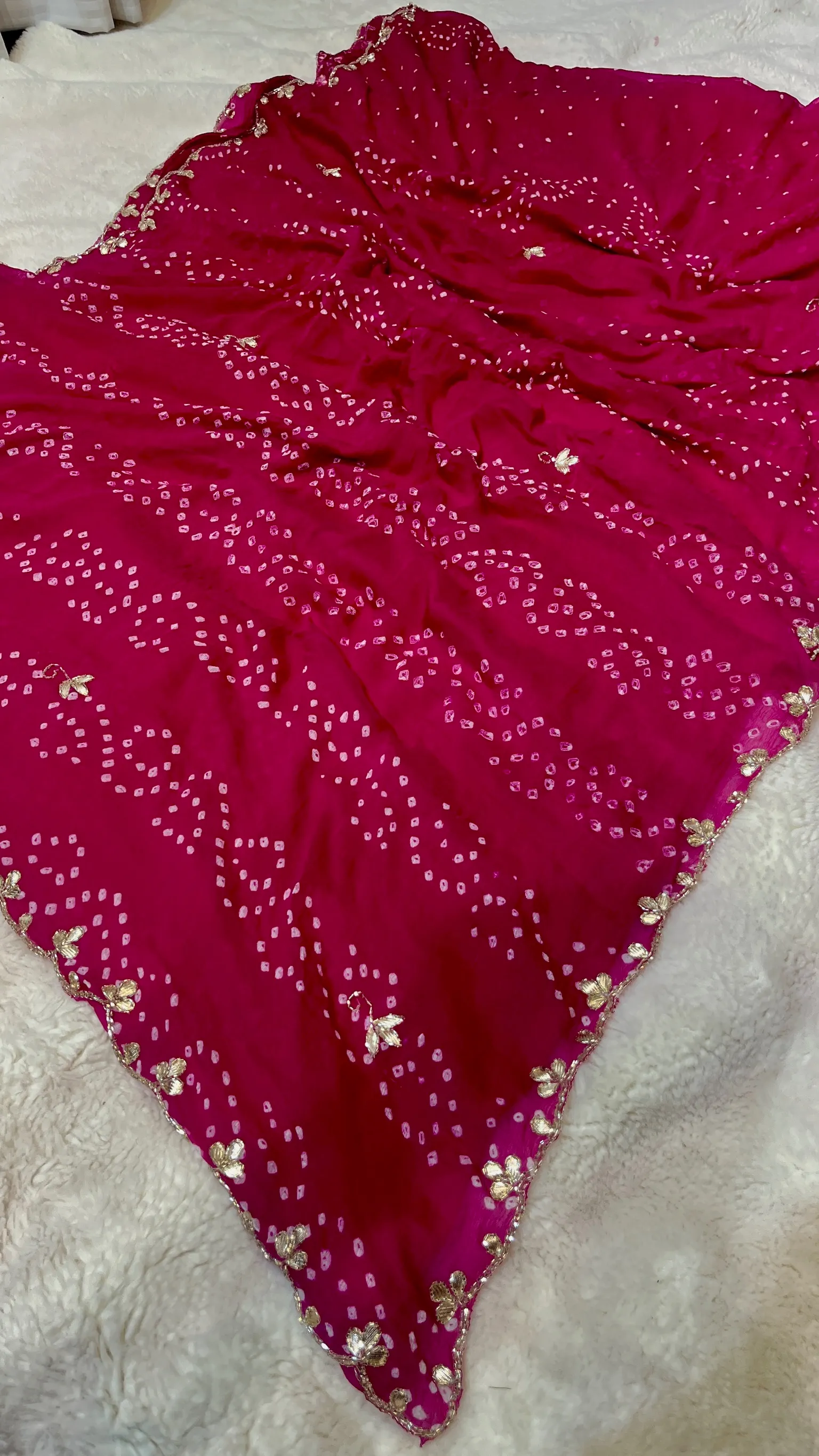 Featuring the classic Bandhej (tie-dye) pattern, this saree reflects rich Indian heritage and timeless craftsmanship. The highlight is the intricate pipe gota patti work, which adds shimmering detail and elevates the overall look with a touch of refined luxury. Ideal for weddings, festivals, parties, and cultural events, this saree effortlessly blends tradition with modern style.