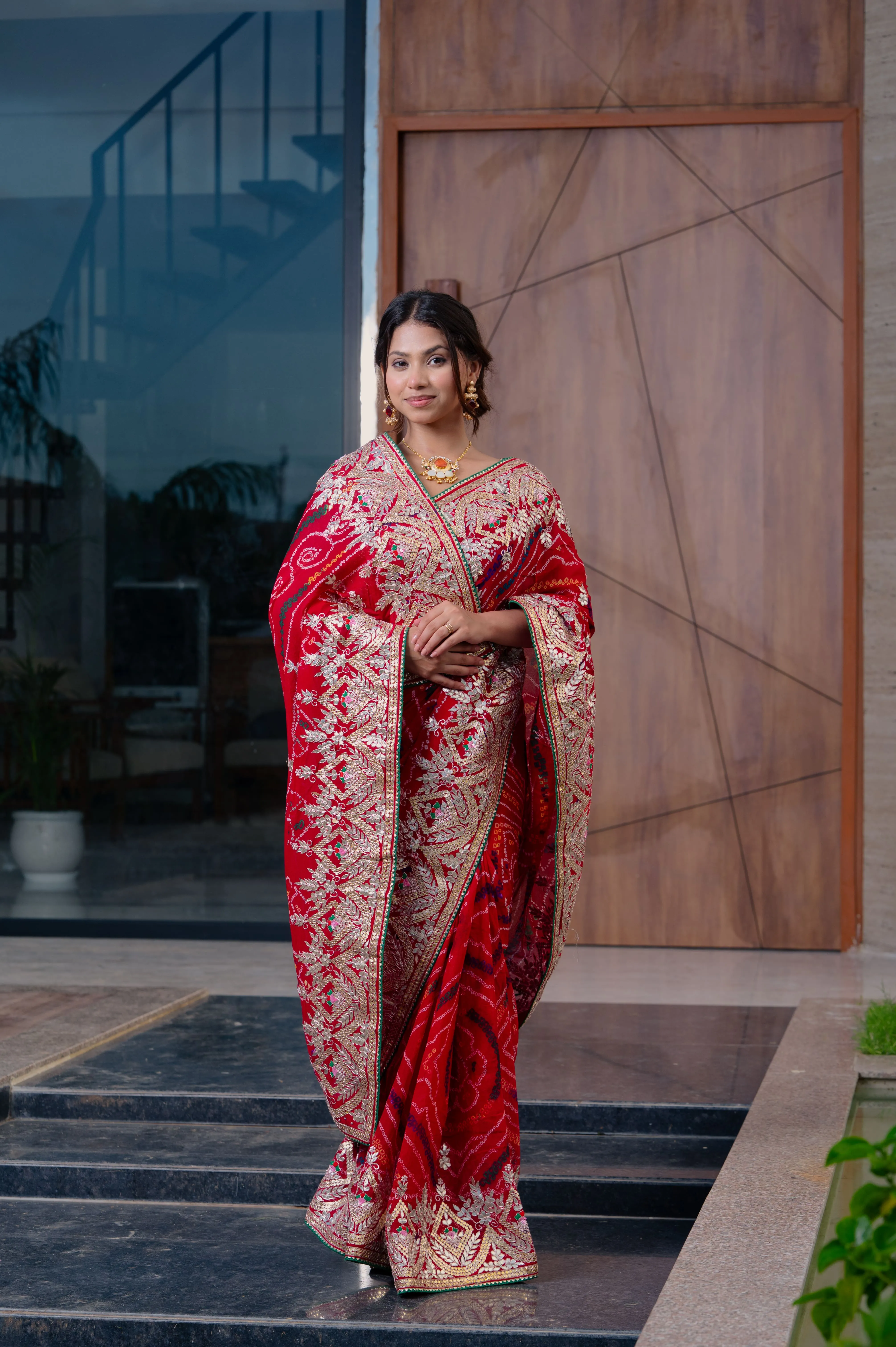 The saree is elegantly finished with traditional Gotta Patti work, adding a festive and regal touch to its overall appeal. Lightweight, flowy, and comfortable, the Ojariya crepe fabric offers a graceful drape, making this saree ideal for festive occasions, weddings, cultural events, and celebrations.