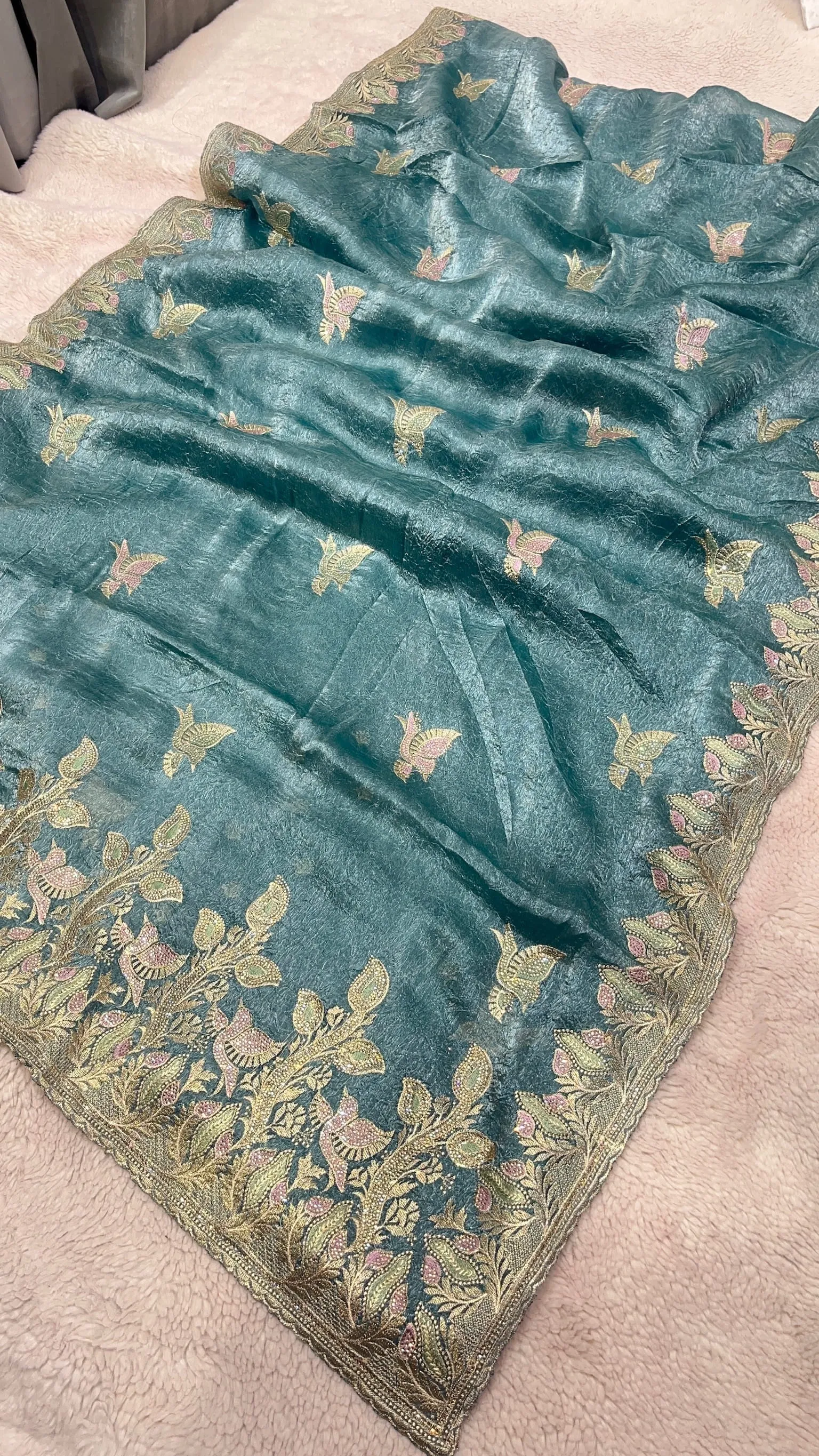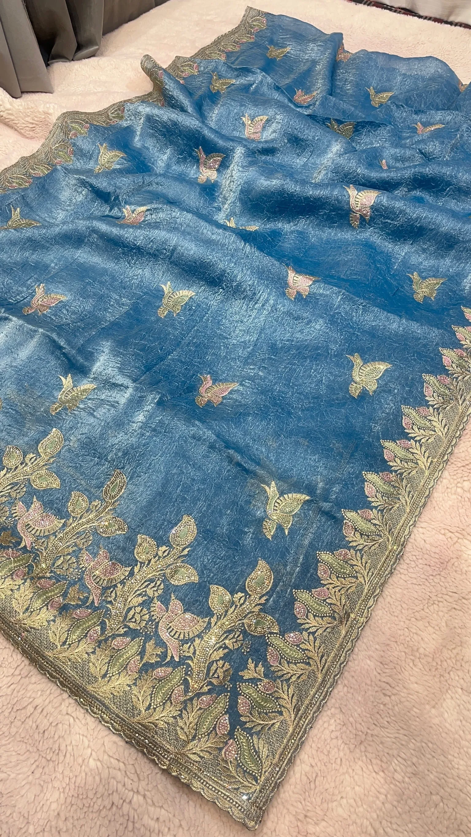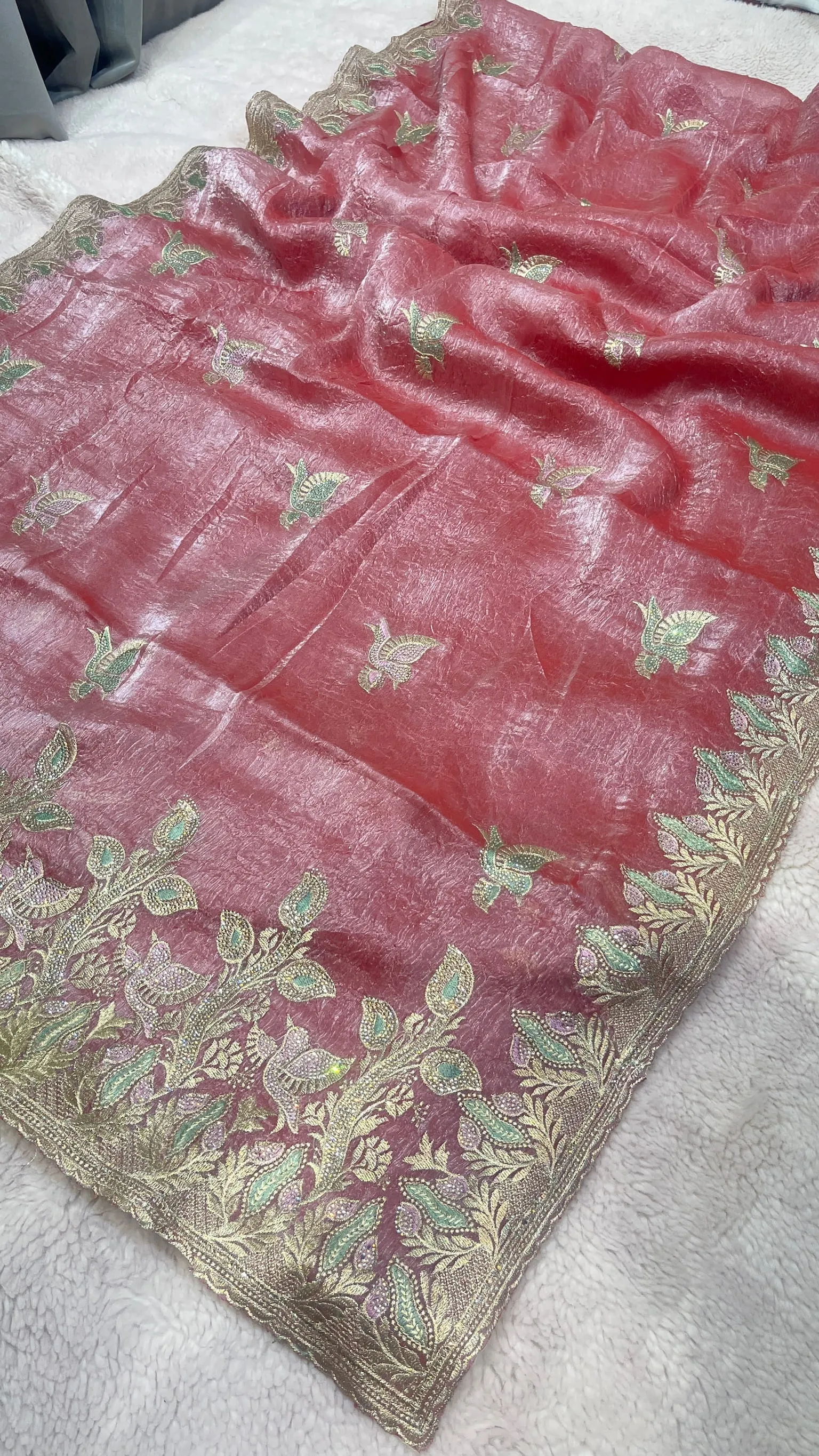 Enhance your ethnic wardrobe with this refined organza tissue designer saree, thoughtfully crafted to showcase elegance and craftsmanship. Made from premium organza tissue fabric, this saree features a lightweight, crisp texture with a soft sheen that creates a graceful and luxurious drape.