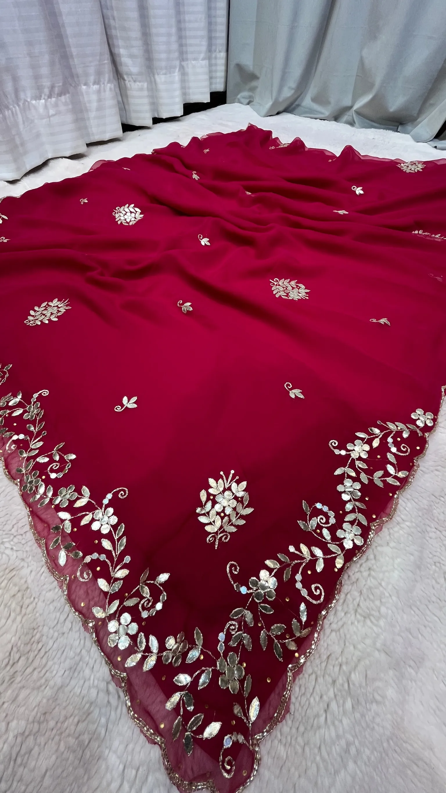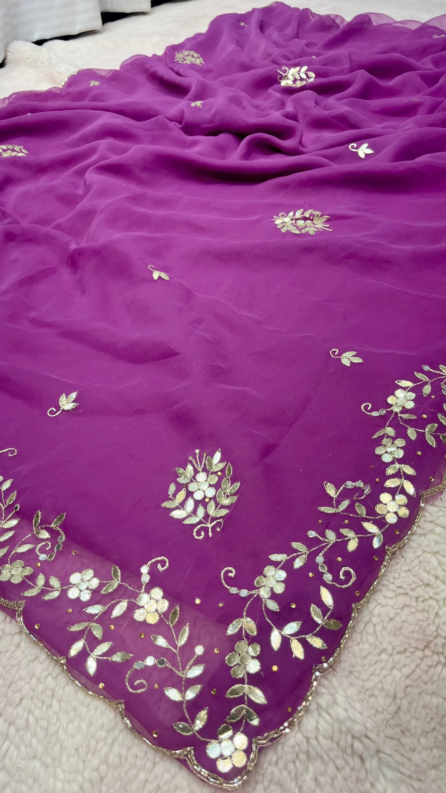 Style this chiffon gota patti saree with traditional jewelry and heels to complete a refined and elegant look.