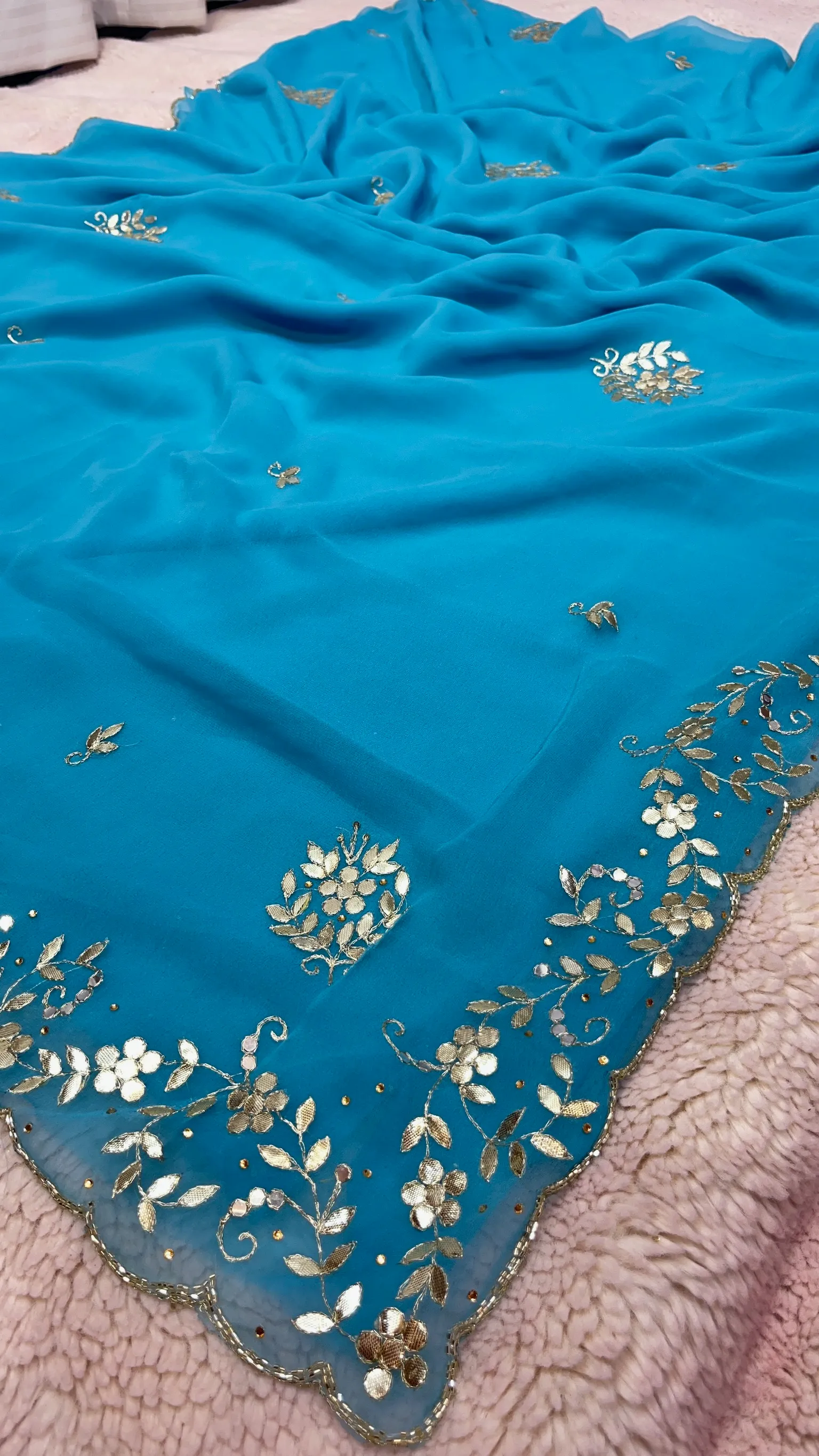Add effortless charm to your ethnic wardrobe with this graceful chiffon gota patti saree, designed to offer both comfort and traditional elegance. Made from lightweight chiffon fabric, this saree drapes beautifully, creating a soft and flowy silhouette that is perfect for long festive celebrations.