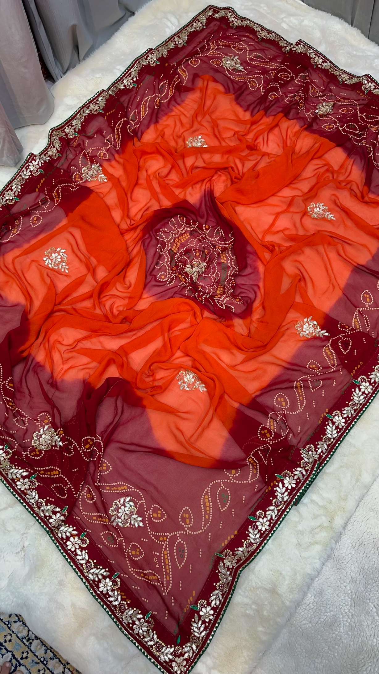 Crafted for a graceful and refined look, this georgette lehenga showcases exquisite hand-applied kundan patti work that adds a subtle yet luxurious glow. The lightweight georgette fabric flows beautifully, offering comfort without compromising on elegance. Perfect for weddings, festive celebrations, and special occasions, this lehenga reflects fine craftsmanship and timeless ethnic style. A statement ensemble designed for those who appreciate intricate detailing and effortless sophistication.
