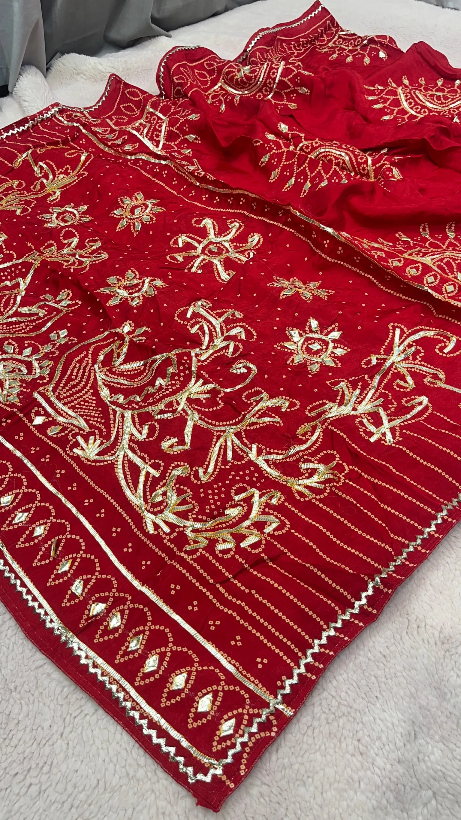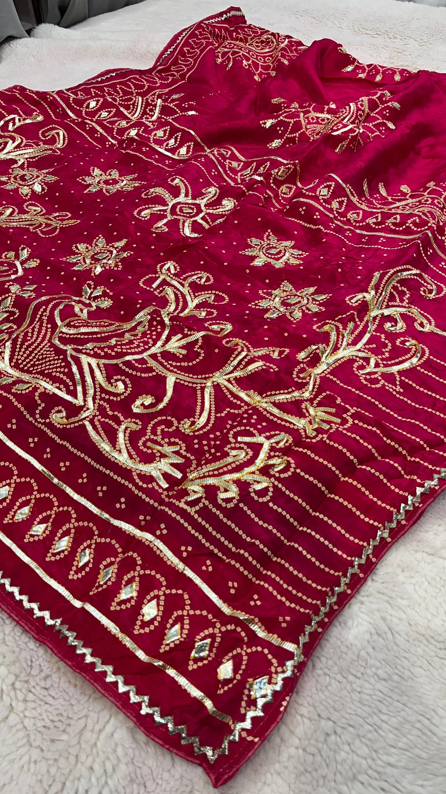 Celebrate timeless tradition with this exquisite HO Silk Bandhej Saree, designed to showcase the beauty of classic tie-dye artistry paired with fine hand embellishment. Crafted from rich HO silk, the saree offers a smooth texture and elegant drape, while the handmade Kaccha Gota Jaal work adds depth, shimmer, and artisanal charm. Ideal for weddings, festive occasions, and cultural celebrations, this saree blends heritage craftsmanship with refined elegance, making it a treasured addition to your ethnic wardrobe.