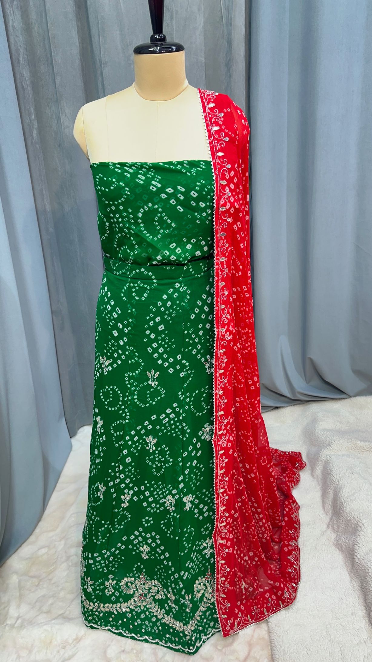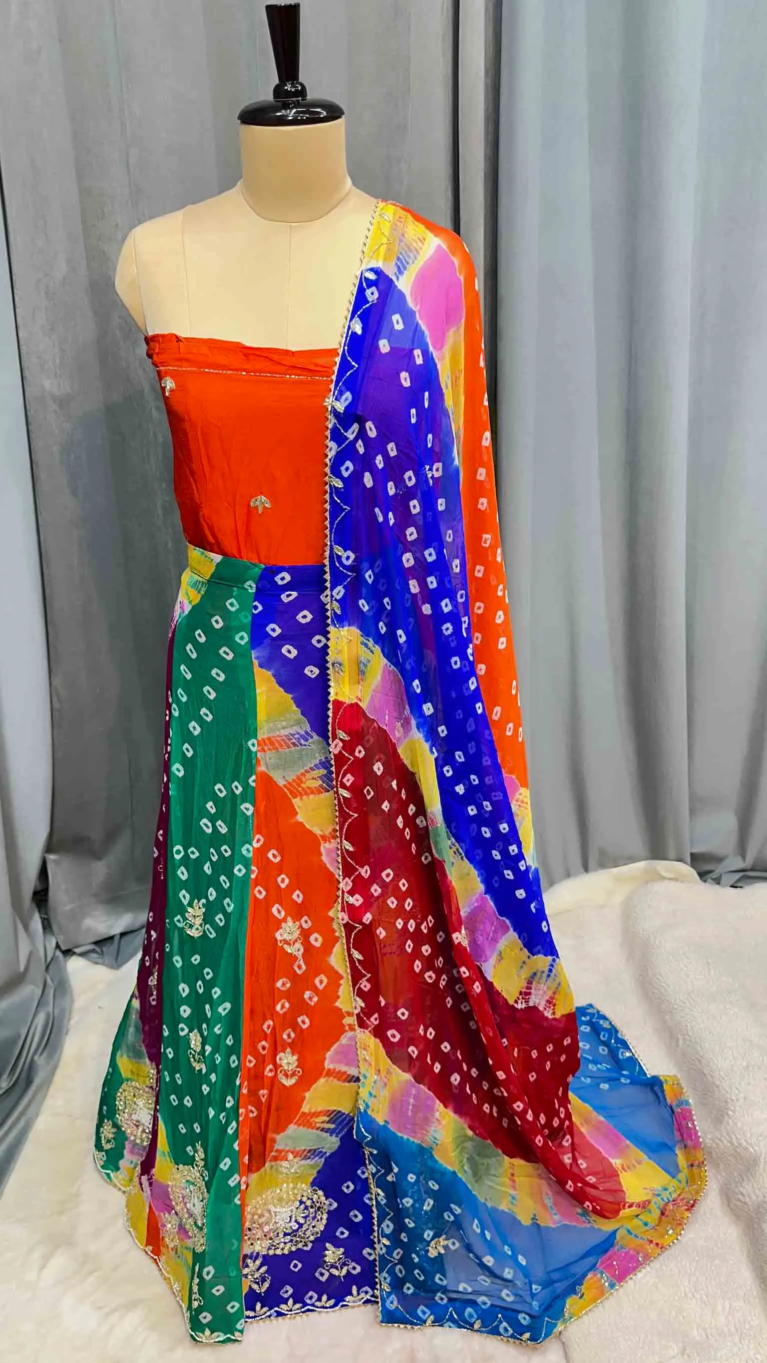 Elegant Bandhej Lehenga Chunni Set in Georgette with All-Over Handmade Kundan Patti & Moti Work – Festive & Bridal Wear