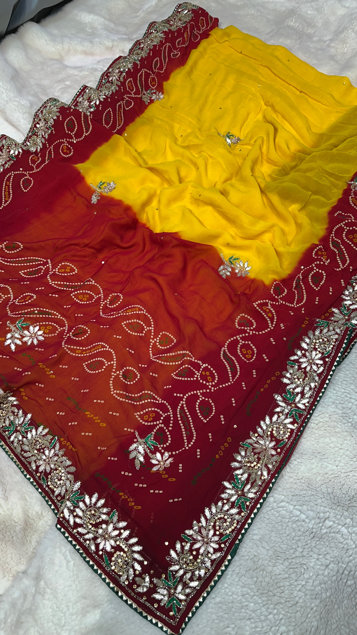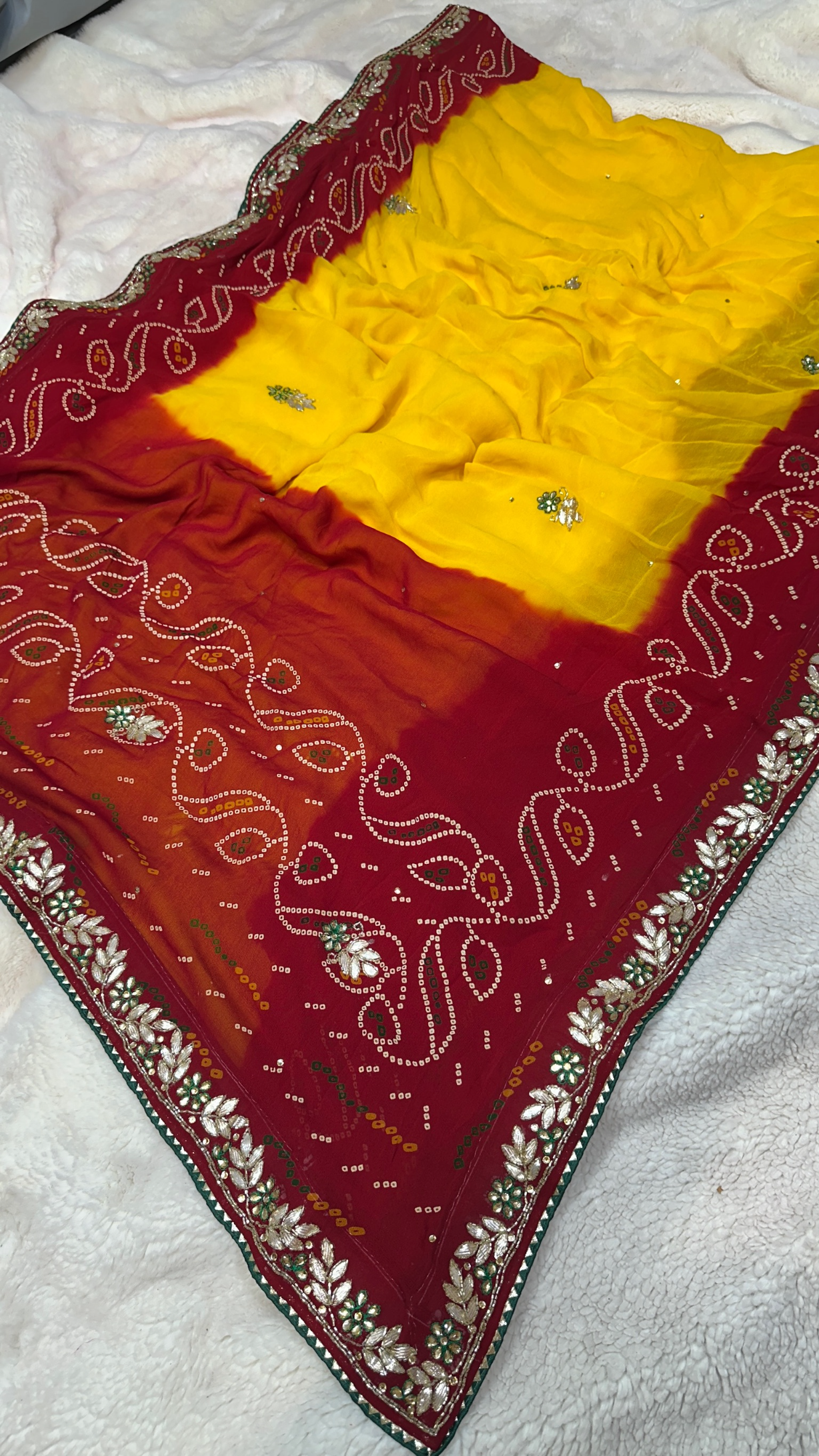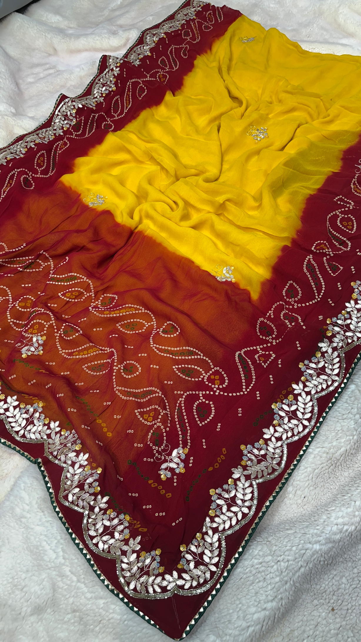 Elegant Traditional Peela Saree in Georgette with Handmade Kundan Patti Embroidery