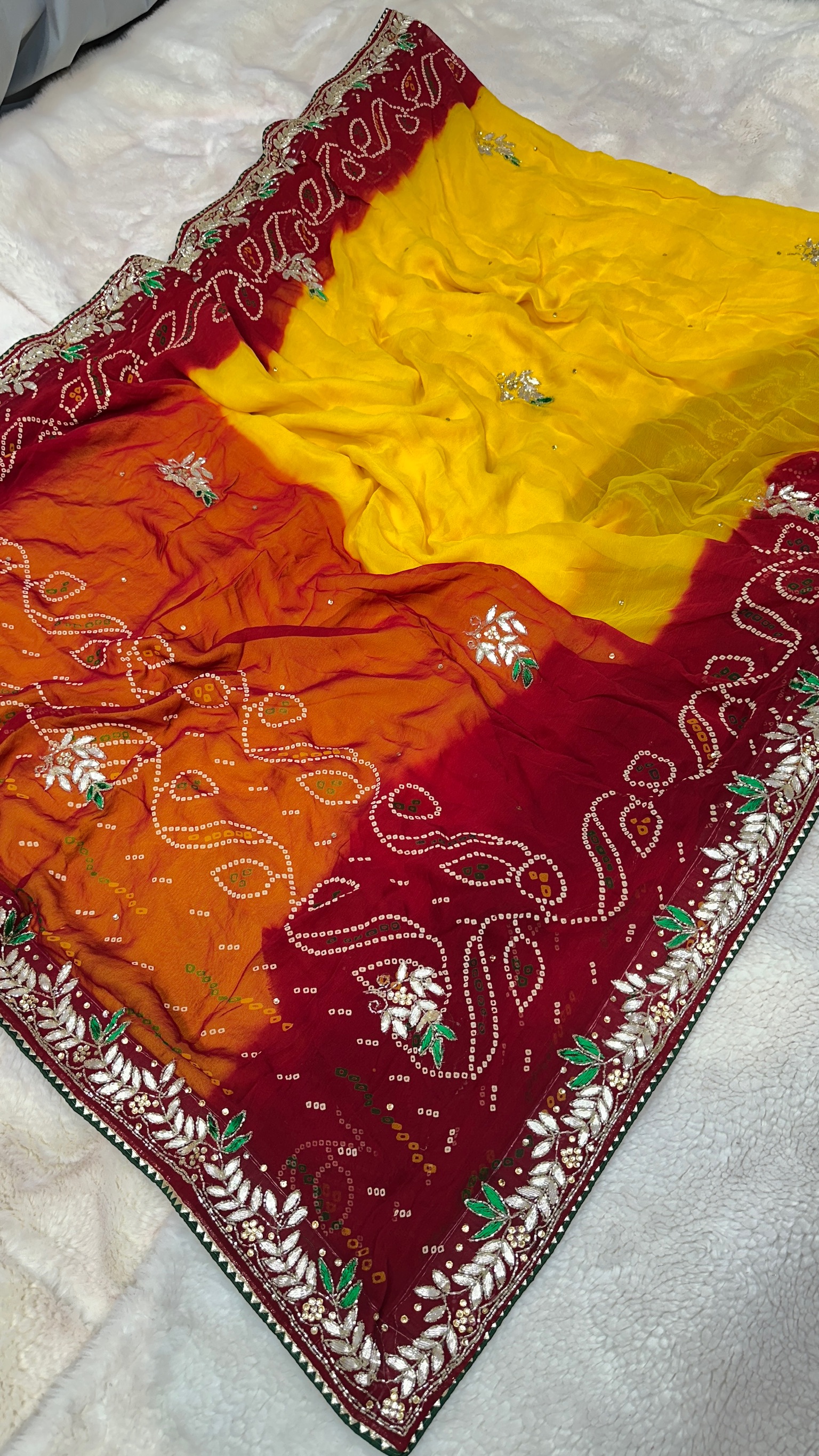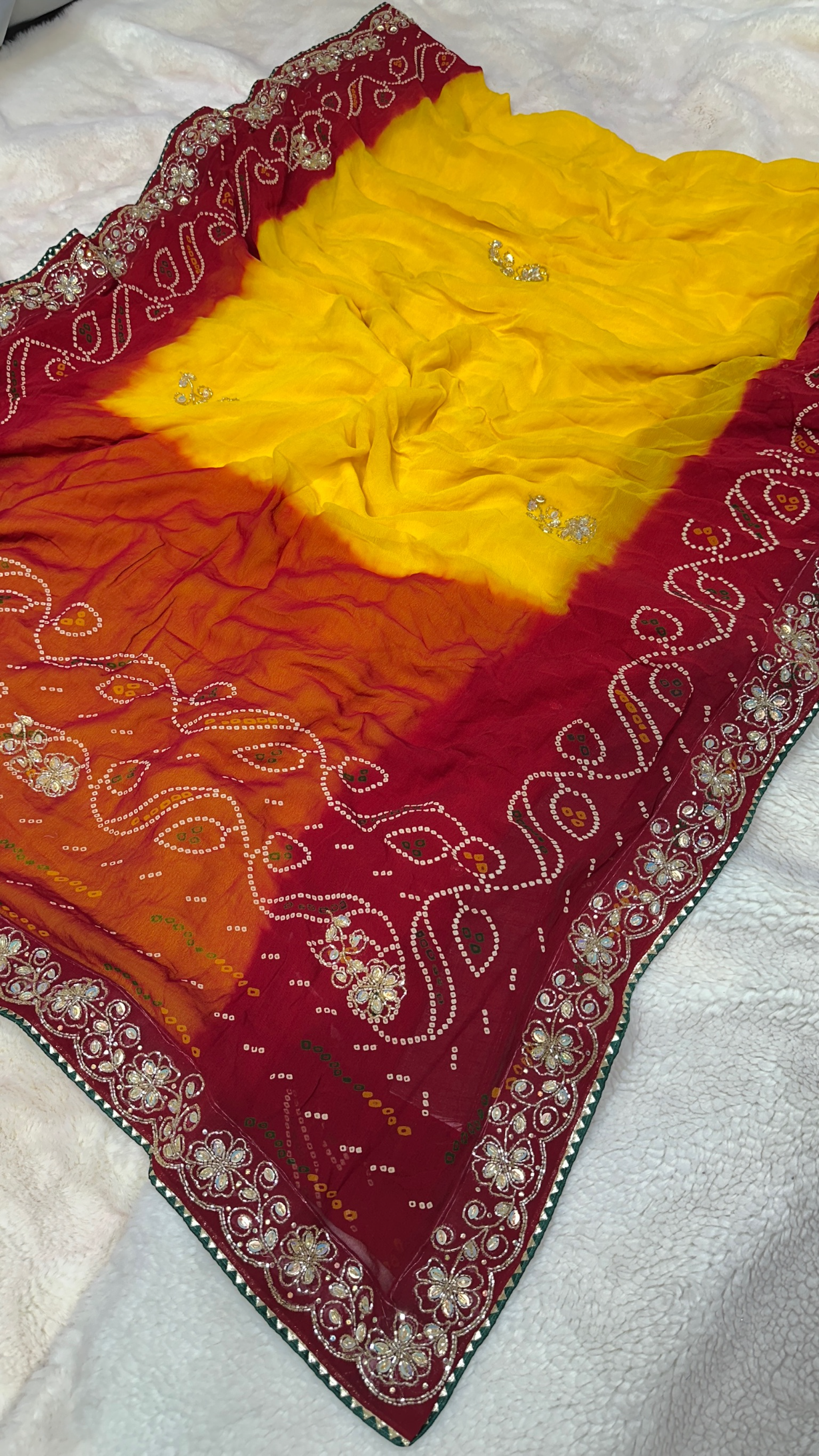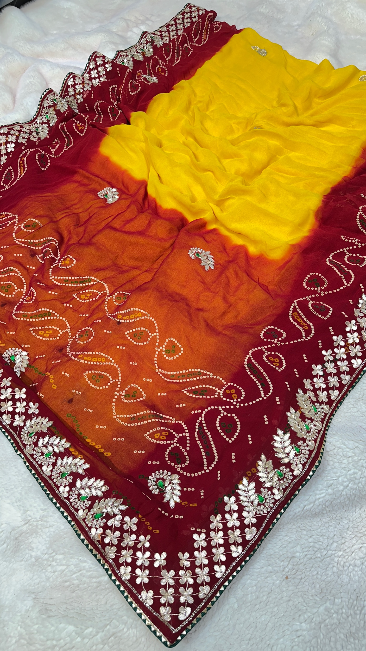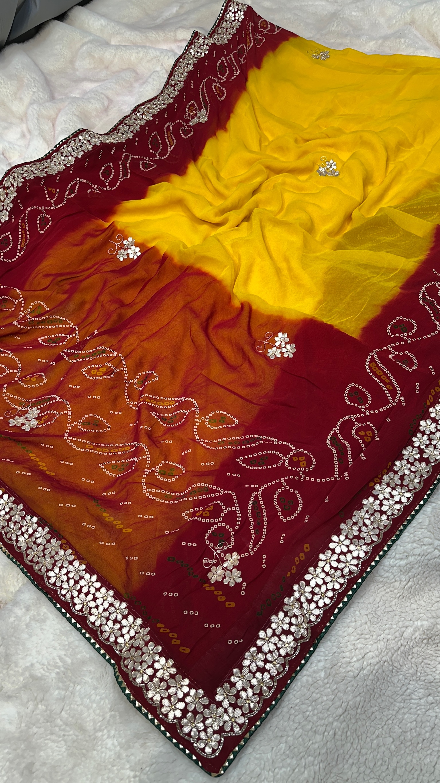 Elegant Traditional Peela Saree in Georgette with Handmade Kundan Patti Embroidery