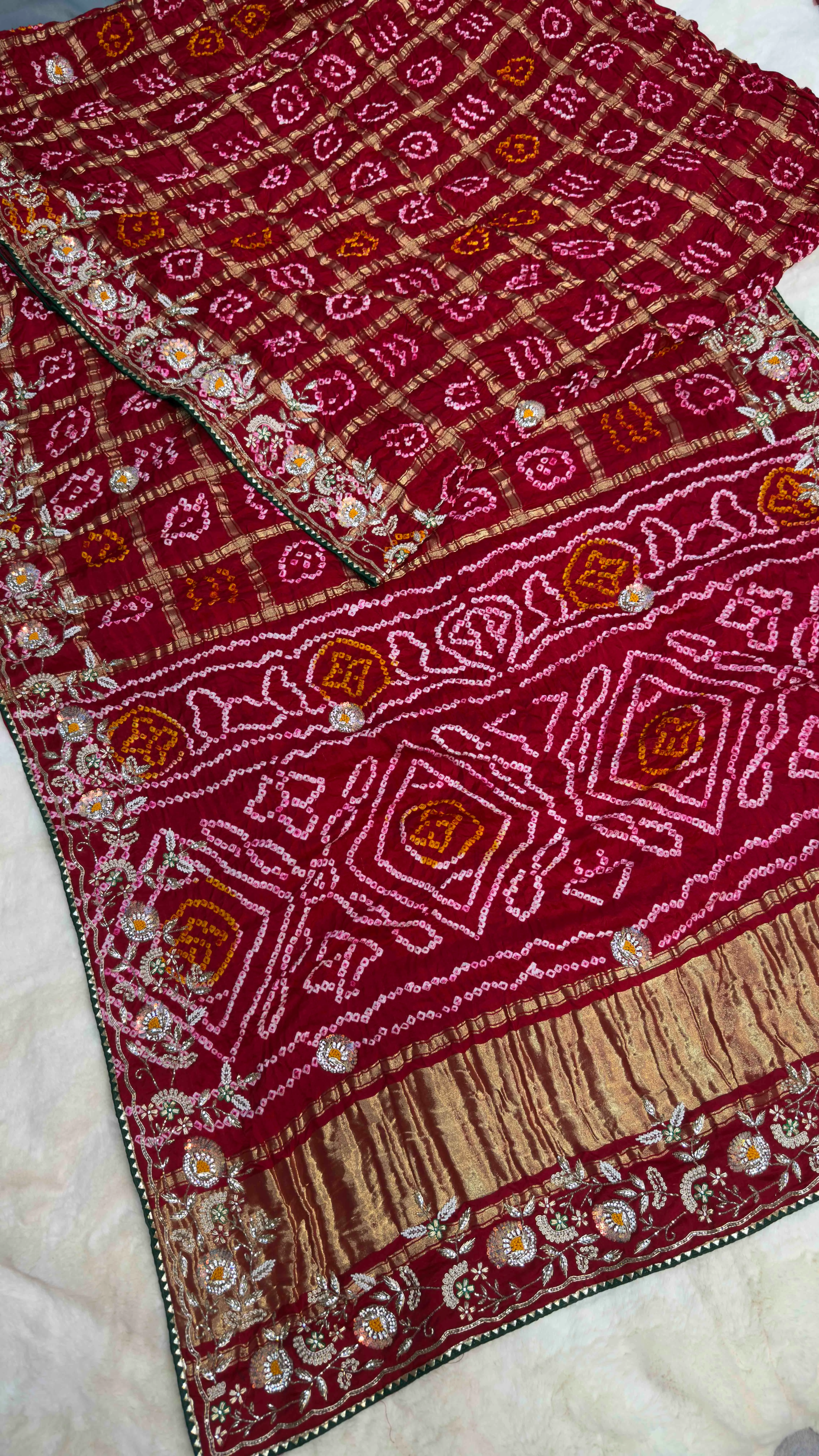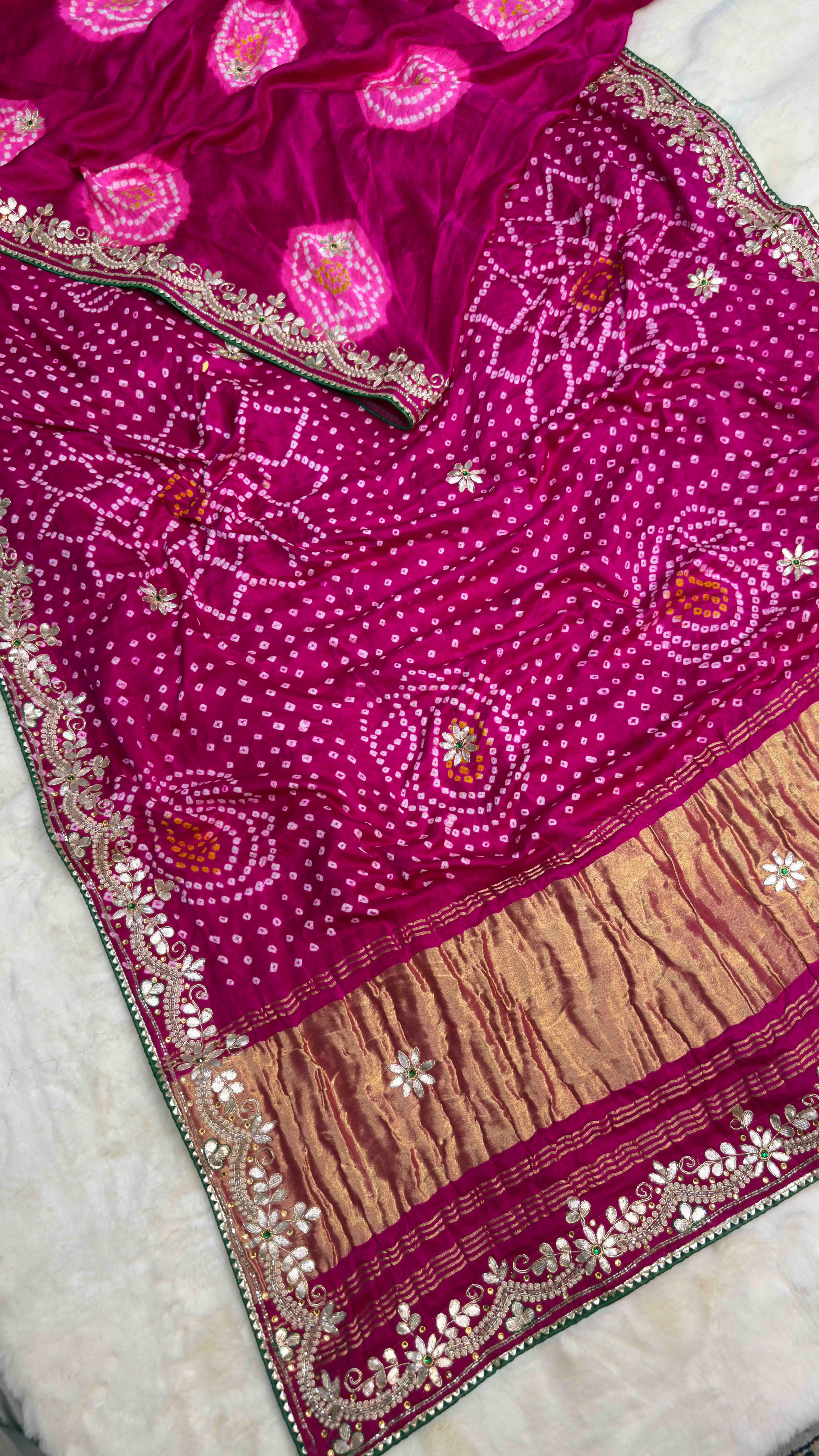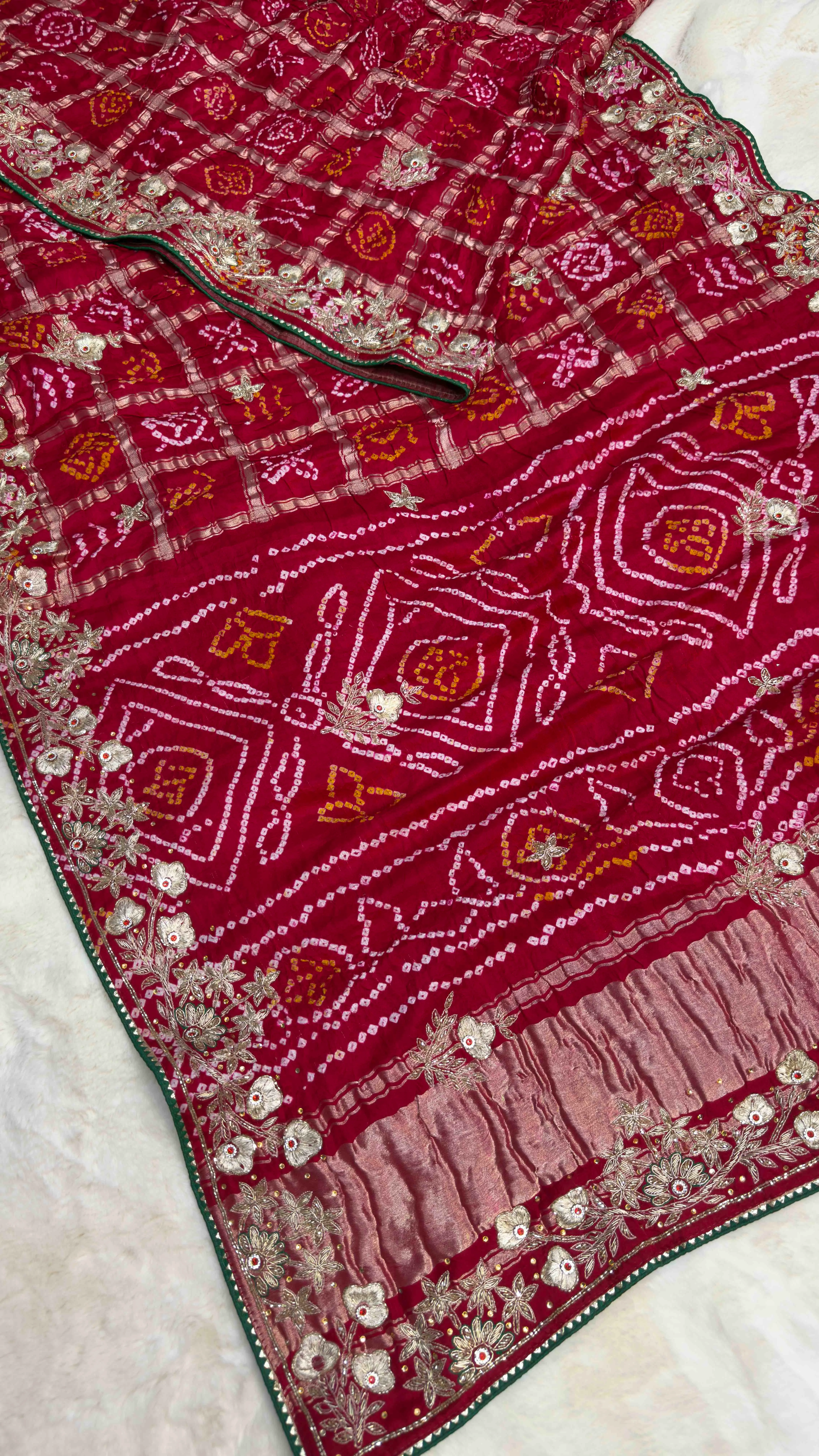 Luxury Pure Gaji Silk Saree with Zardozi Dabka Kundan & Moti Hand Embroidery | Designer Ethnic Wear