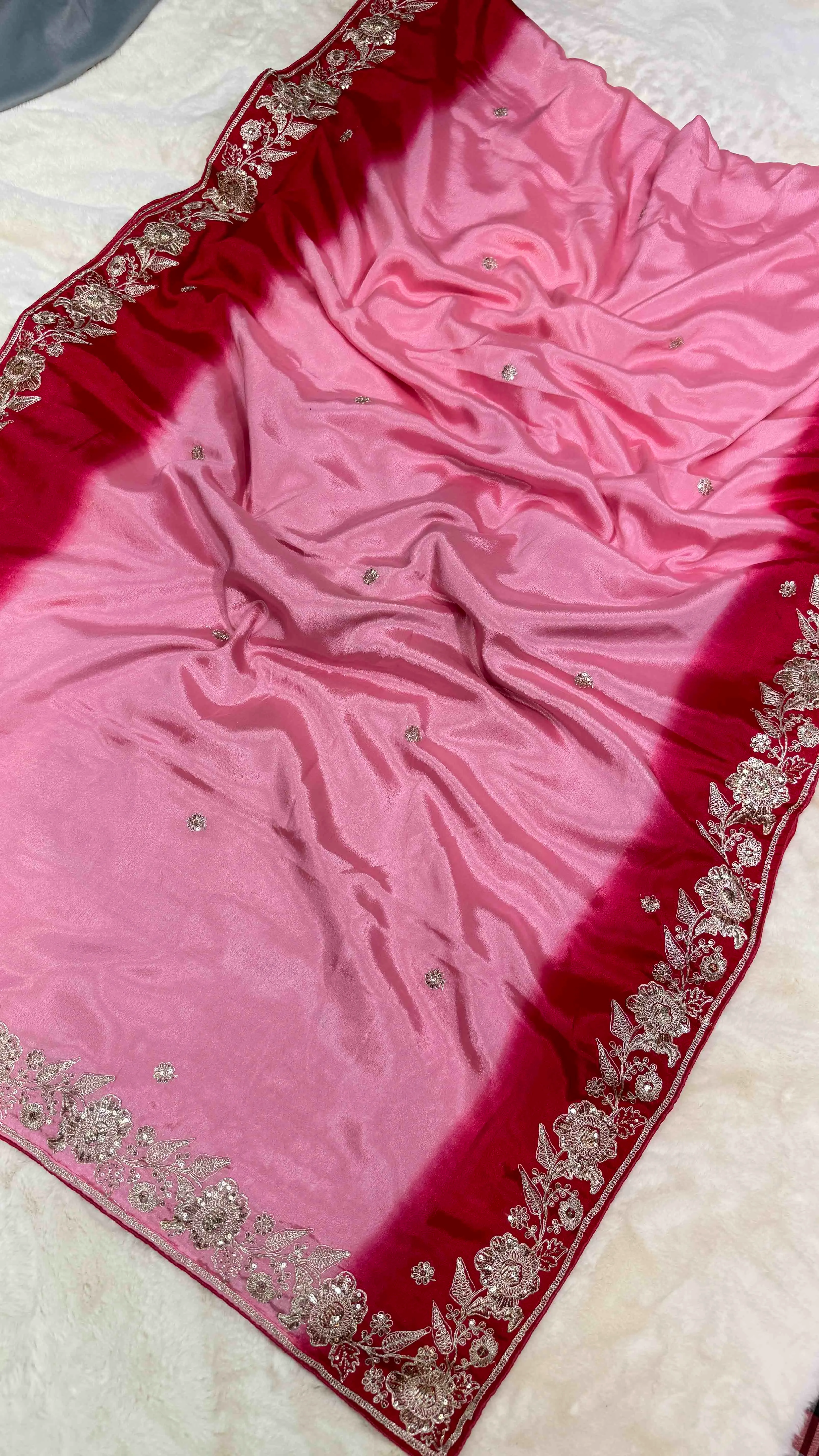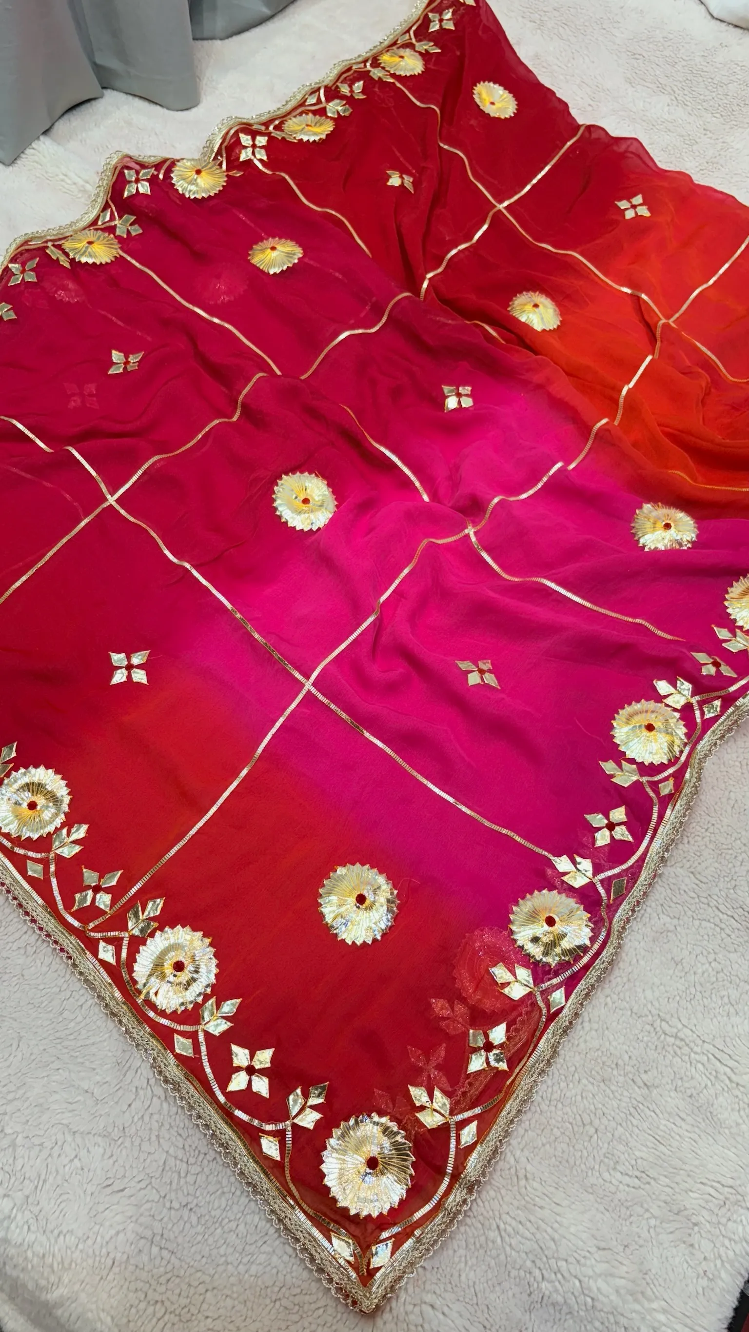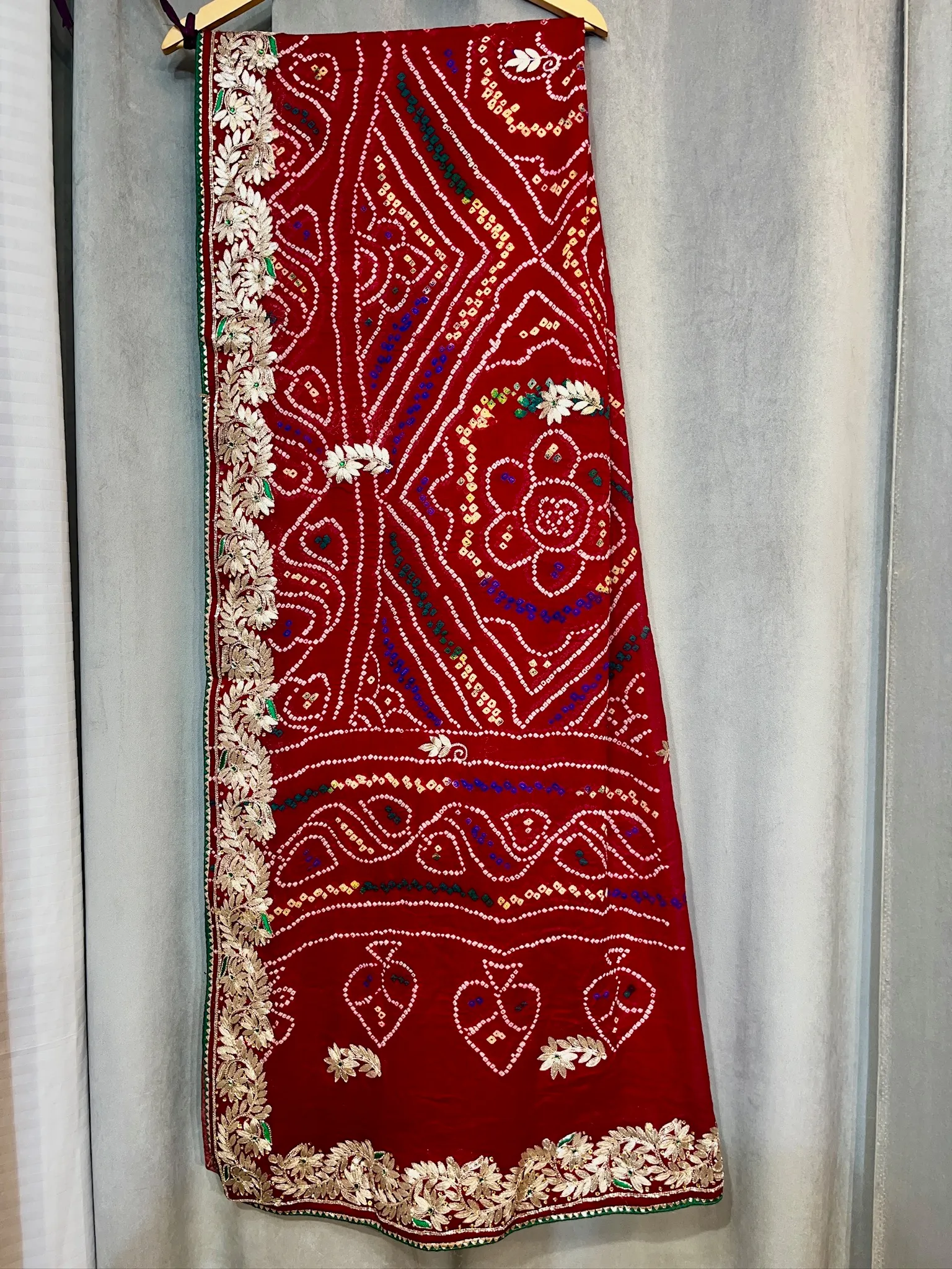 Elevate your ethnic look with this stunning Bandhej Dupatta Paver Ojariya in soft crêpe fabric. Adorned with intricate handmade Kundan, Zardozi, and Gotta Patti work, it’s perfect for weddings, festivals, and festive celebrations.