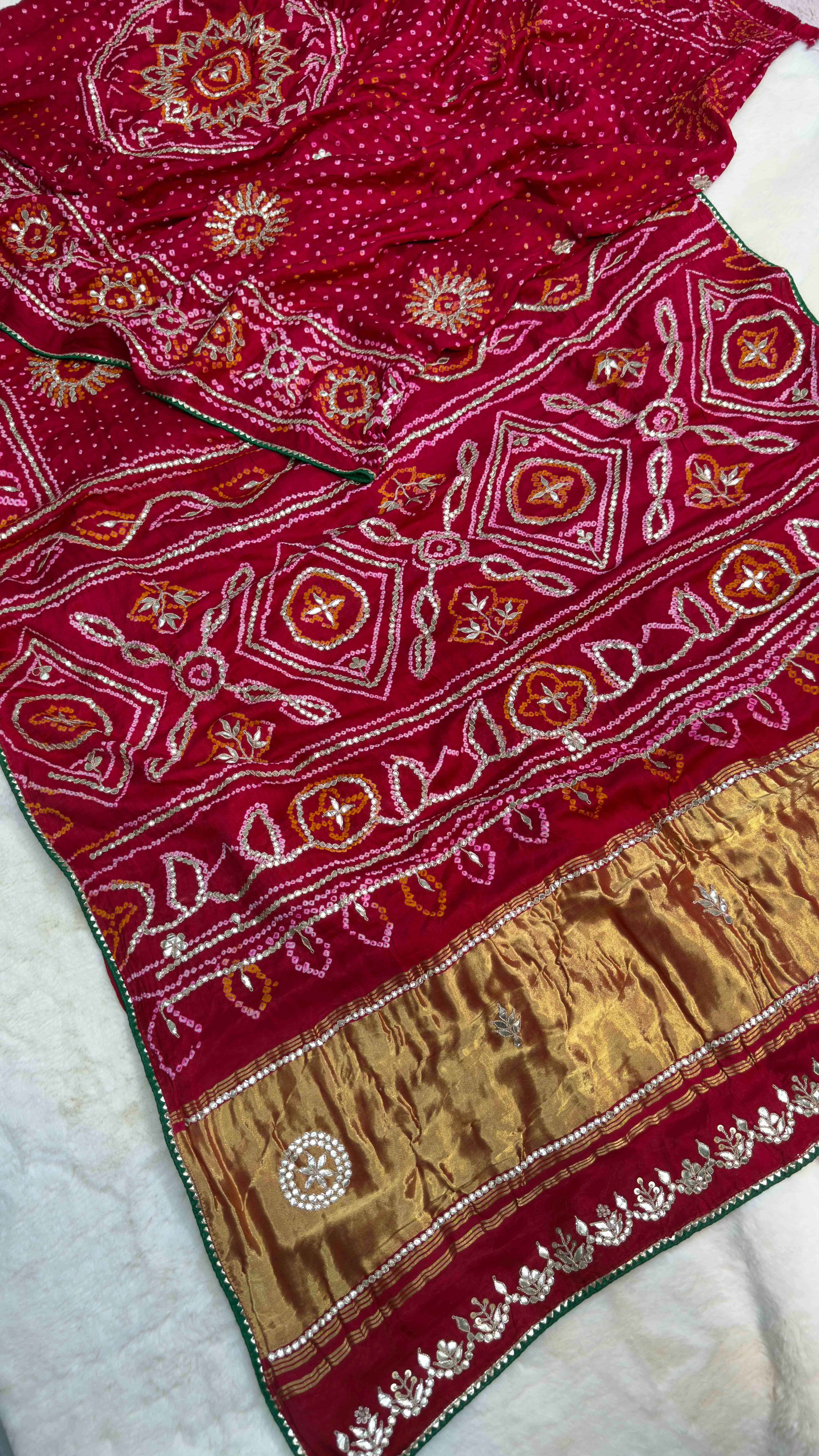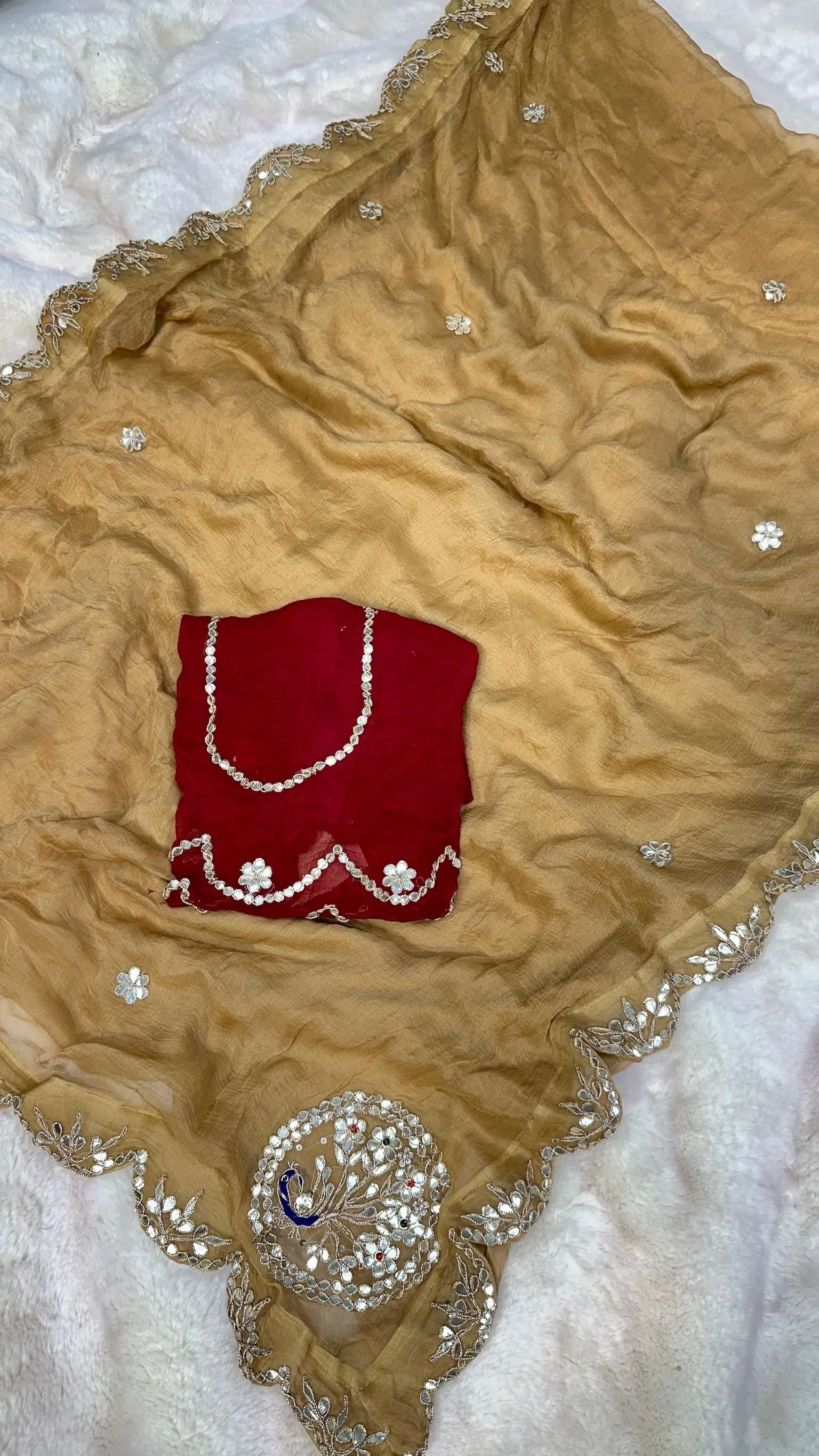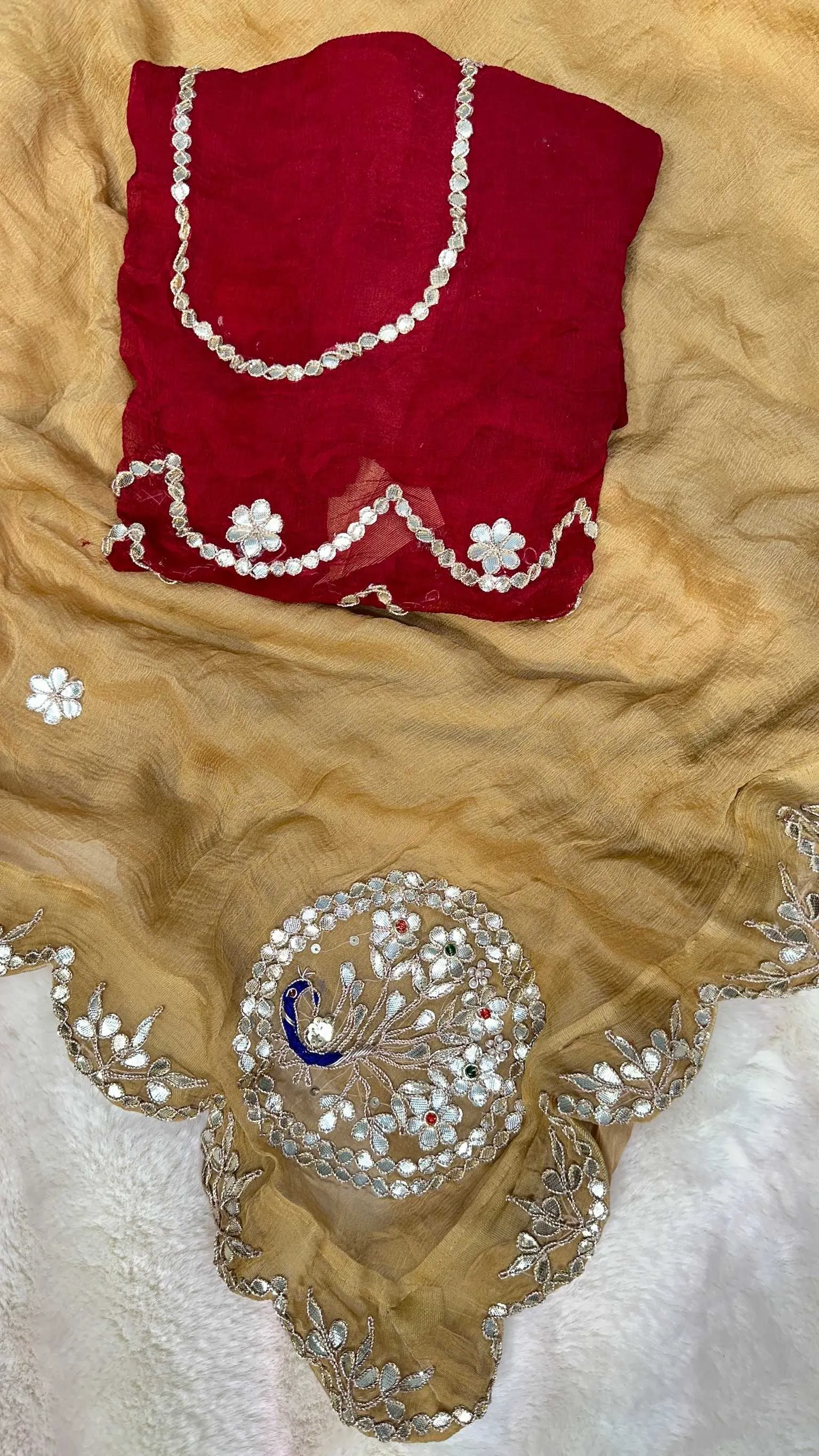 Elevate your ethnic wardrobe with this elegant pure chiffon designer saree featuring delicate zero gotta patti embroidery. The lightweight, flowy fabric ensures a graceful drape, while the eye-catching contrast blouse enhances its festive appeal. Perfect for weddings, parties, and traditional celebrations.