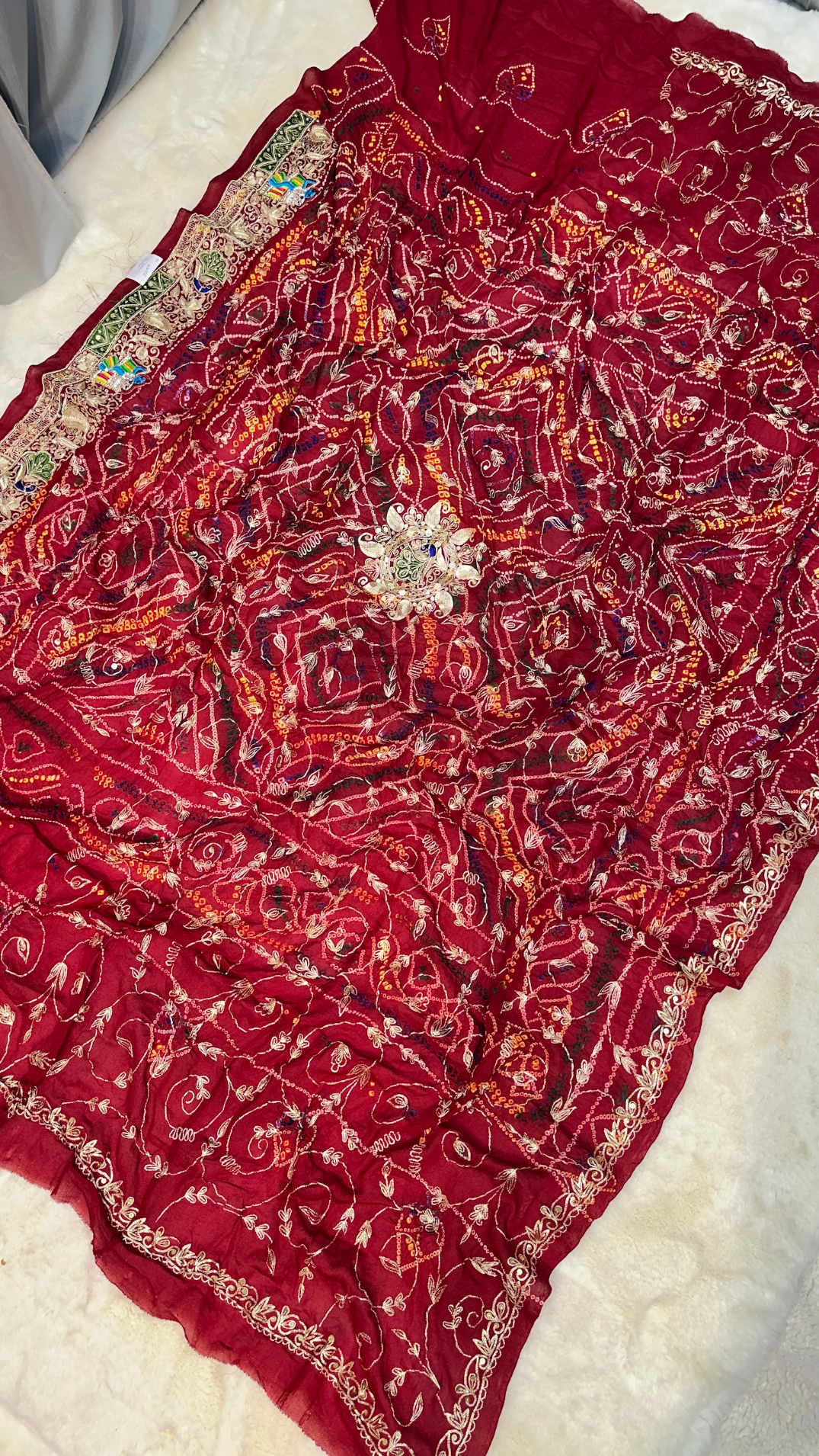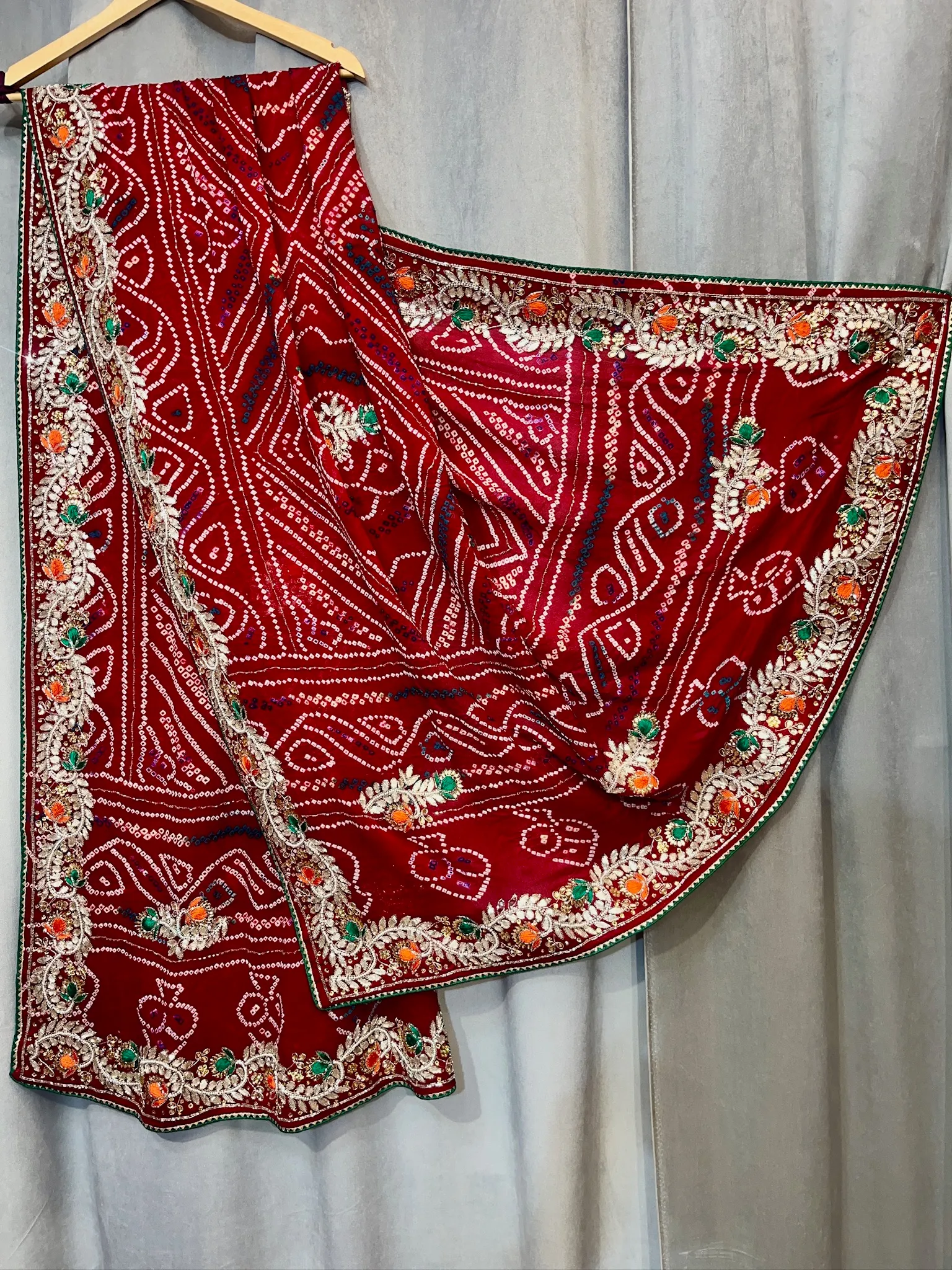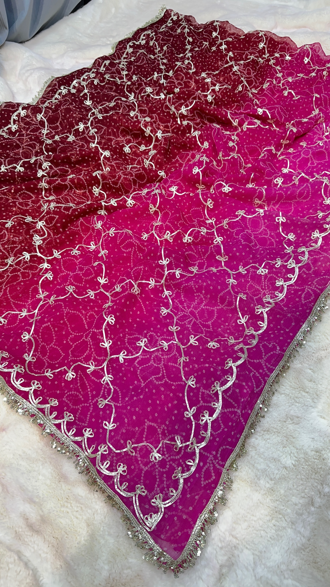 Elevate your ethnic wardrobe with this elegant pure chiffon designer saree featuring delicate zero gotta patti embroidery. The lightweight, flowy fabric ensures a graceful drape, while the eye-catching contrast blouse enhances its festive appeal. Perfect for weddings, parties, and traditional celebrations.