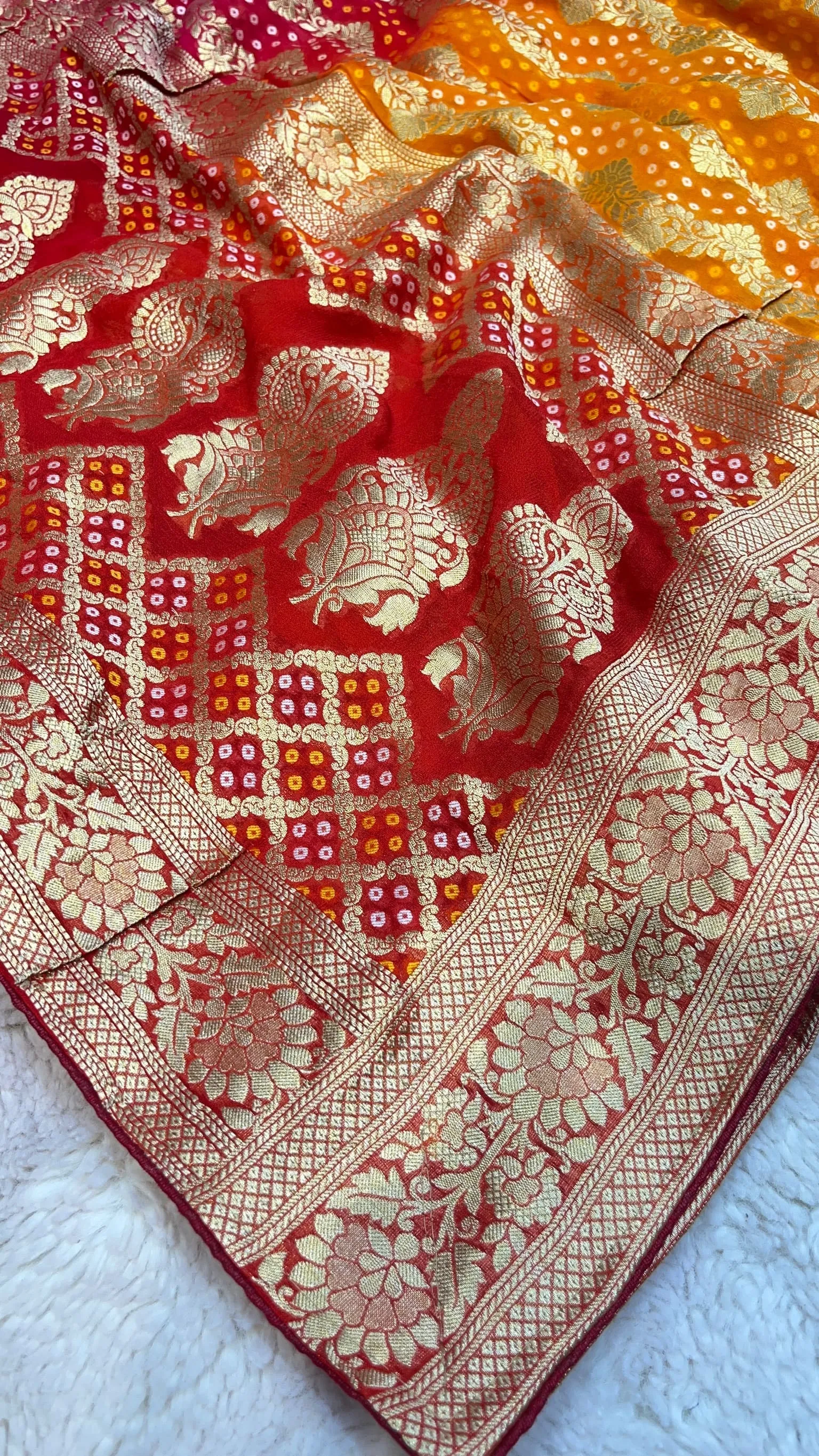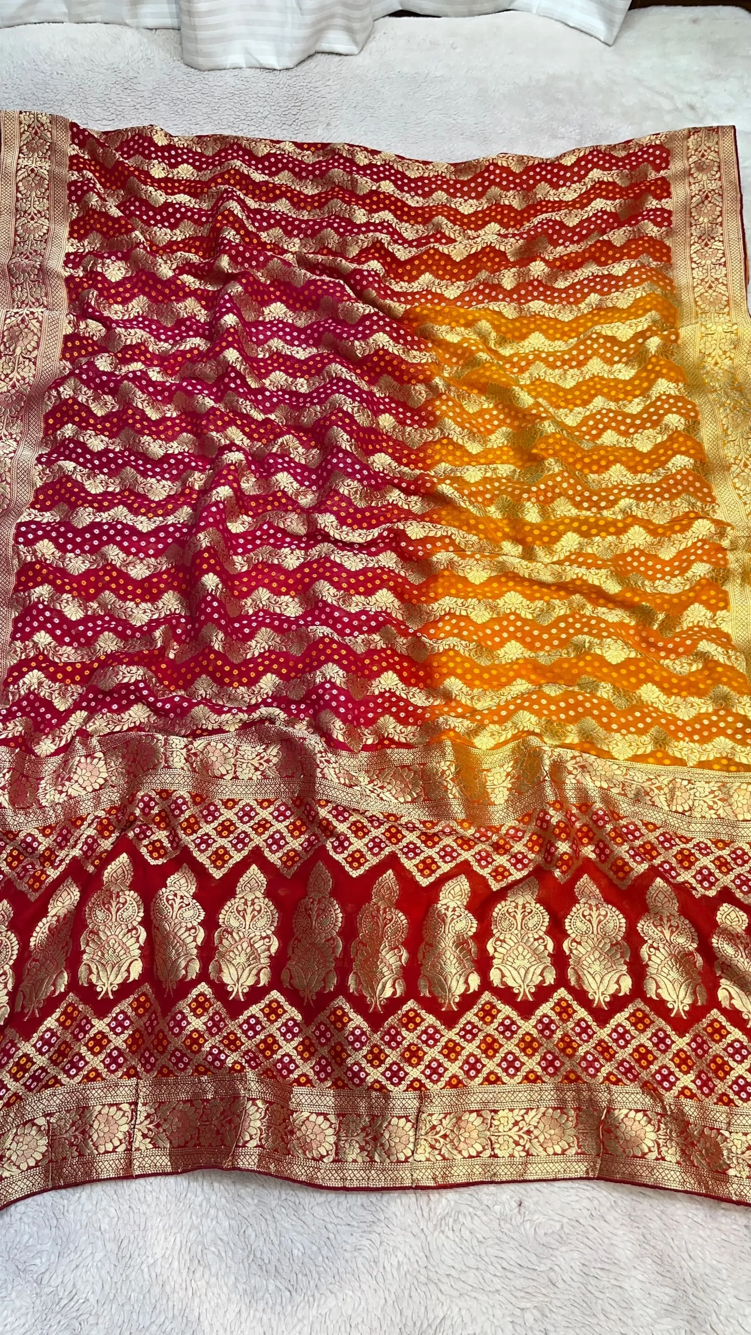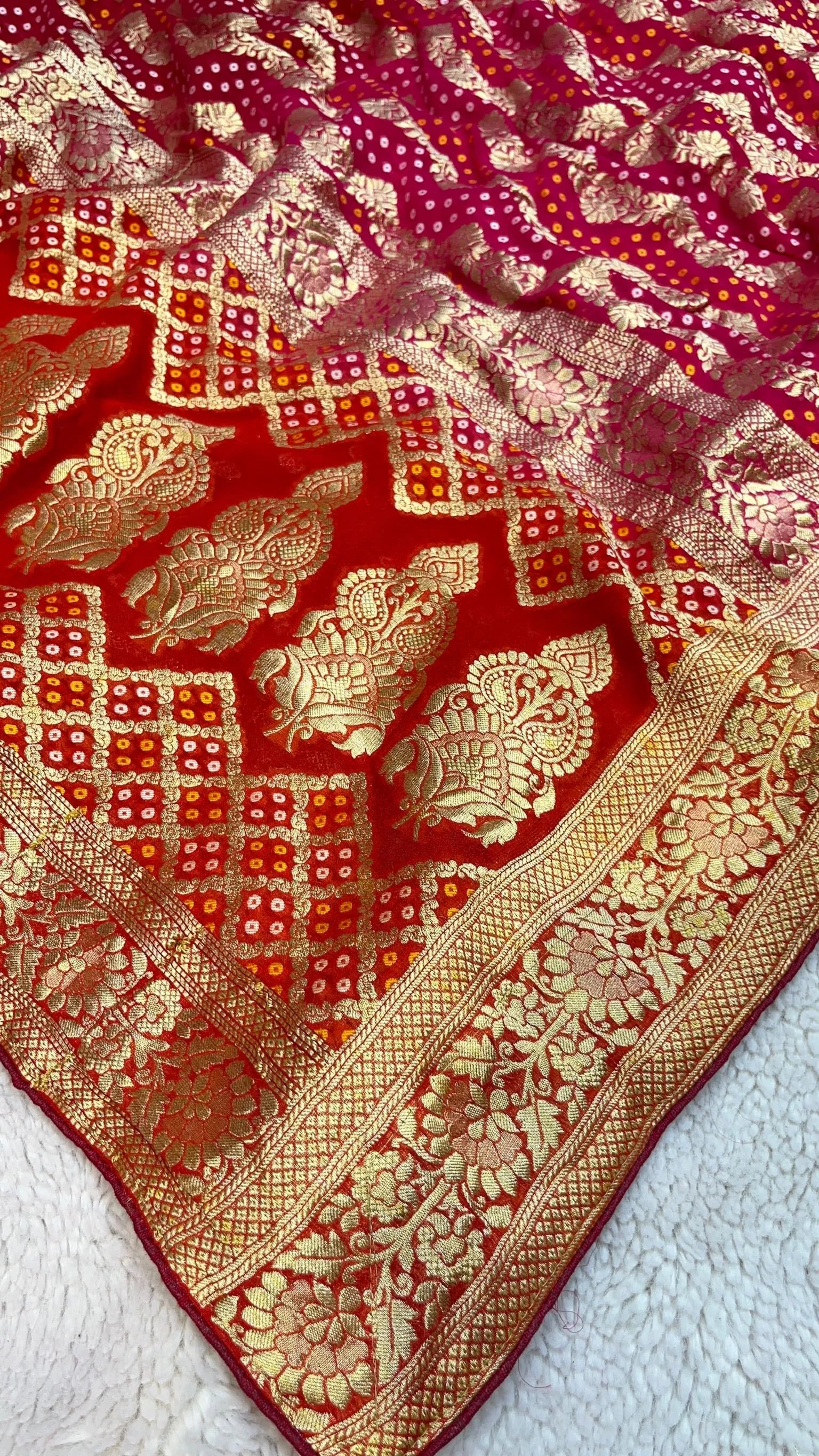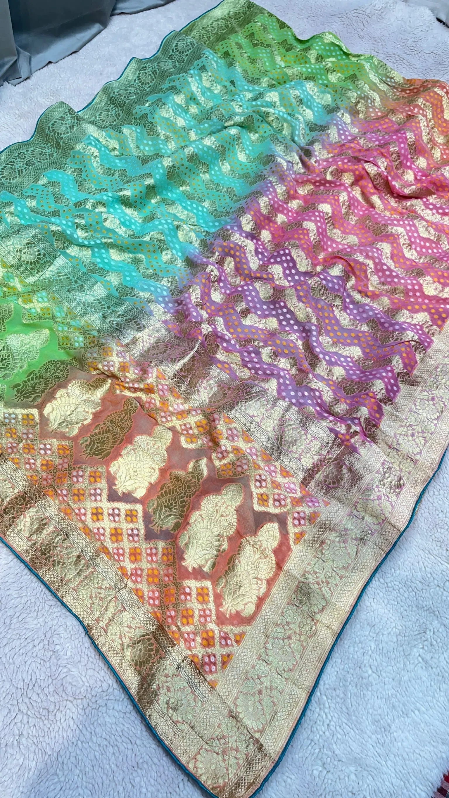 Elevate your ethnic style with this pure khadi georgette Bandhni saree featuring rich all-over zari work. The shaded box-dye color palette adds modern elegance, perfect for weddings, festive occasions, and celebrations.