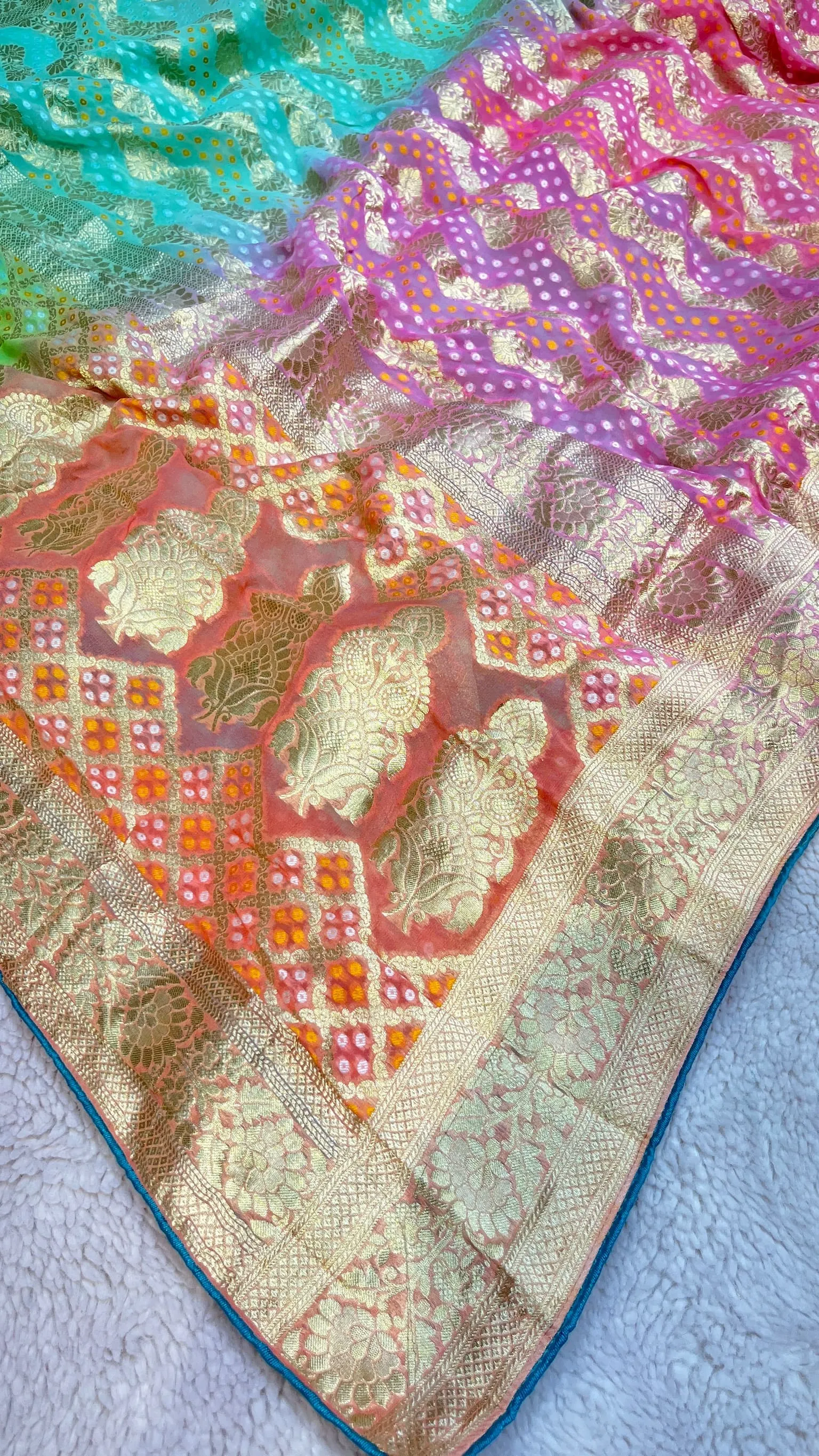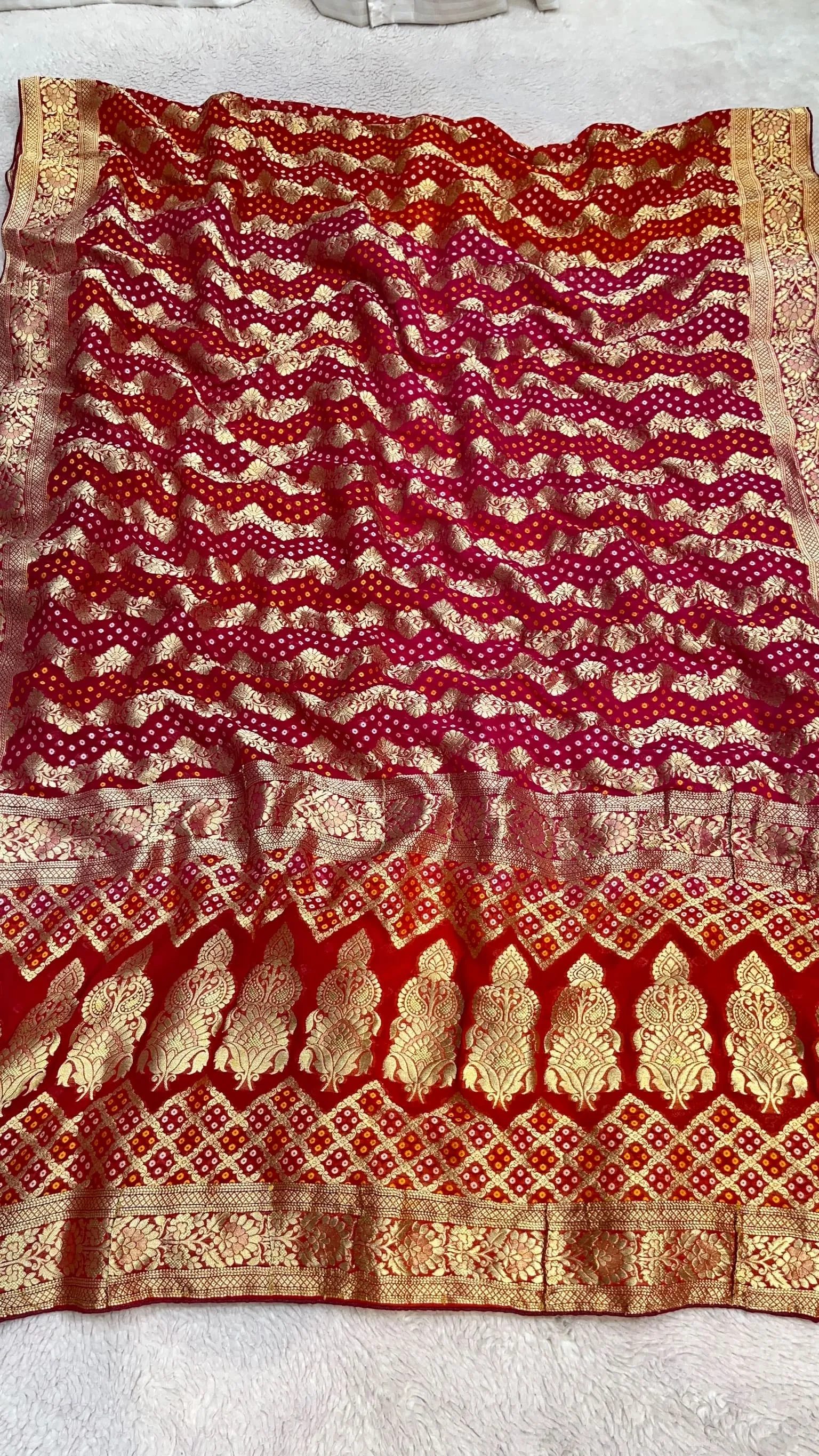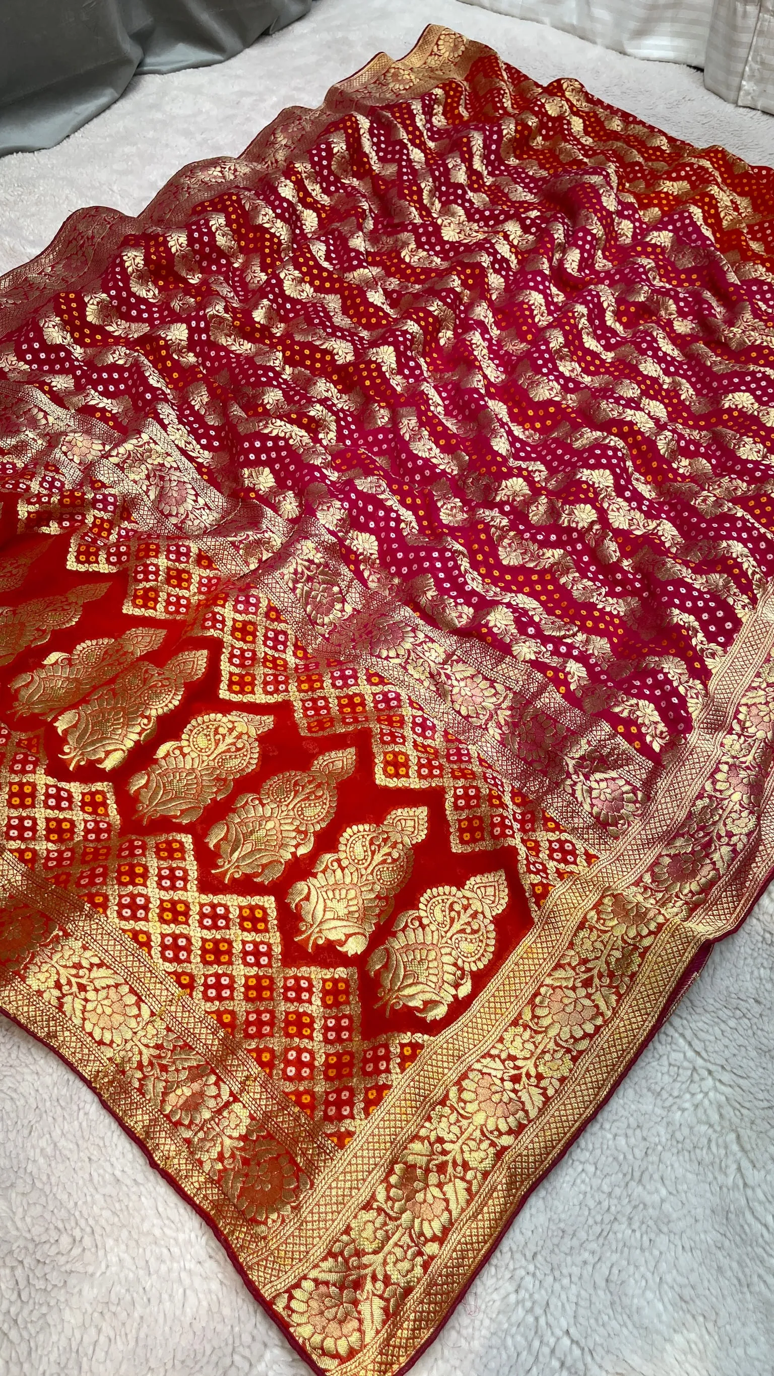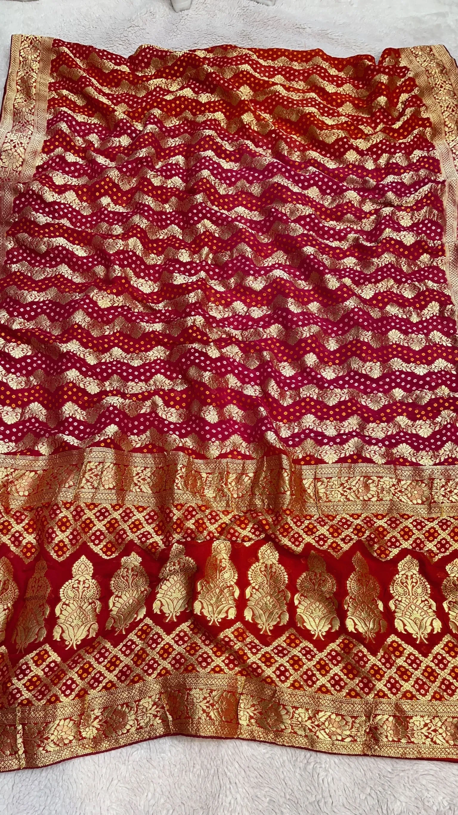 Elevate your ethnic style with this pure khadi georgette Bandhni saree featuring rich all-over zari work. The shaded box-dye color palette adds modern elegance, perfect for weddings, festive occasions, and celebrations.