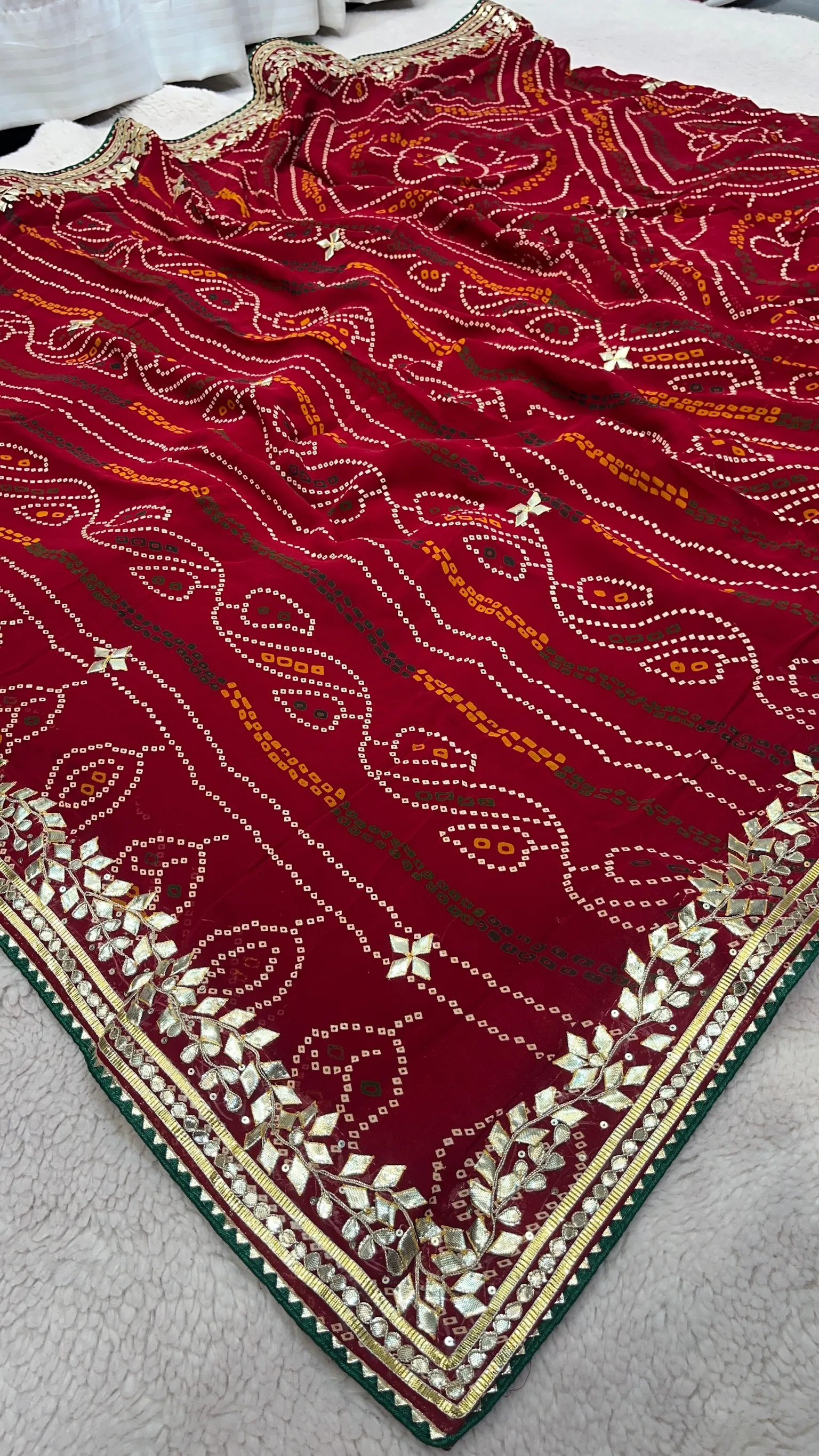 Step into elegance with this traditional Chundri Bandhej saree in pure viscose georgette. Highlighted by handcrafted Gotta Patti embroidery, this saree brings a perfect mix of ethnic sophistication and festive glamour. Perfect for weddings, parties, and family celebrations.