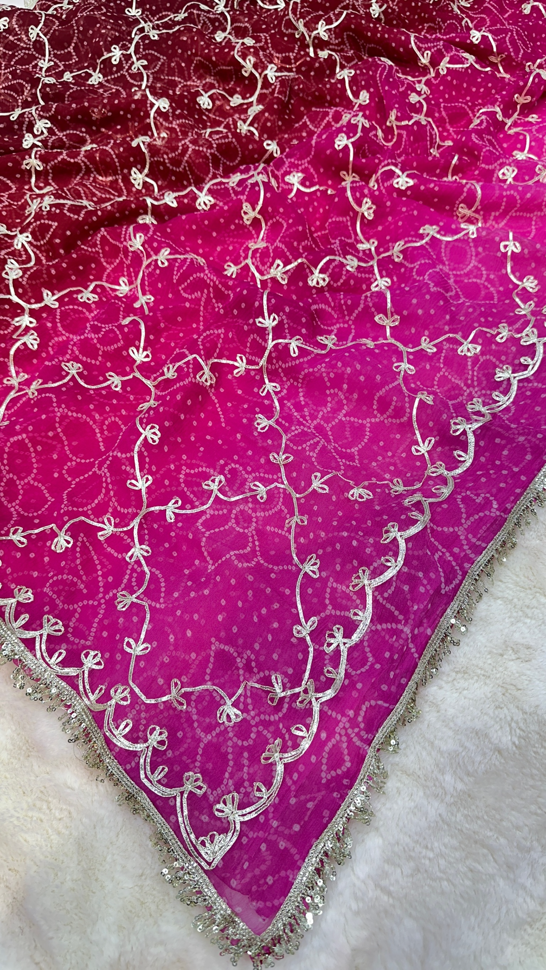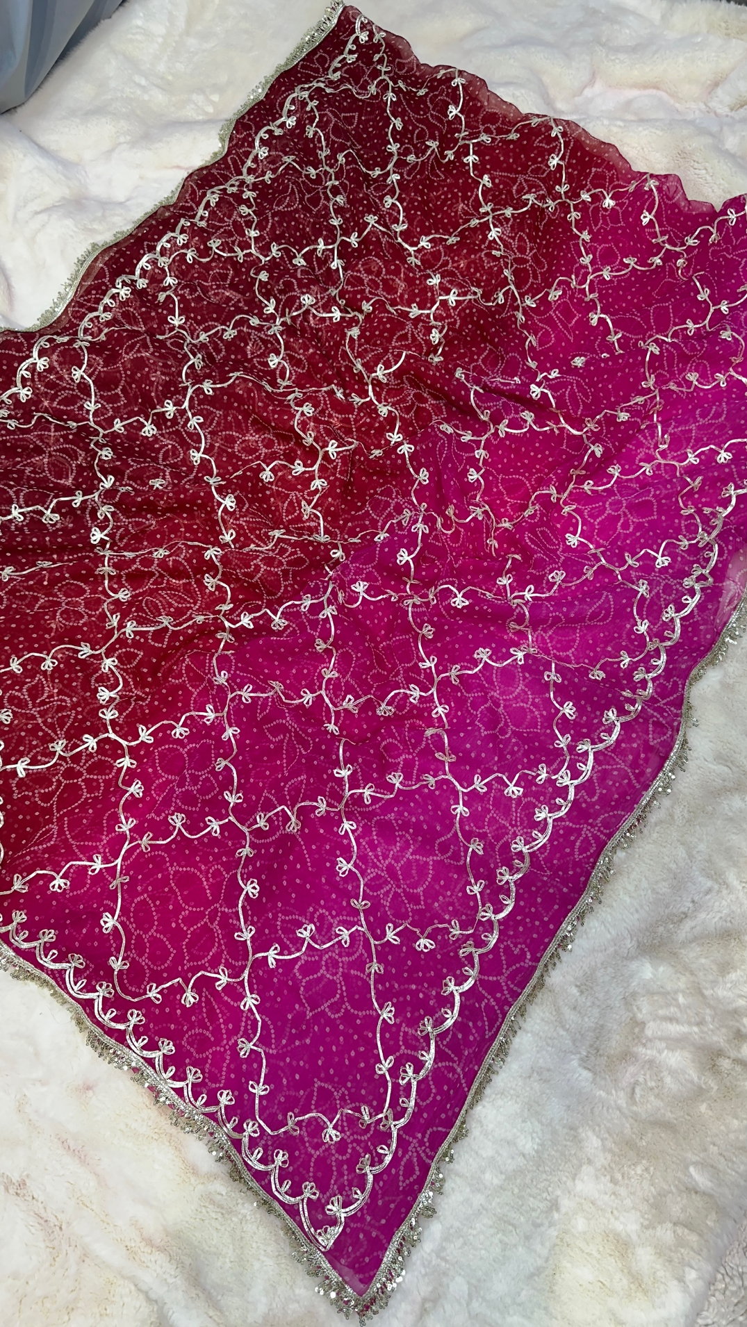 Elevate your ethnic wardrobe with this trending Bandhej saree crafted from premium fine georgette fabric. Featuring intricate kaccha gotta zaal work, this saree blends traditional artistry with modern elegance. Lightweight, flowy, and perfect for weddings, festive occasions, and special events.