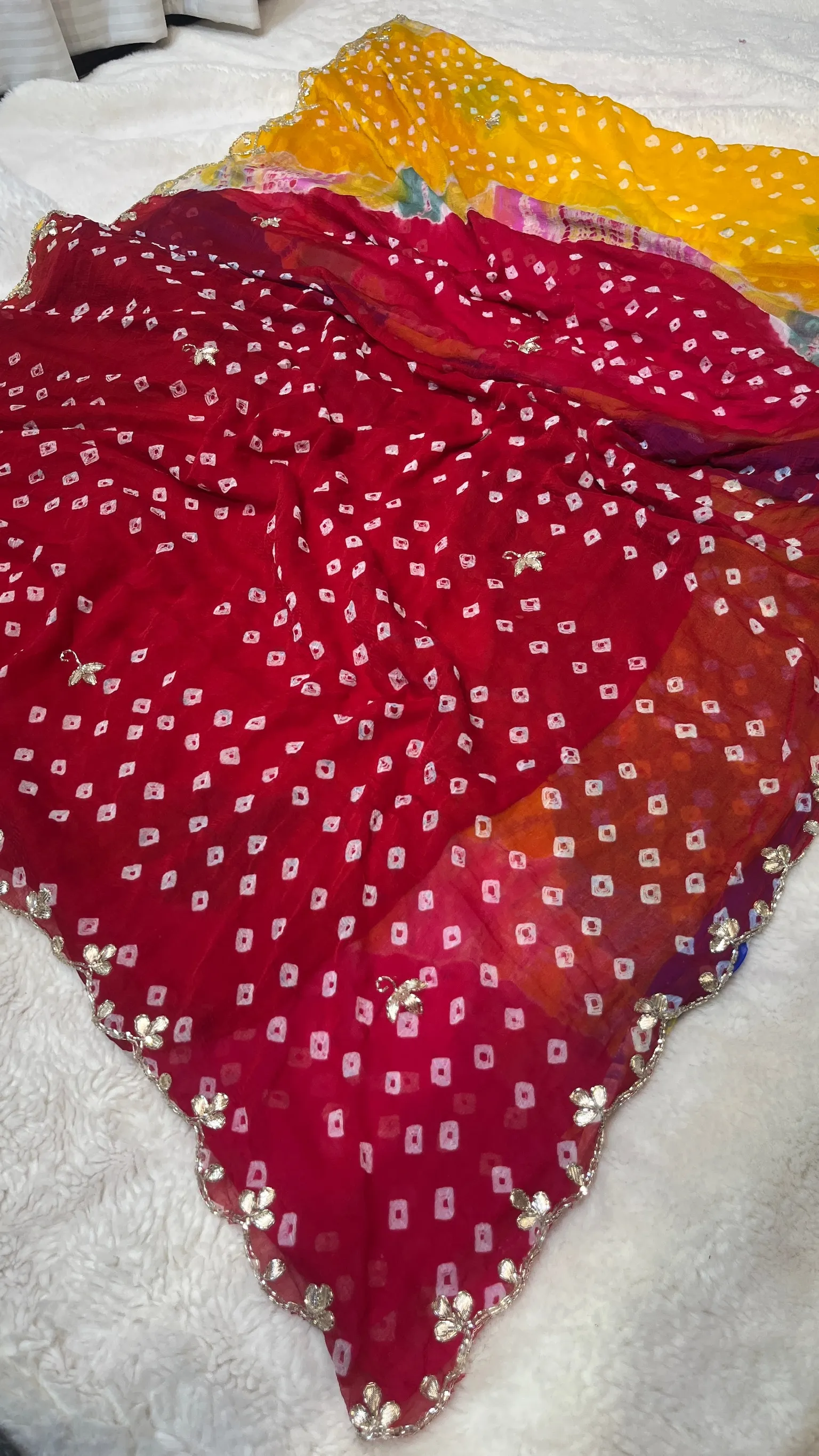 Featuring the classic Bandhej (tie-dye) pattern, this saree reflects rich Indian heritage and timeless craftsmanship. The highlight is the intricate pipe gota patti work, which adds shimmering detail and elevates the overall look with a touch of refined luxury. Ideal for weddings, festivals, parties, and cultural events, this saree effortlessly blends tradition with modern style.