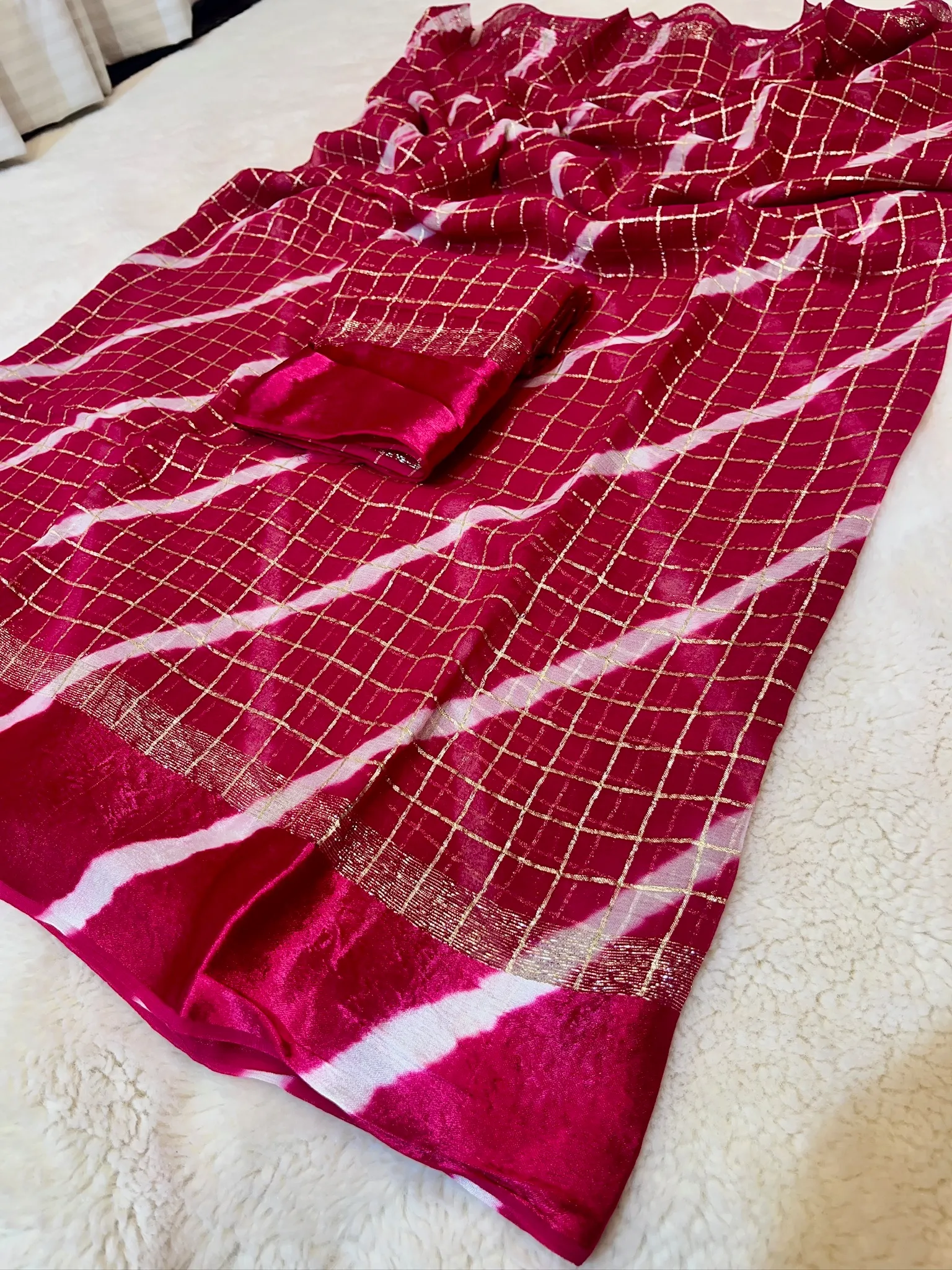 Refresh your ethnic wardrobe with this graceful chinon chiffon leheriya saree, designed for effortless elegance and comfort. Crafted from soft chinon chiffon fabric, this saree drapes beautifully and feels light on the skin, making it ideal for long festive and celebratory wear.