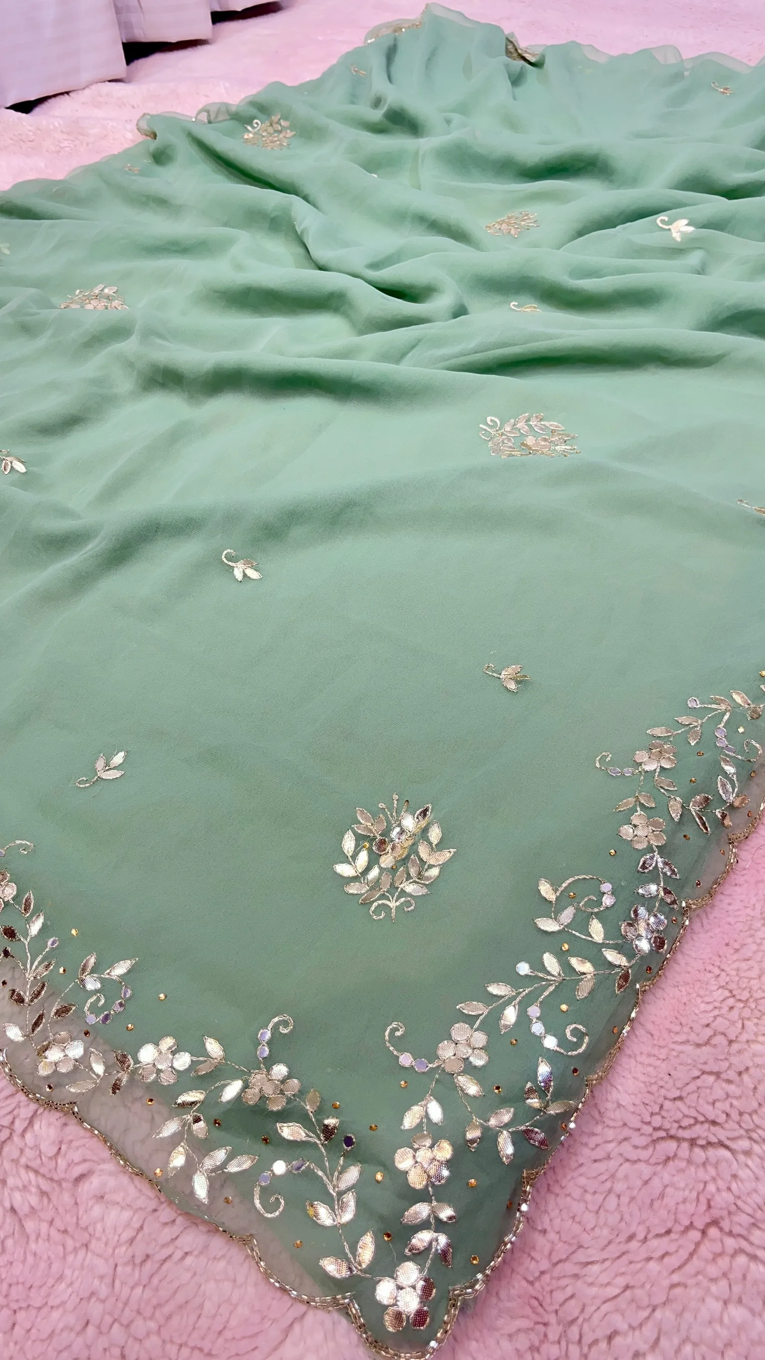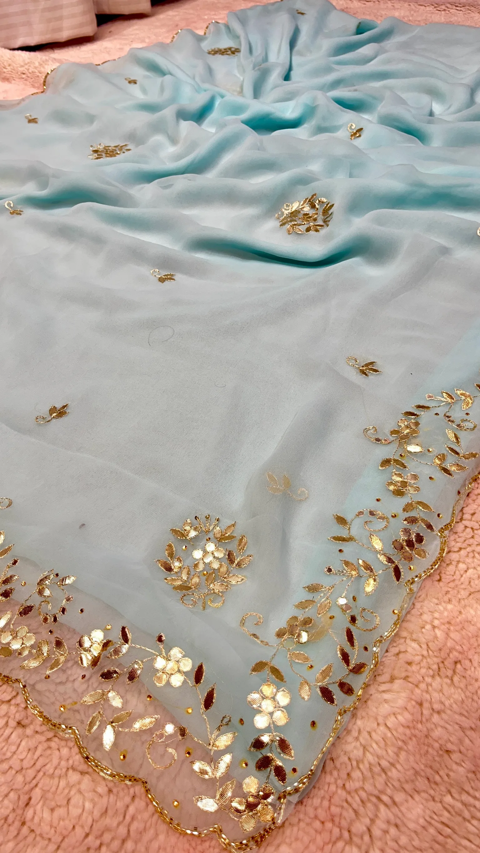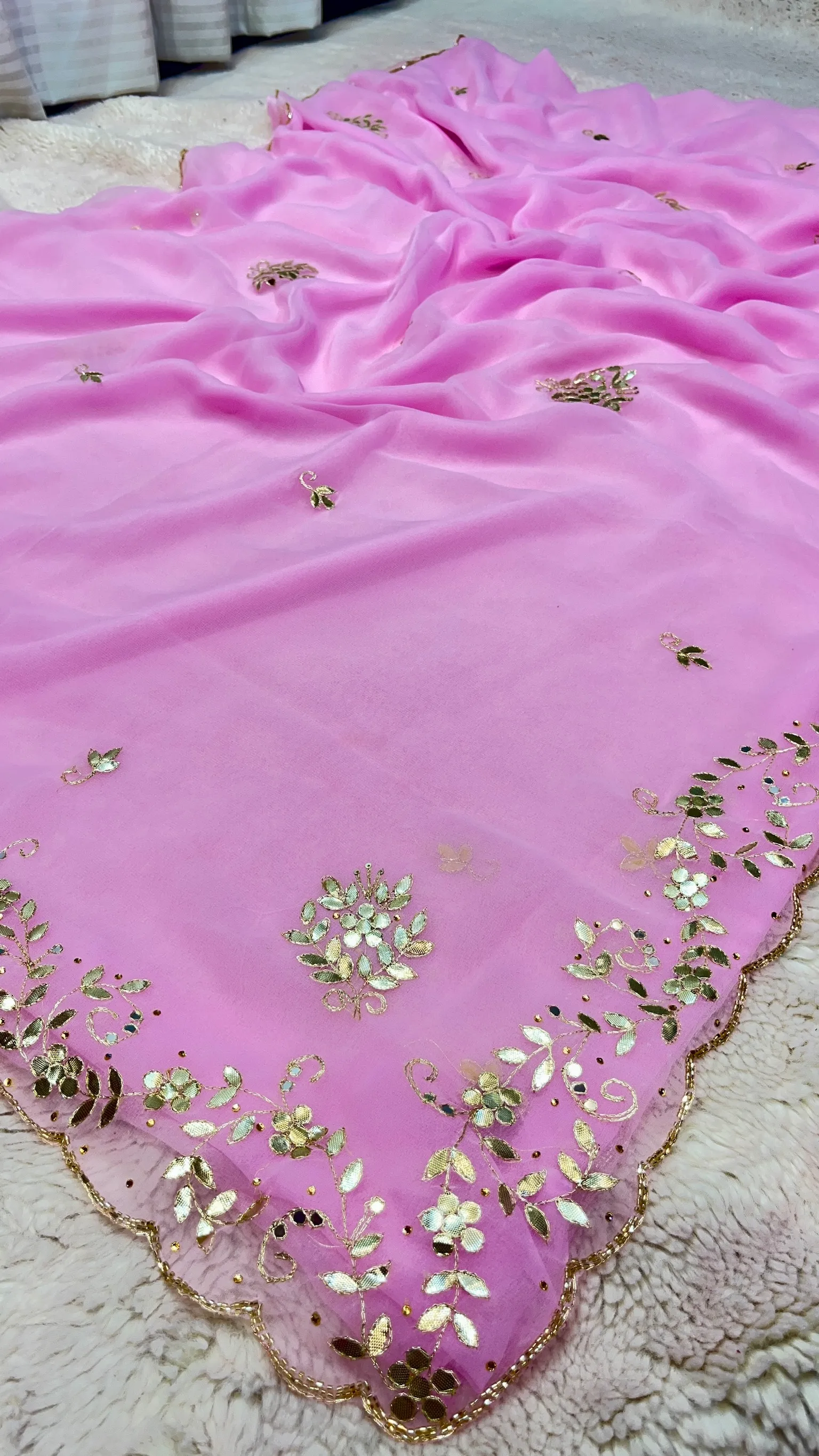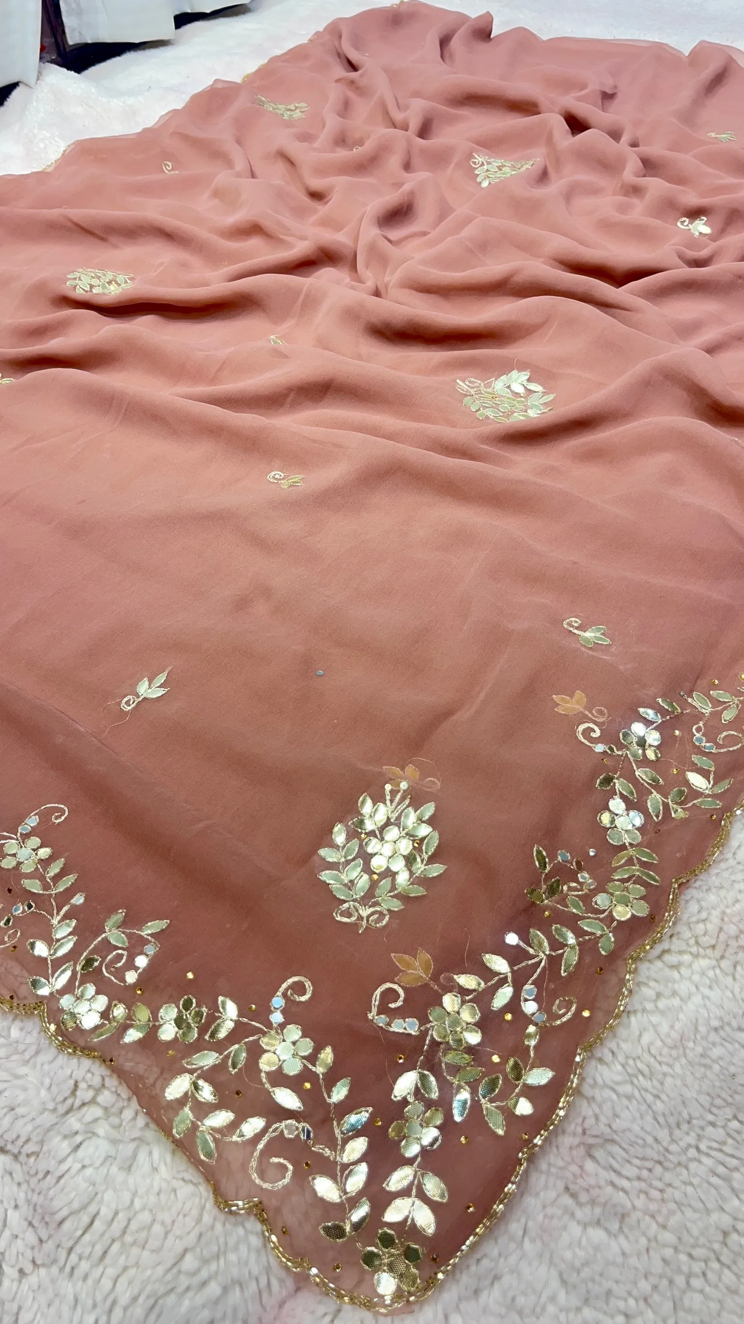 Style this chiffon gota patti saree with traditional jewelry and heels to complete a refined and elegant look.