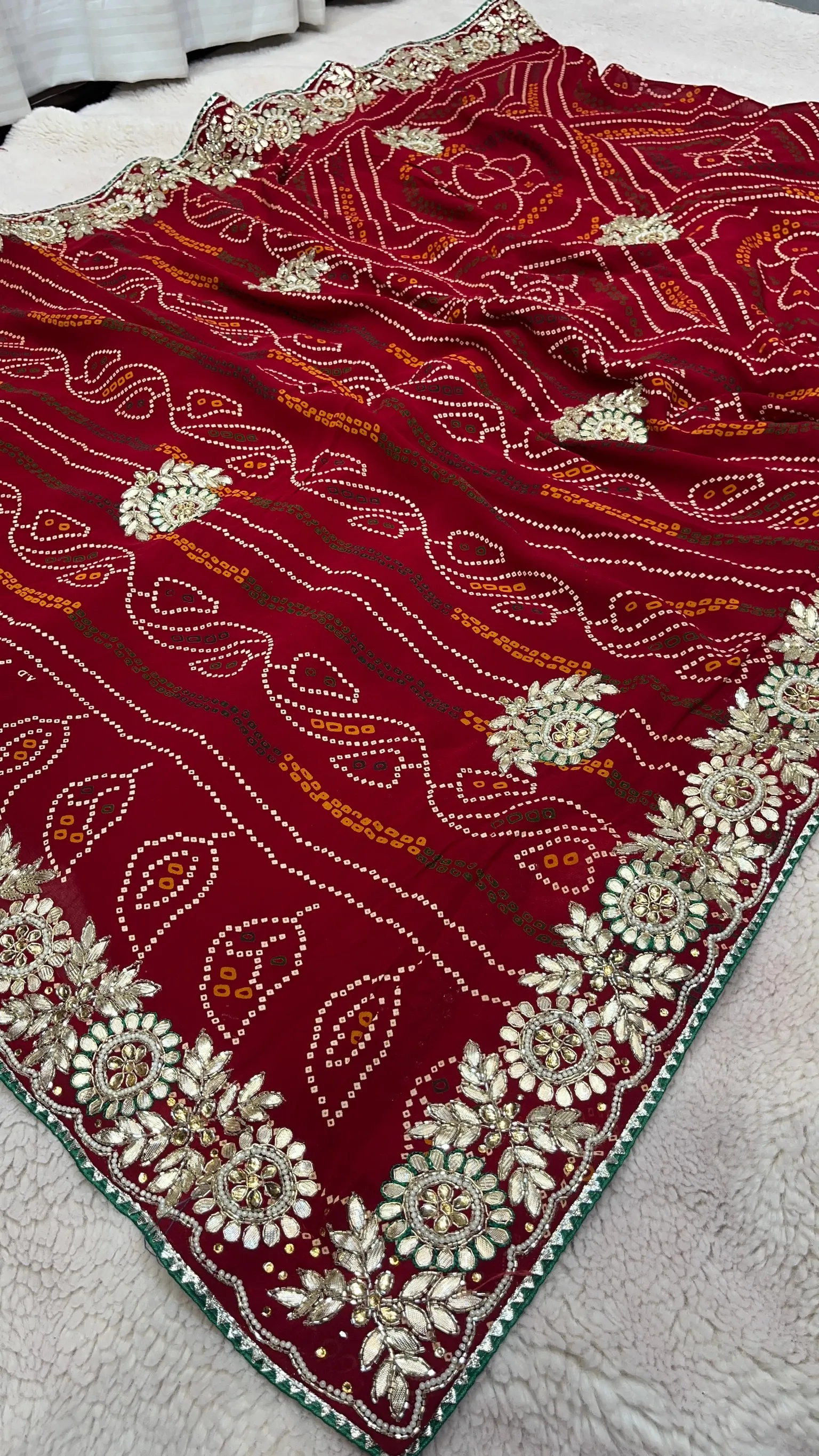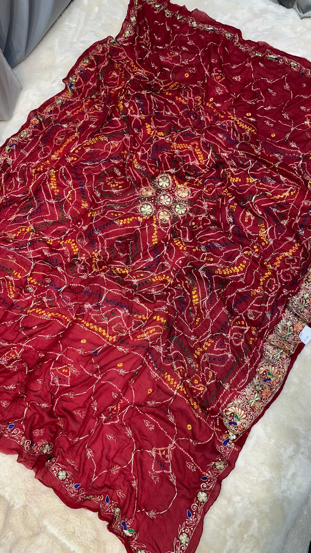 This Pure Khadi Georgette Dupatta is beautifully designed using traditional hand bandhej techniques on lightweight viscos georgette. Finished with delicate meena zari work, it adds charm and elegance to any ethnic ensemble.
