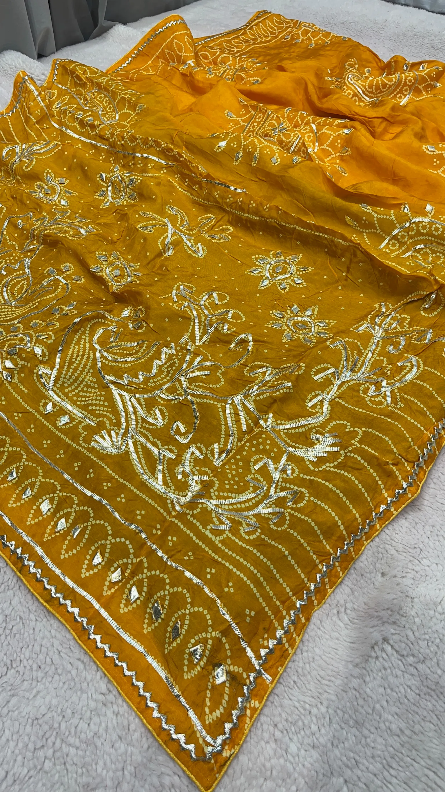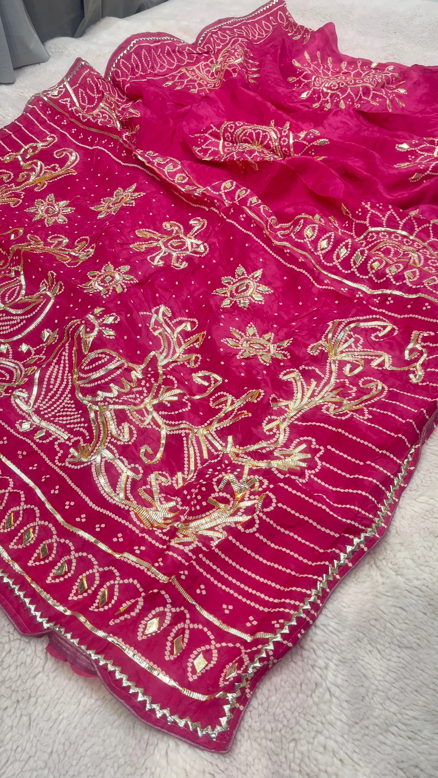 Celebrate timeless tradition with this exquisite HO Silk Bandhej Saree, designed to showcase the beauty of classic tie-dye artistry paired with fine hand embellishment. Crafted from rich HO silk, the saree offers a smooth texture and elegant drape, while the handmade Kaccha Gota Jaal work adds depth, shimmer, and artisanal charm. Ideal for weddings, festive occasions, and cultural celebrations, this saree blends heritage craftsmanship with refined elegance, making it a treasured addition to your ethnic wardrobe.