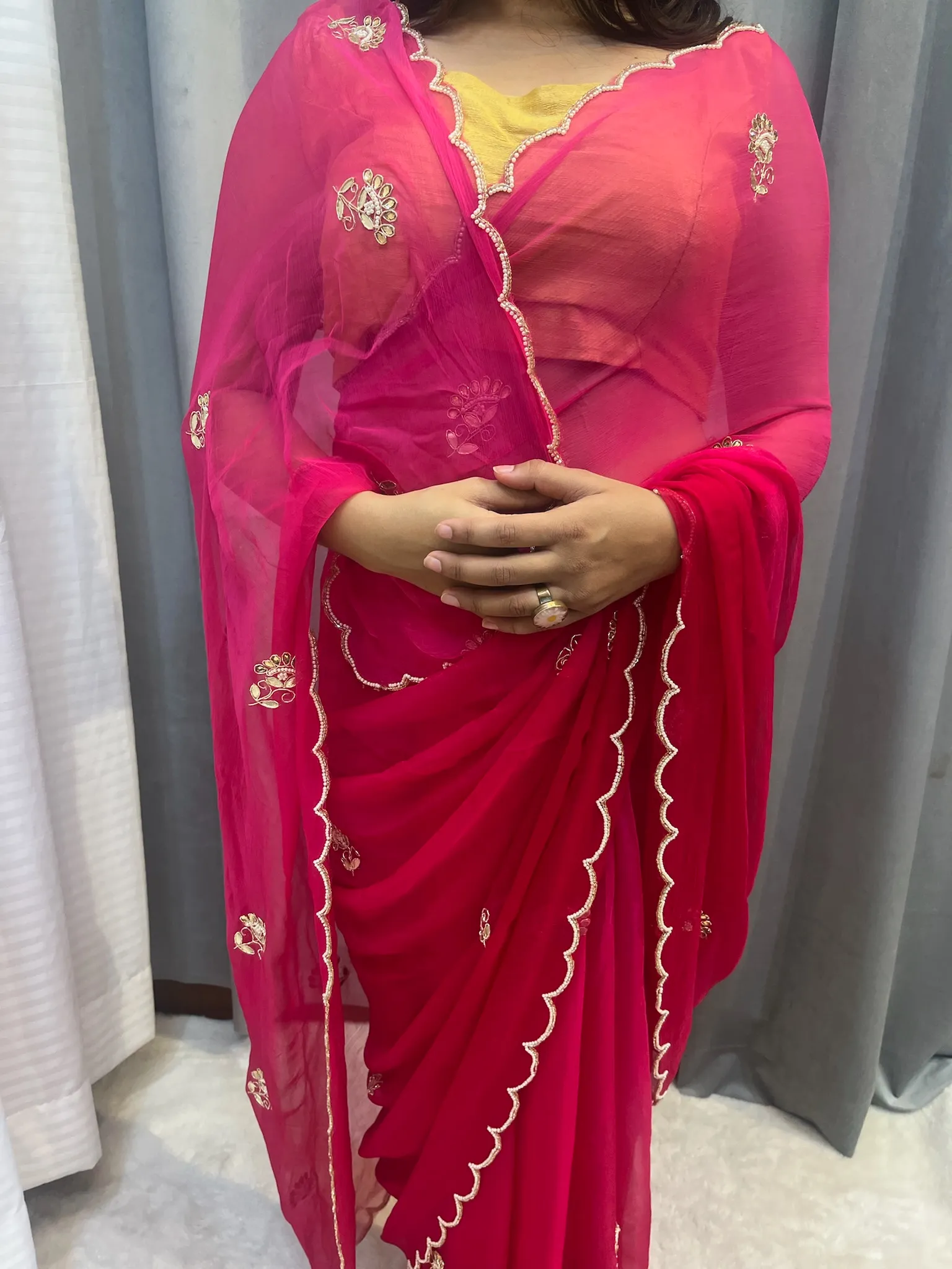 Style this pure chiffon designer saree with statement jewelry and heels to create a sophisticated and unforgettable look.