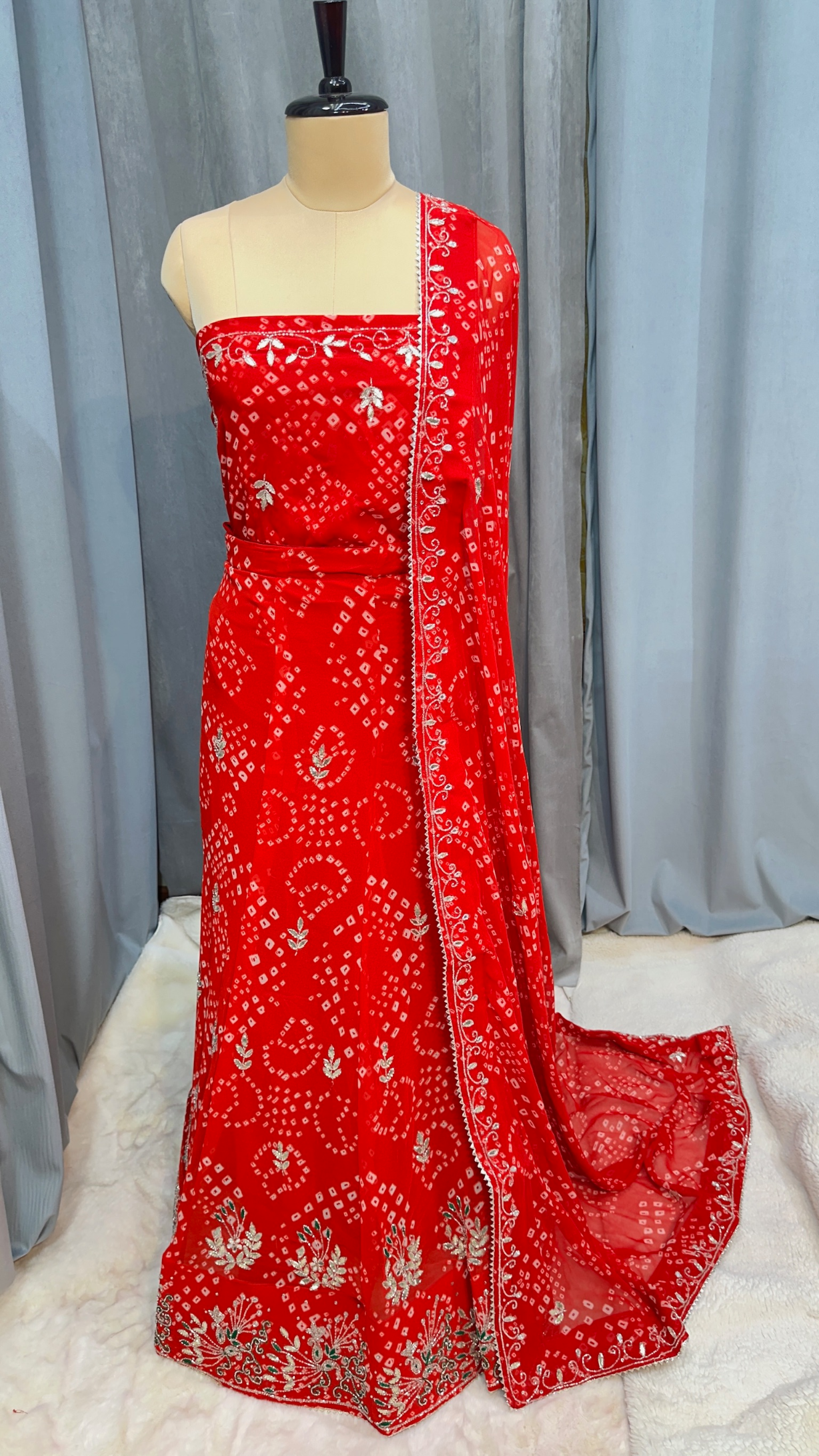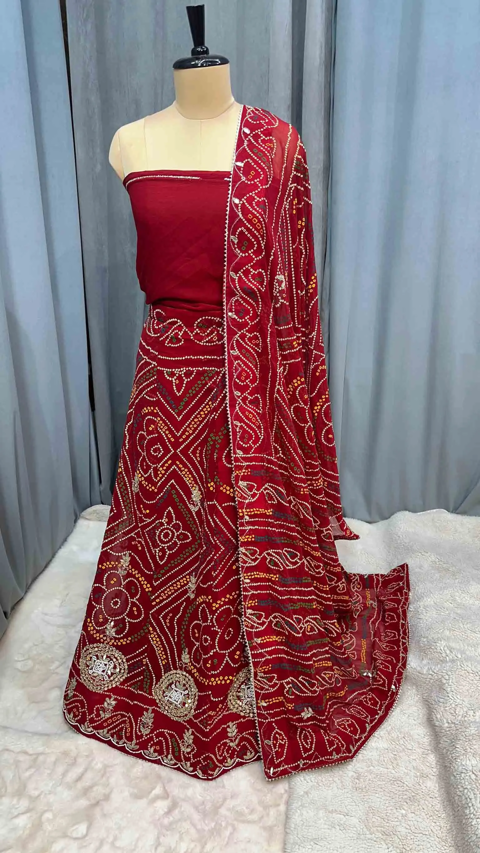 Elegant Bandhej Lehenga Chunni Set in Georgette with All-Over Handmade Kundan Patti & Moti Work – Festive & Bridal Wear
